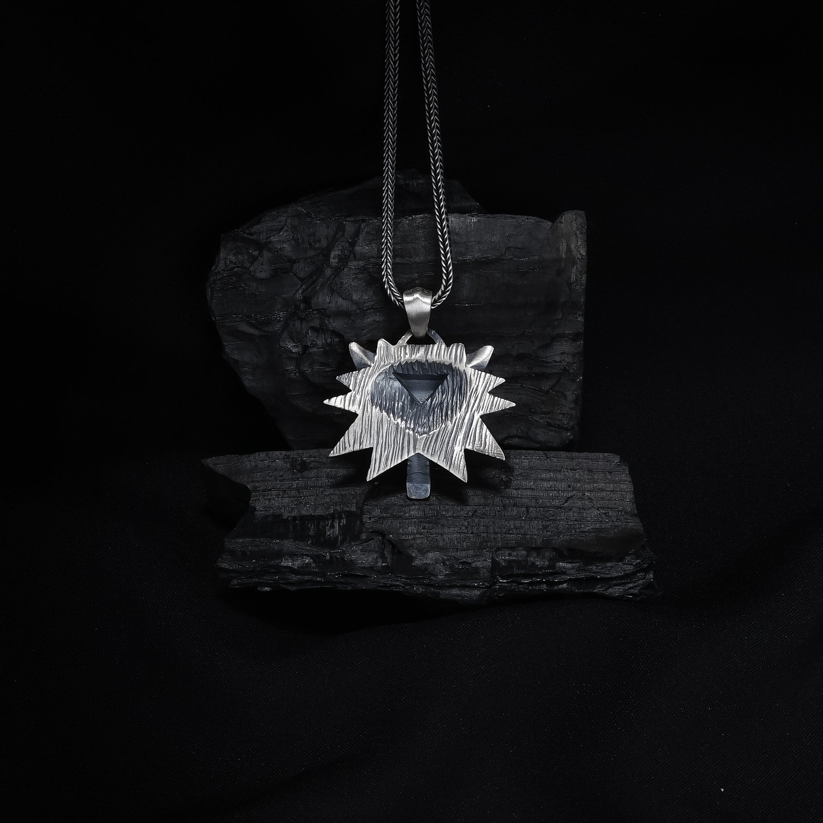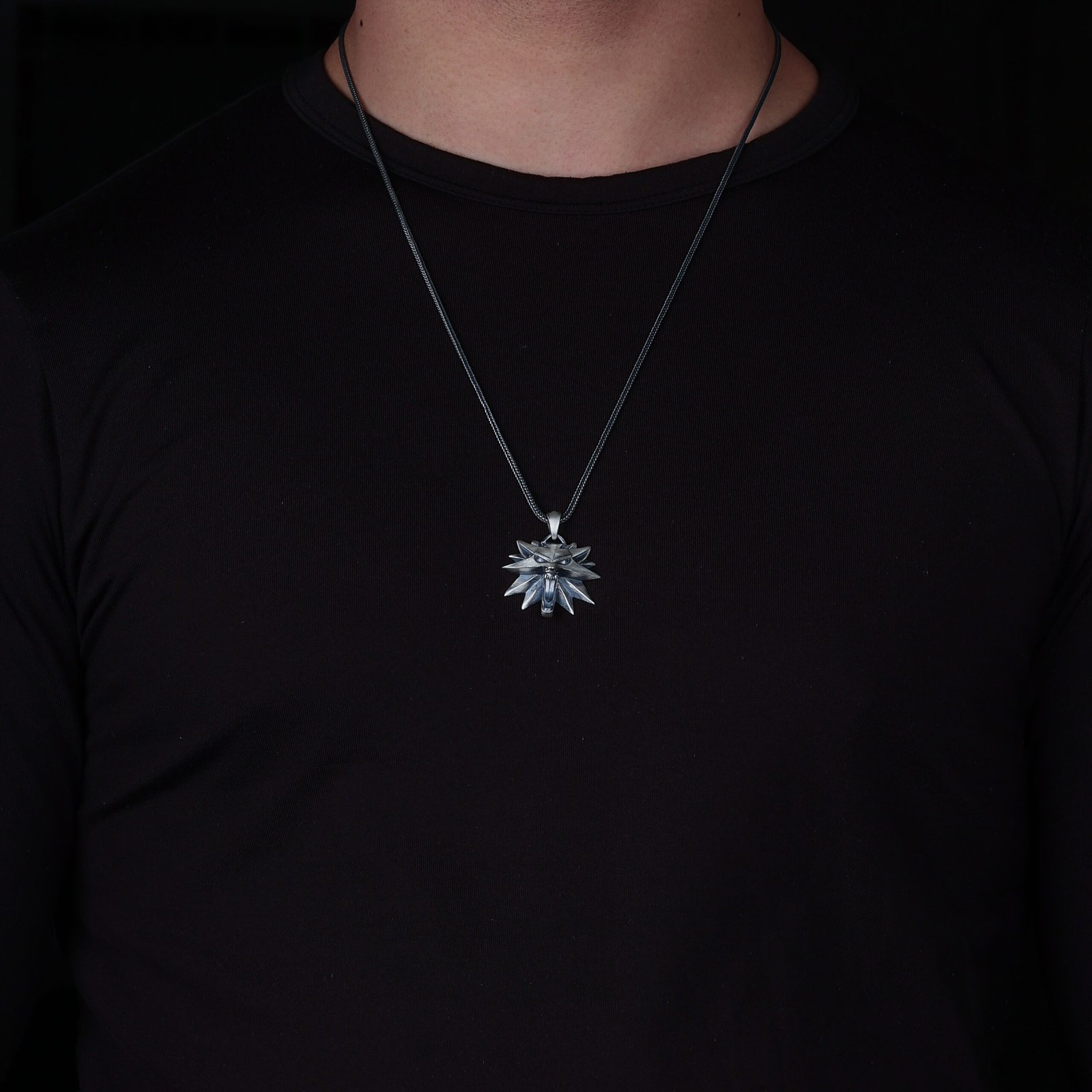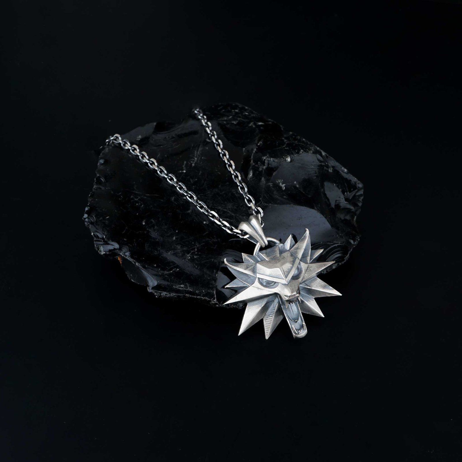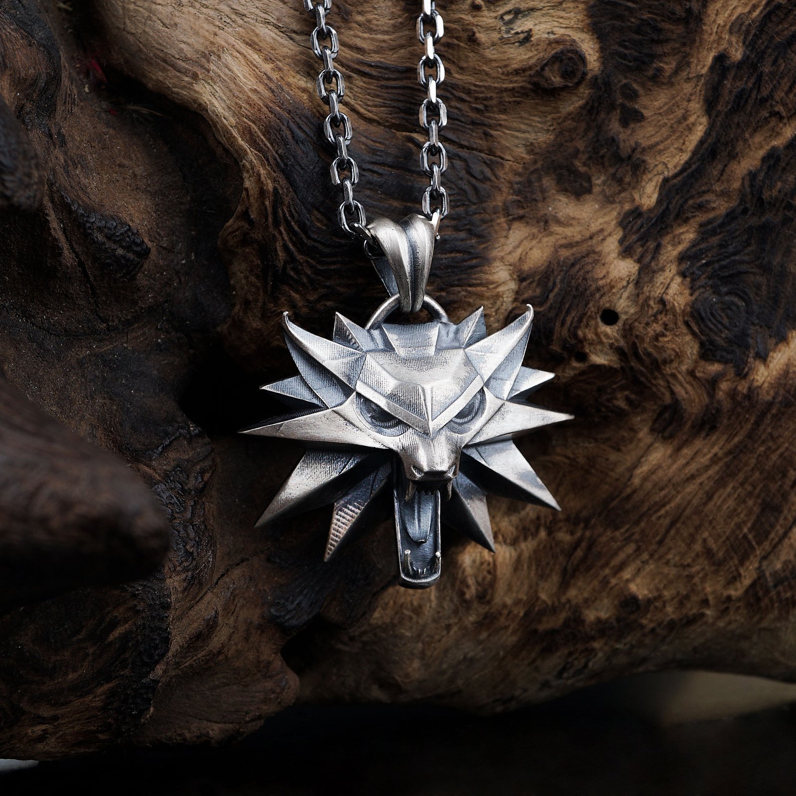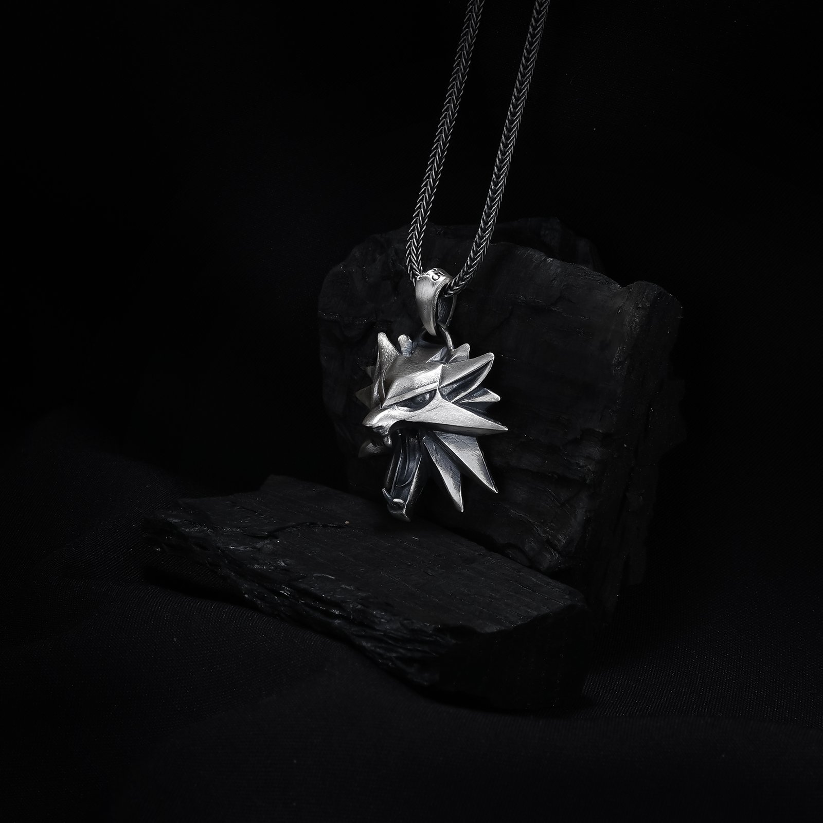 This 925 silver necklace features a sharp-edged 3D wolf head inspired by fantasy and warrior motifs. The sculpted geometric lines create a fierce and powerful expression. Its weighty structure and polished finish make it ideal for bold masculine styling. Perfect for fans of fantasy worlds and symbolic animal jewelry. A striking design representing strength, instinct, and leadership.
