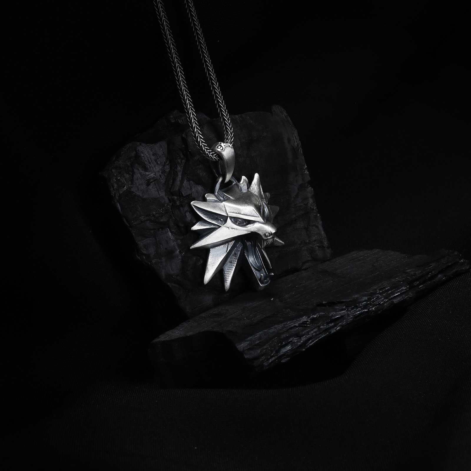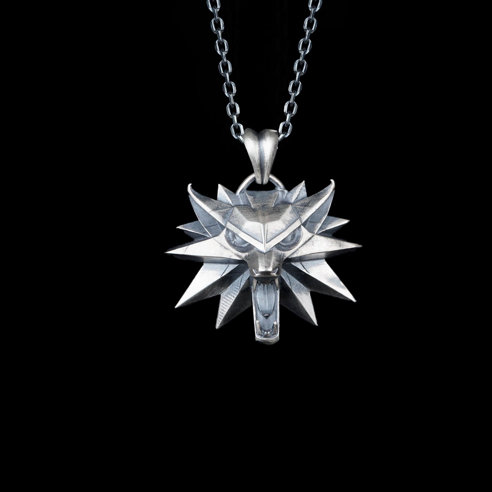 3D wolf head 925 silver necklace with sharp geometric details.