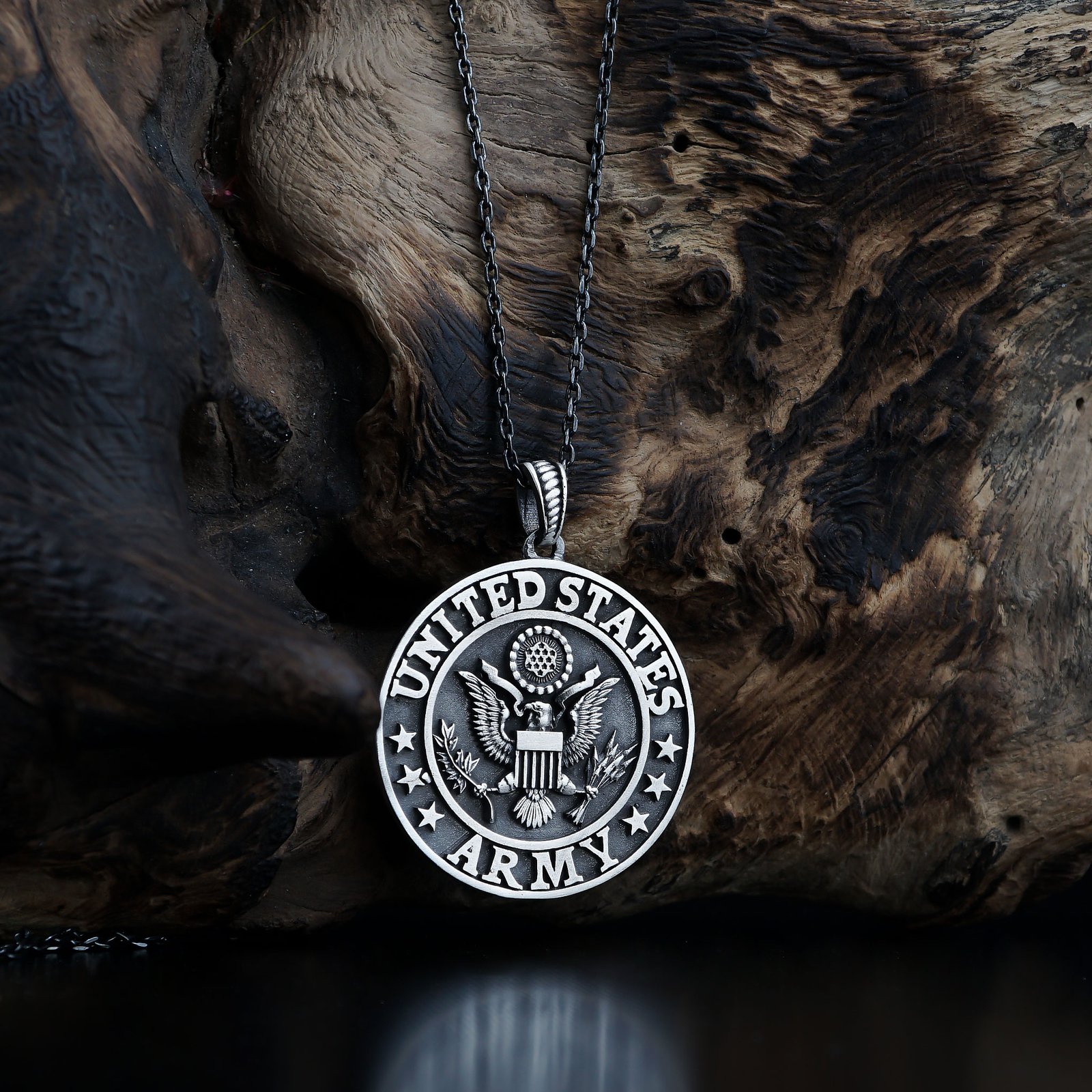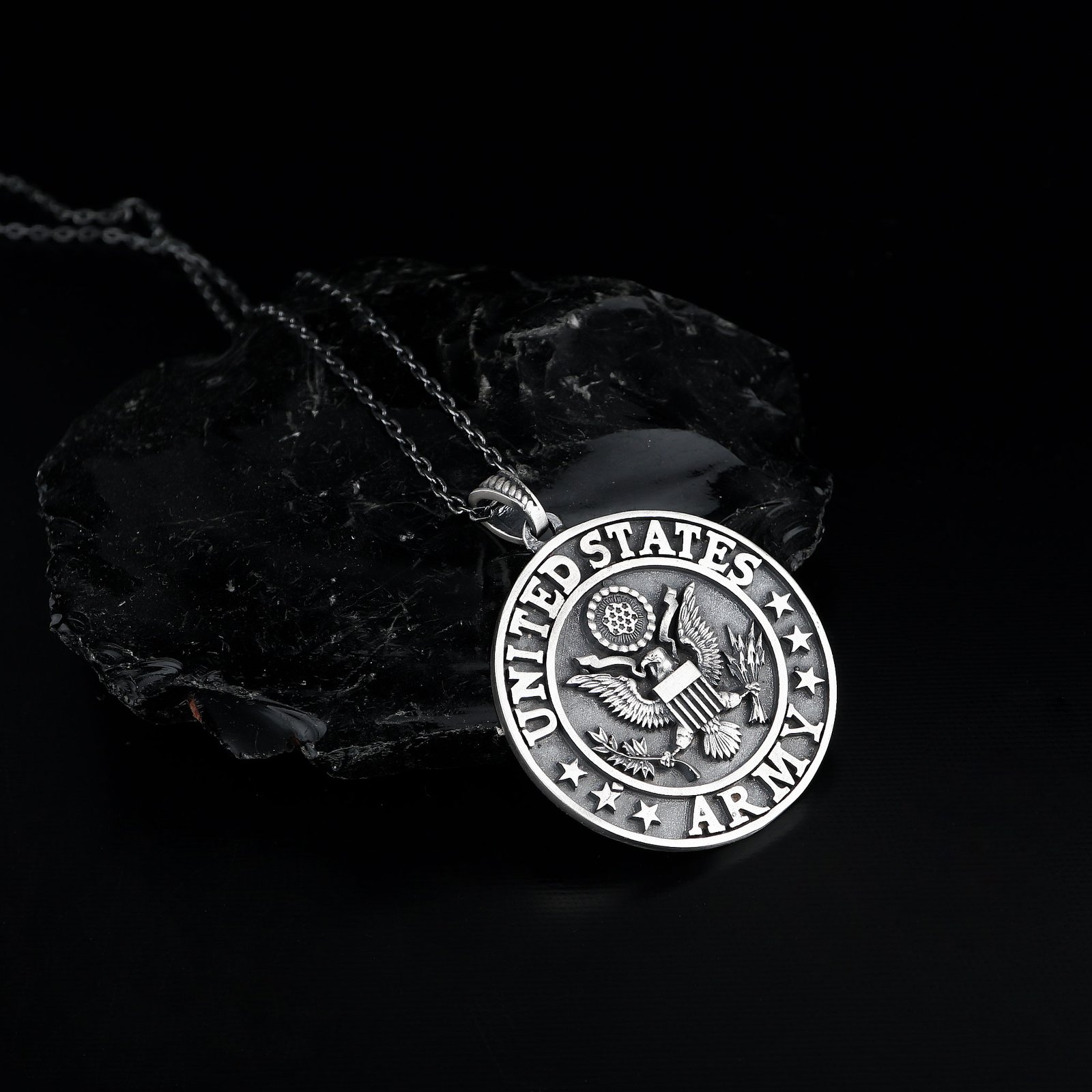 Antique silver army eagle emblem men’s necklace symbolizing honor and strength.