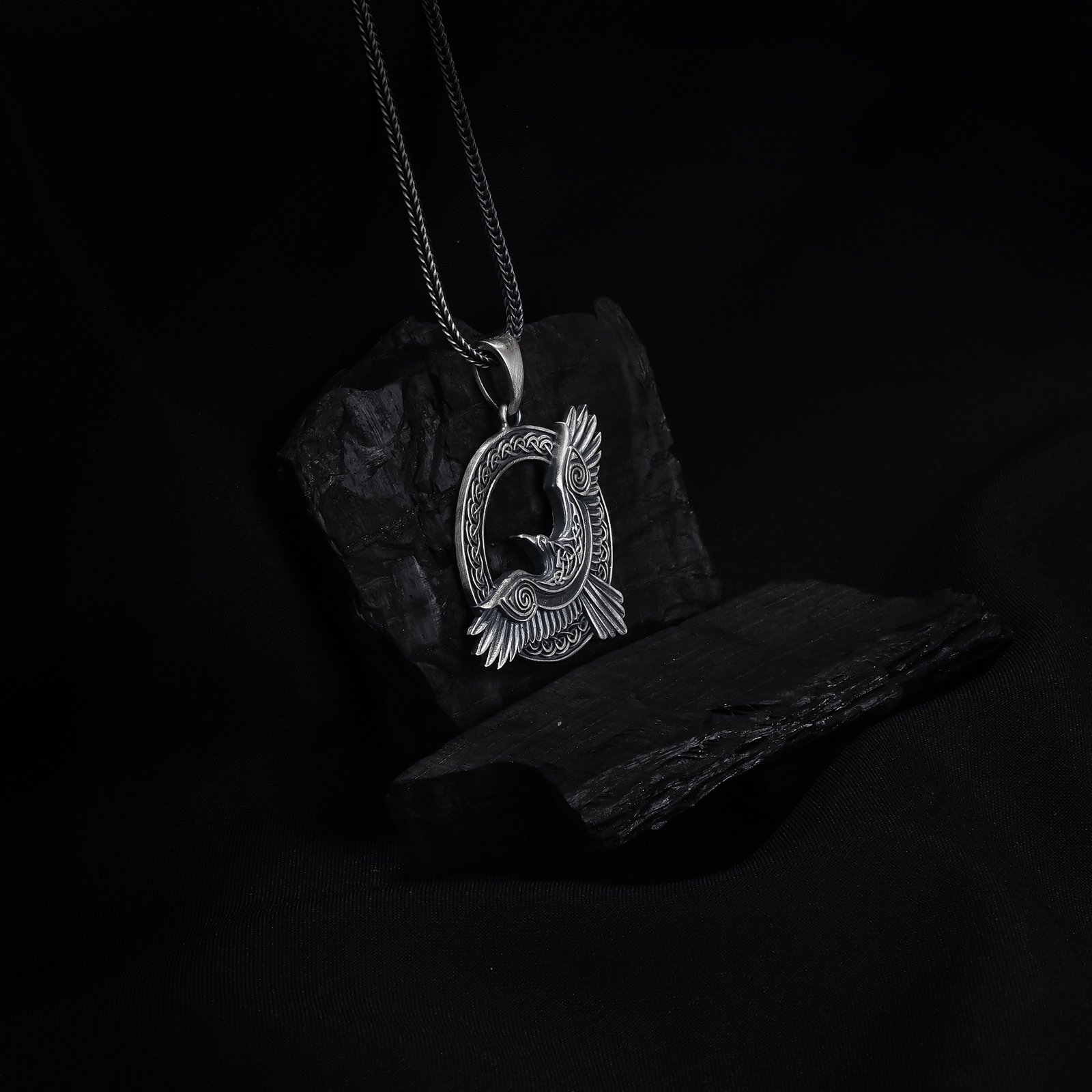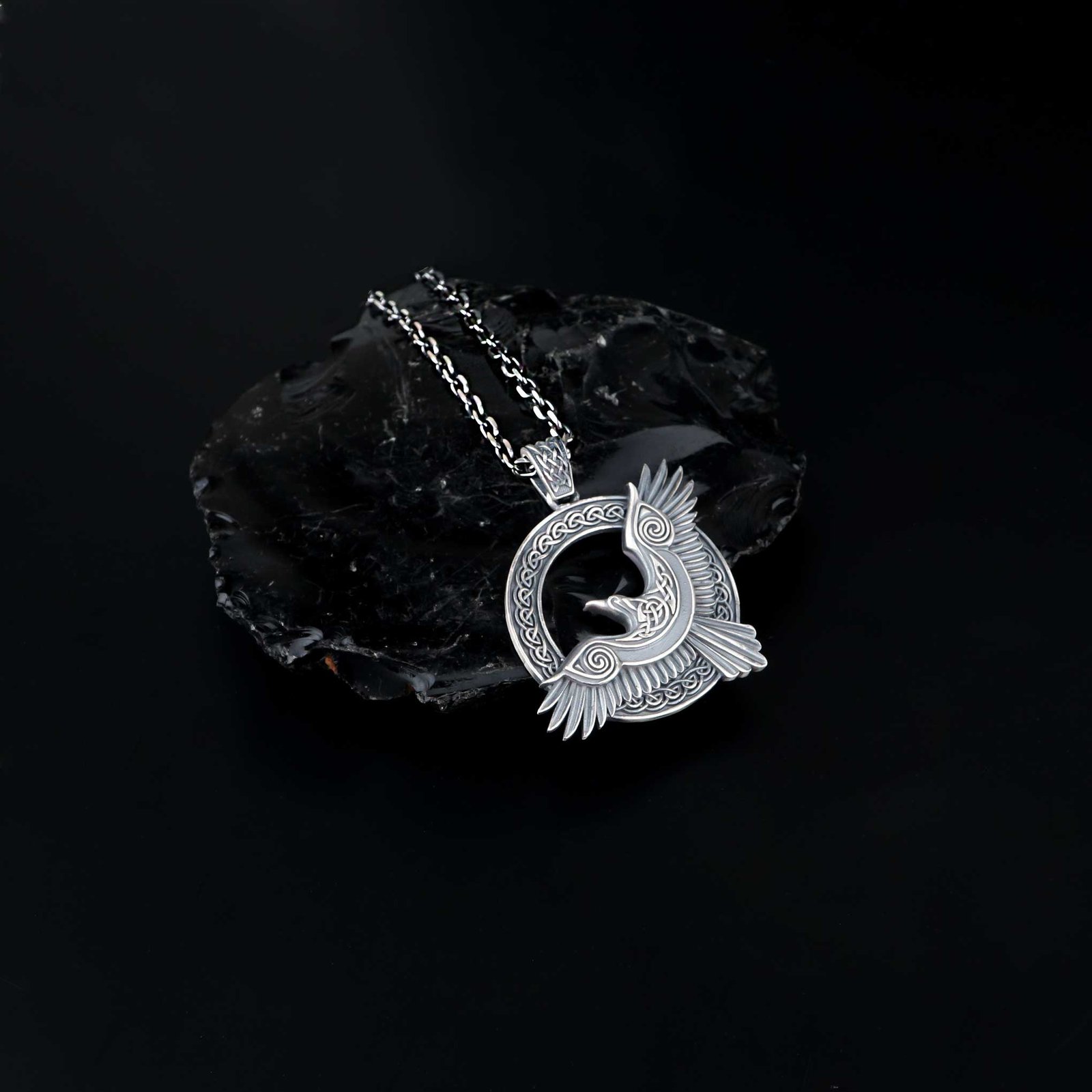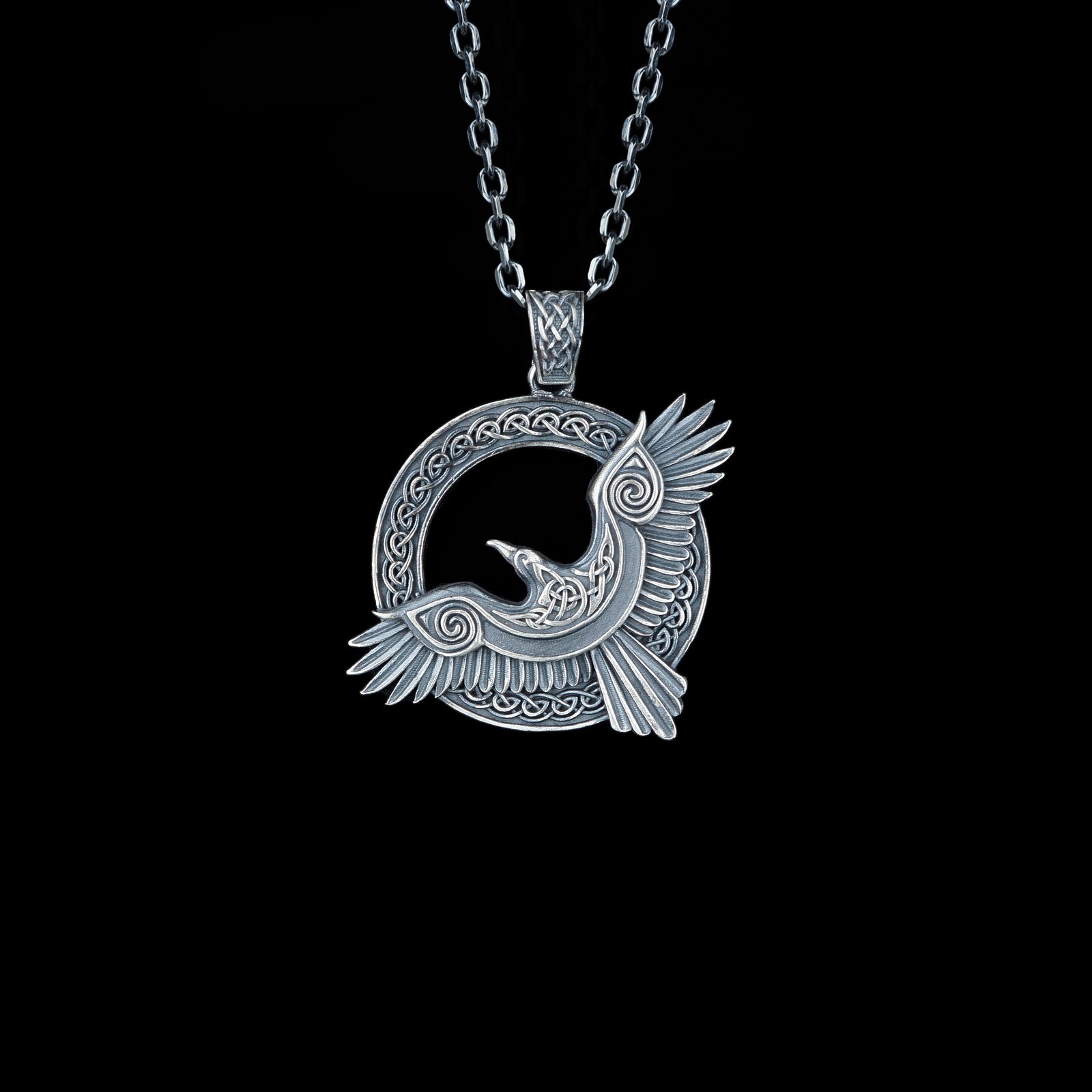 Celtic-style raven 925 silver necklace with intricate knot patterns.