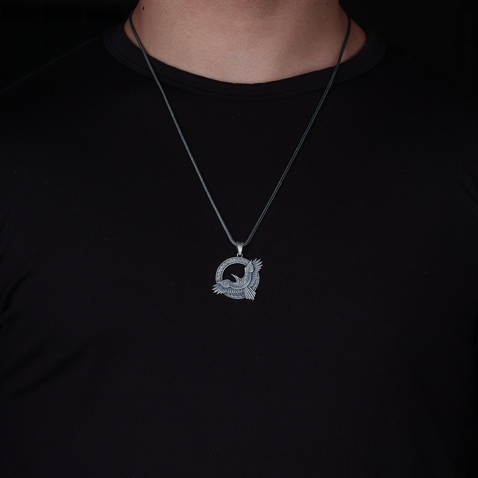 This handcrafted 925 silver necklace features a raven in mid-flight set inside a detailed Celtic knotwork circle. The intricate patterns highlight Norse and Celtic symbolism associated with wisdom, mystery, and spiritual guidance. The polished and oxidized contrast adds depth to the artwork. Ideal for men who appreciate cultural and mythological themes. A striking symbolic accessory with artisan detail.