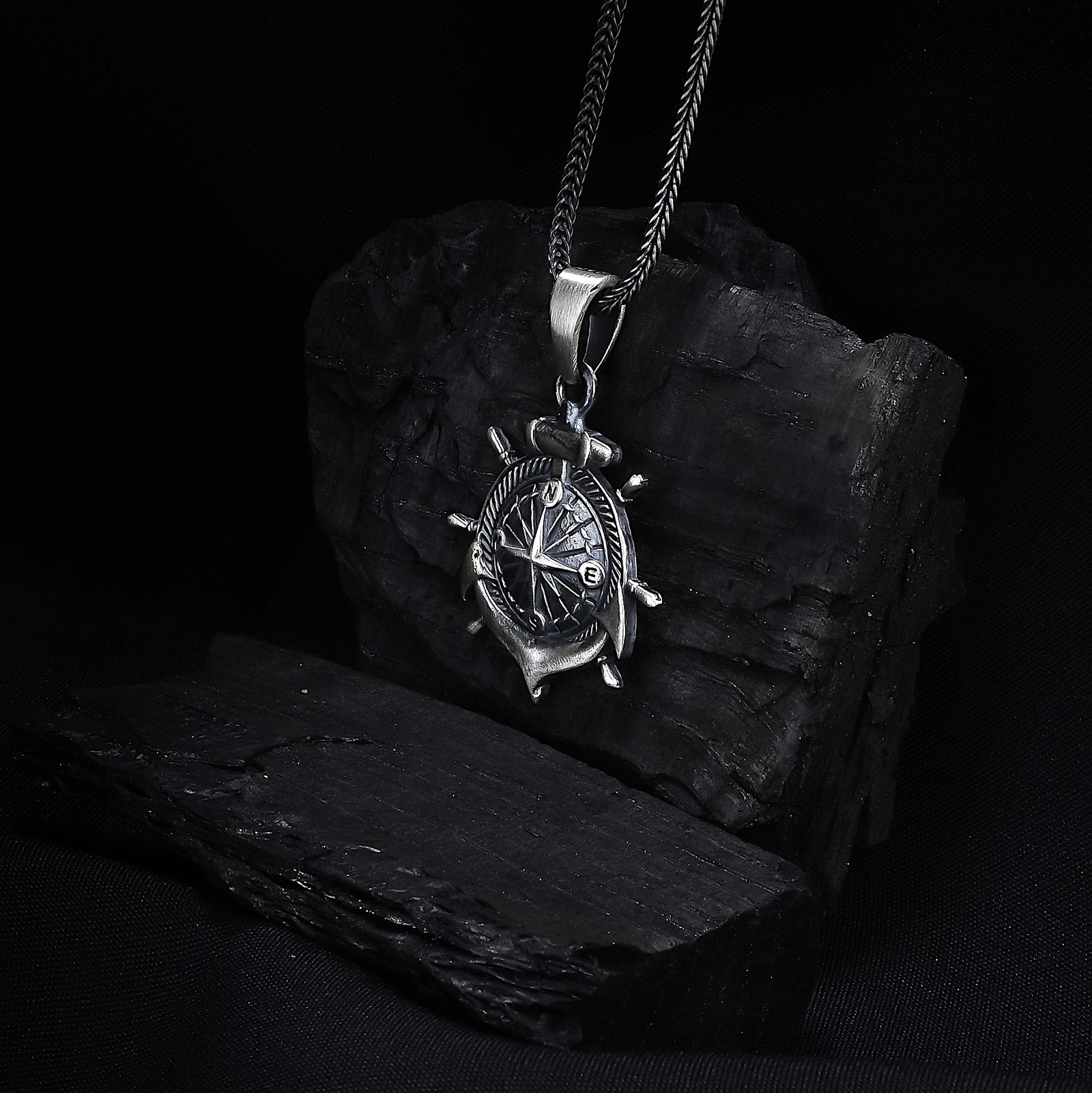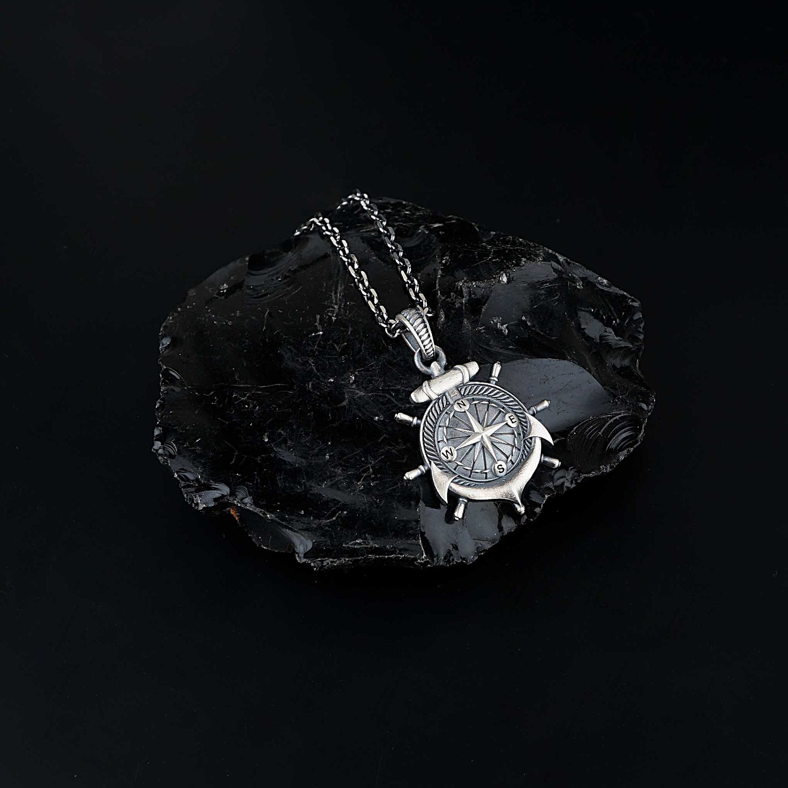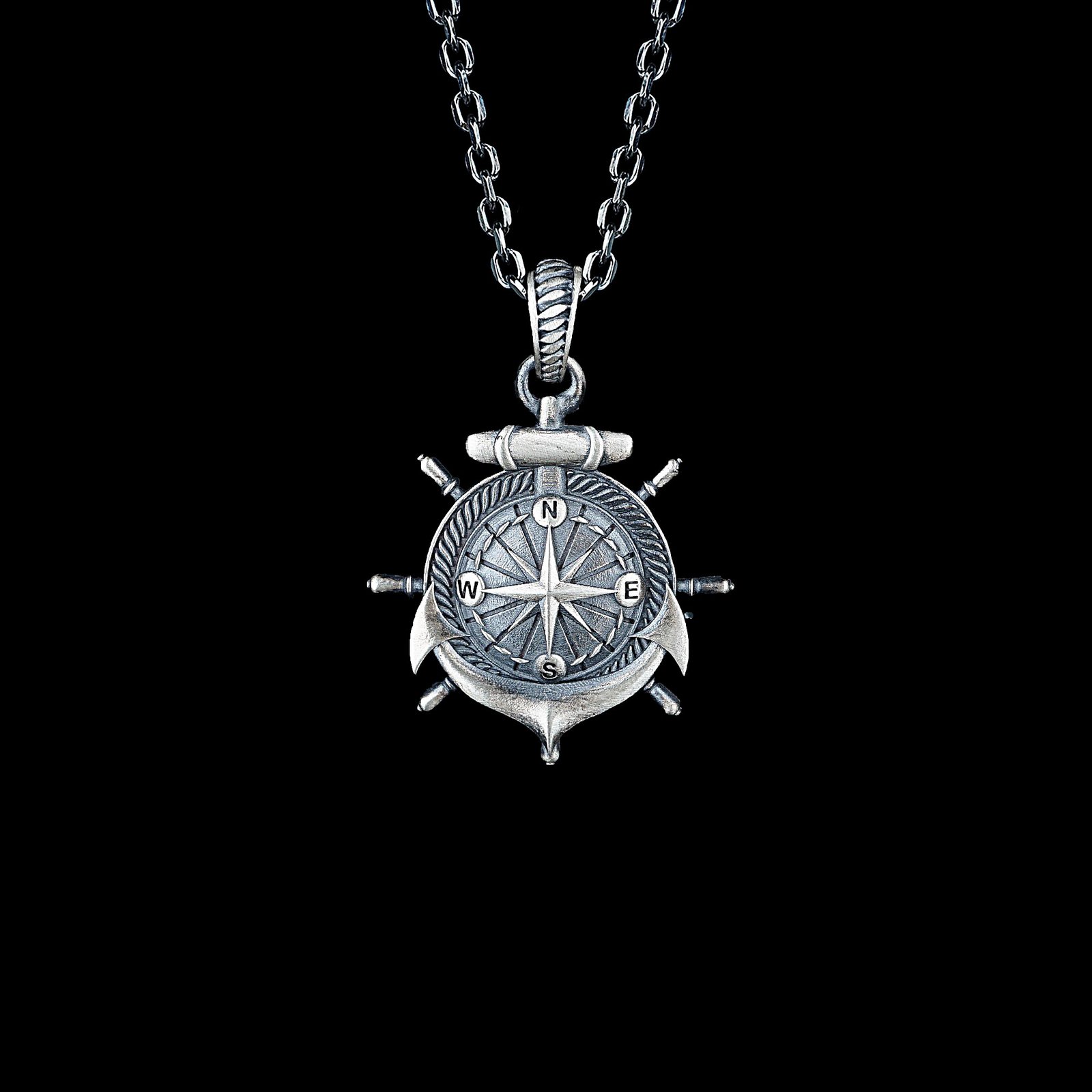 This sterling silver necklace features a detailed compass set within a ship’s steering wheel, symbolizing direction, adventure, and fearless exploration. The intricate engravings highlight the maritime theme, giving the piece a rugged and adventurous character. Its antique finish enhances the craftsmanship, making it ideal for travelers and free-spirited individuals. Designed for daily wear, it blends symbolism with bold style. A meaningful accessory representing guidance and the courage to navigate life’s journey.