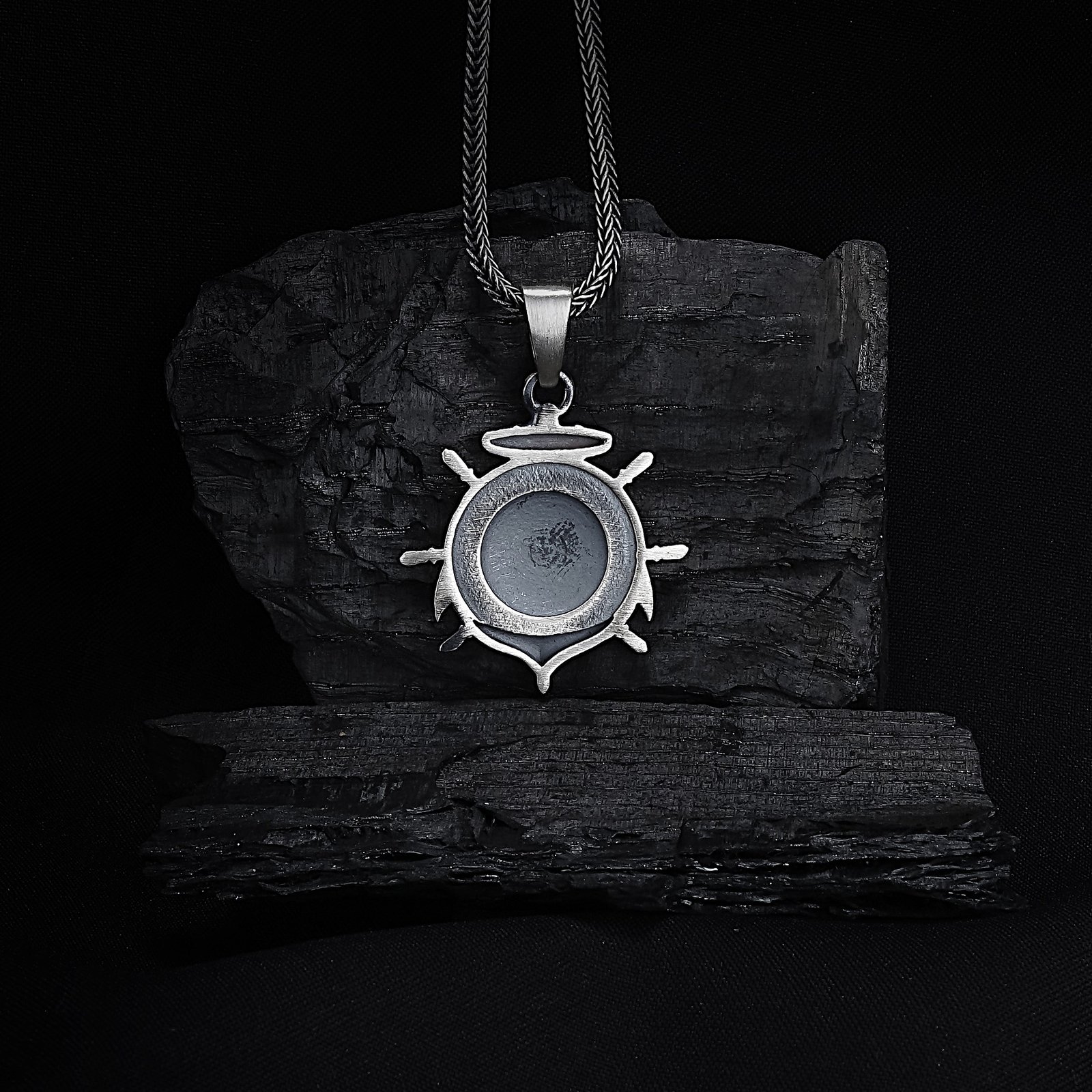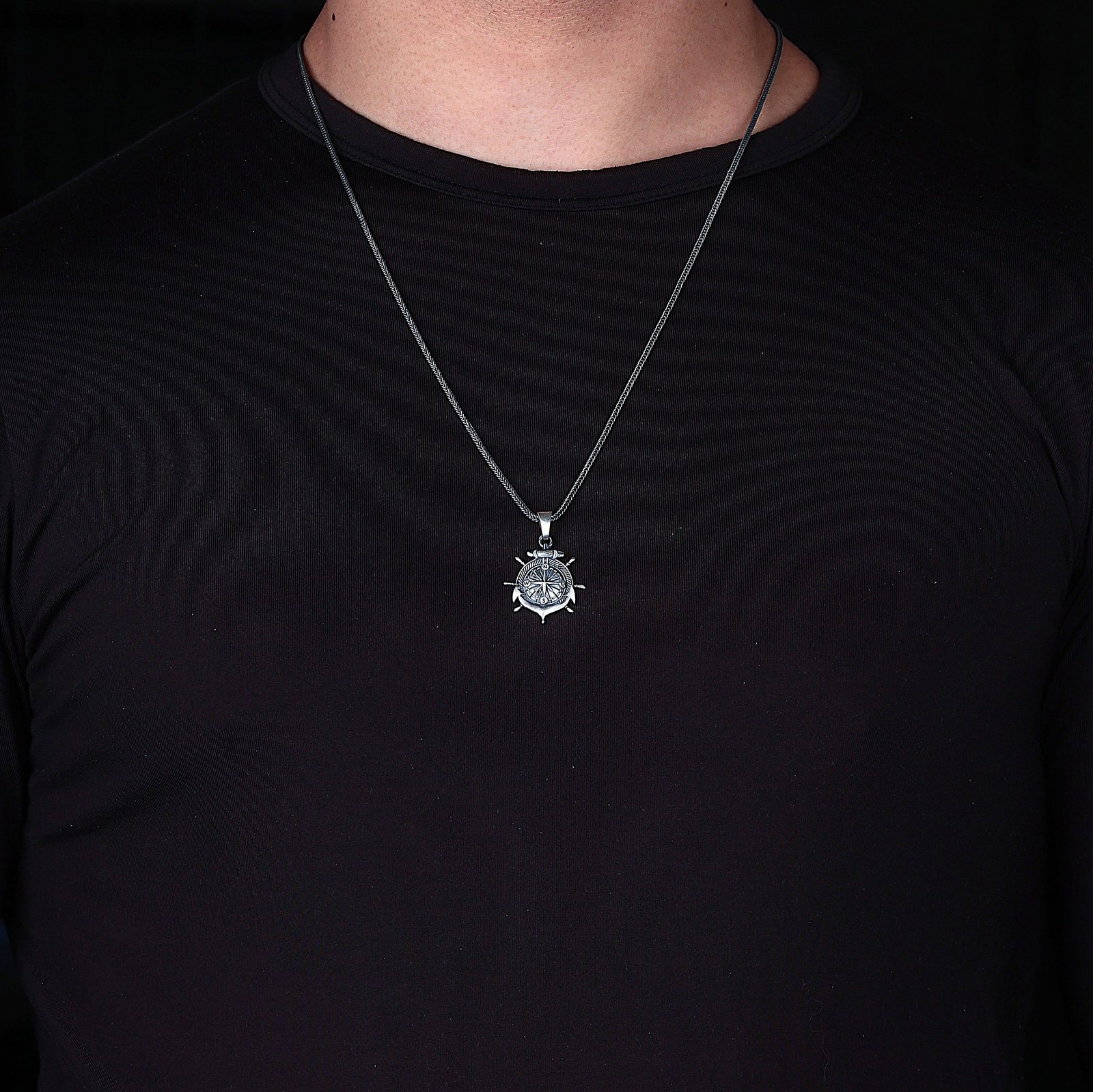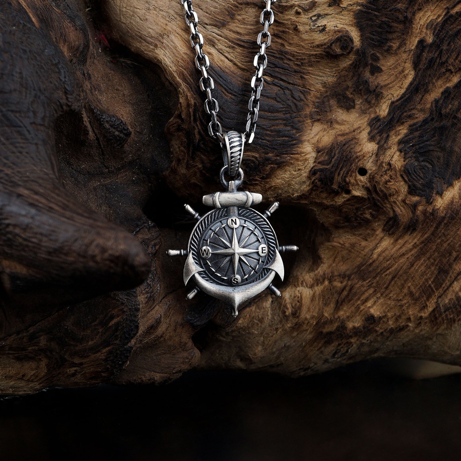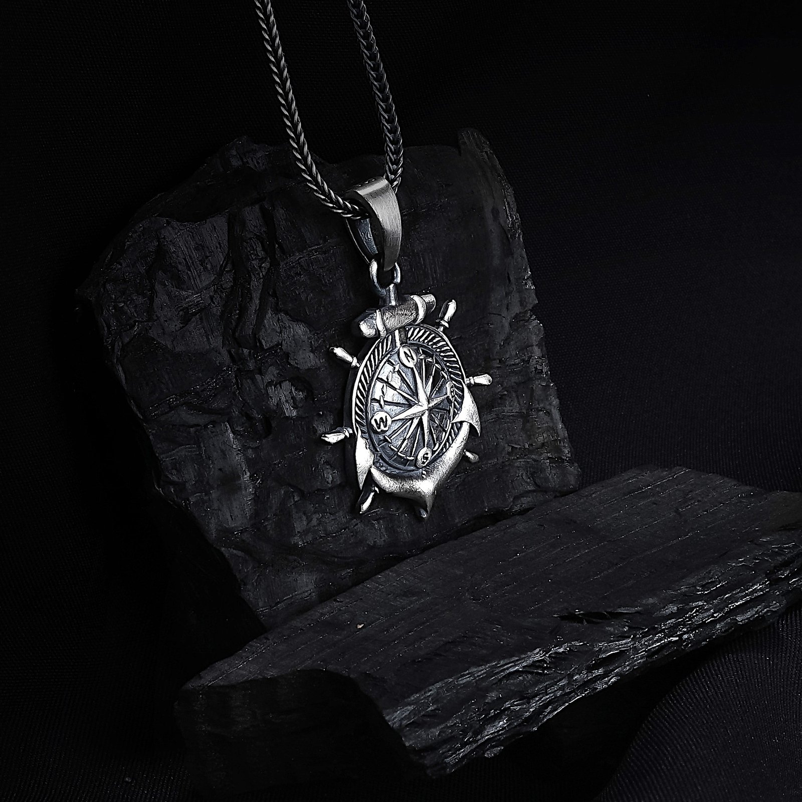This sterling silver necklace features a detailed compass set within a ship’s steering wheel, symbolizing direction, adventure, and fearless exploration. The intricate engravings highlight the maritime theme, giving the piece a rugged and adventurous character. Its antique finish enhances the craftsmanship, making it ideal for travelers and free-spirited individuals. Designed for daily wear, it blends symbolism with bold style. A meaningful accessory representing guidance and the courage to navigate life’s journey.