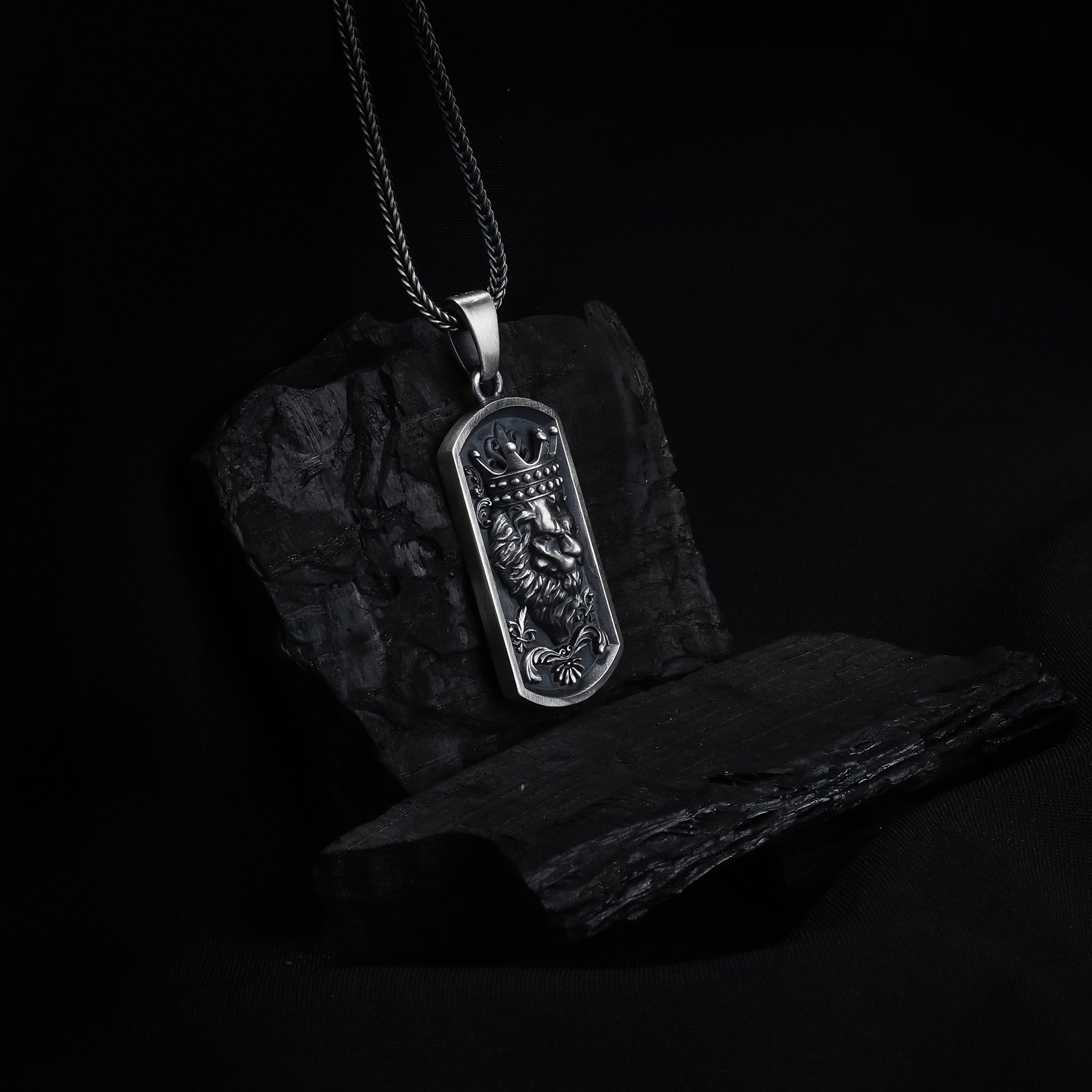 Antique silver crowned lion men’s necklace symbolizing leadership and authority.