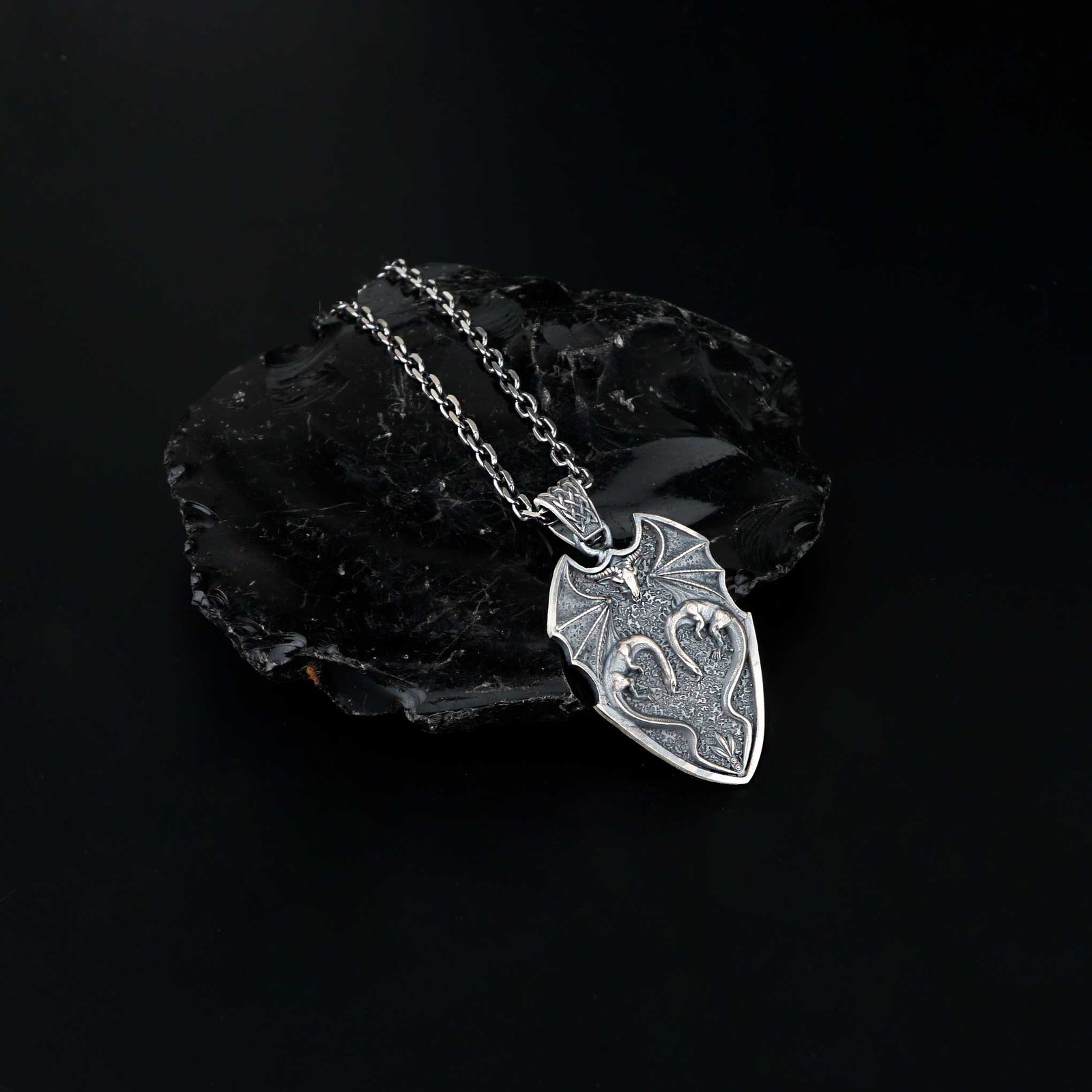 This 925 silver necklace features a shield pendant engraved with two facing dragons and a detailed winged top. The textured background enhances the medieval and fantasy aesthetic. Its strong warrior symbolism appeals to fans of heroic and mythical designs. The sturdy chain matches the bold appearance of the pendant. A perfect piece for men drawn to fantasy themes and dragon motifs.