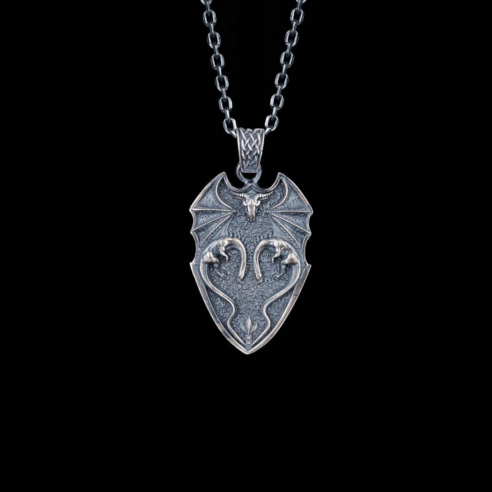 Double-Head Dragon Shield Sterling Silver Necklace