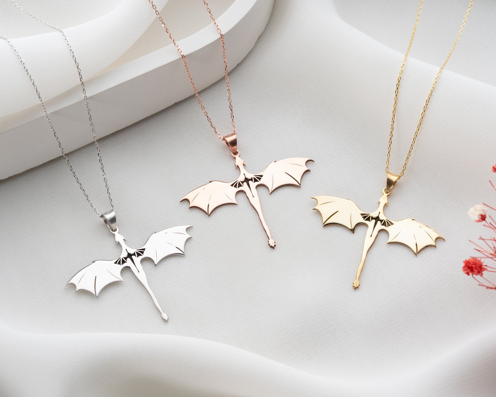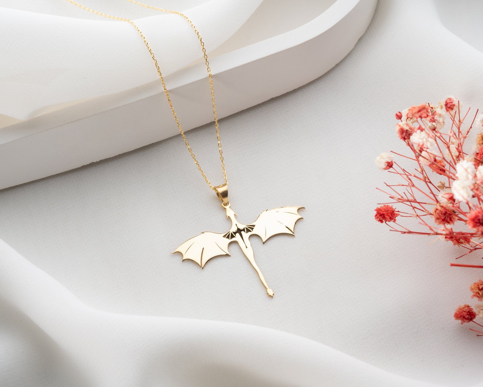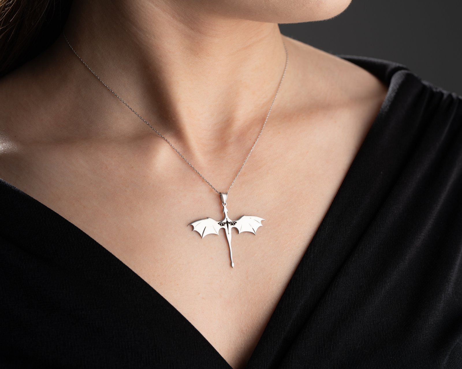 This dragon silhouette necklace offers a bold, fantasy-inspired design with clean modern lines.