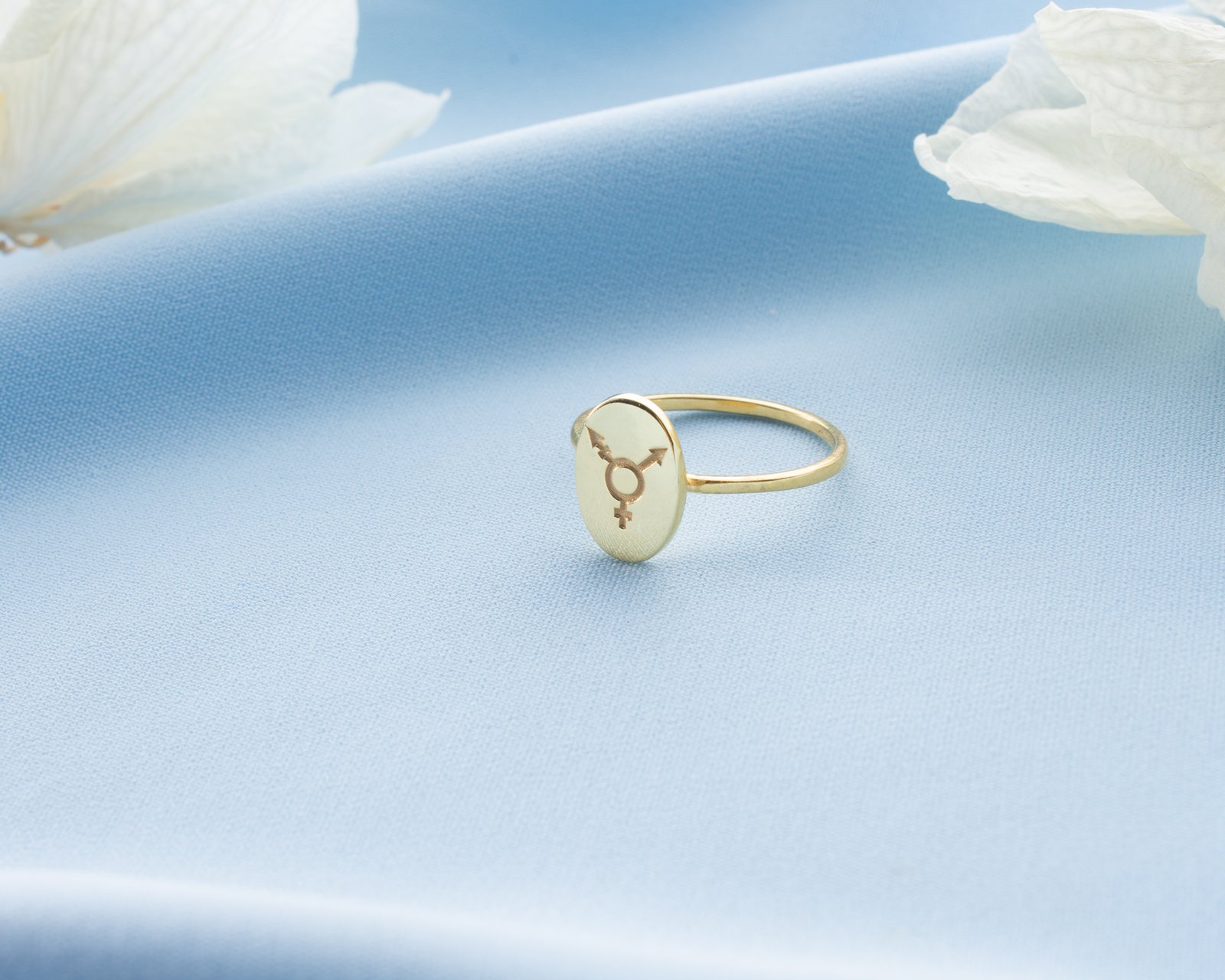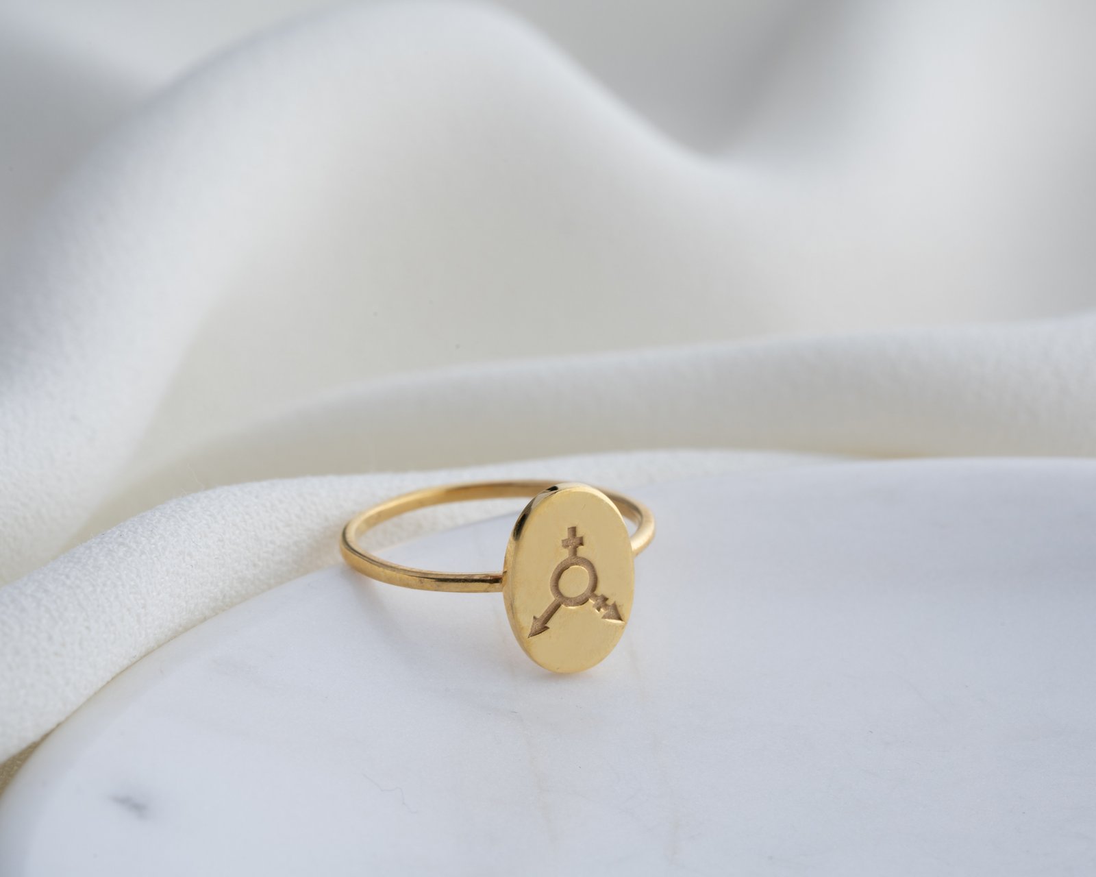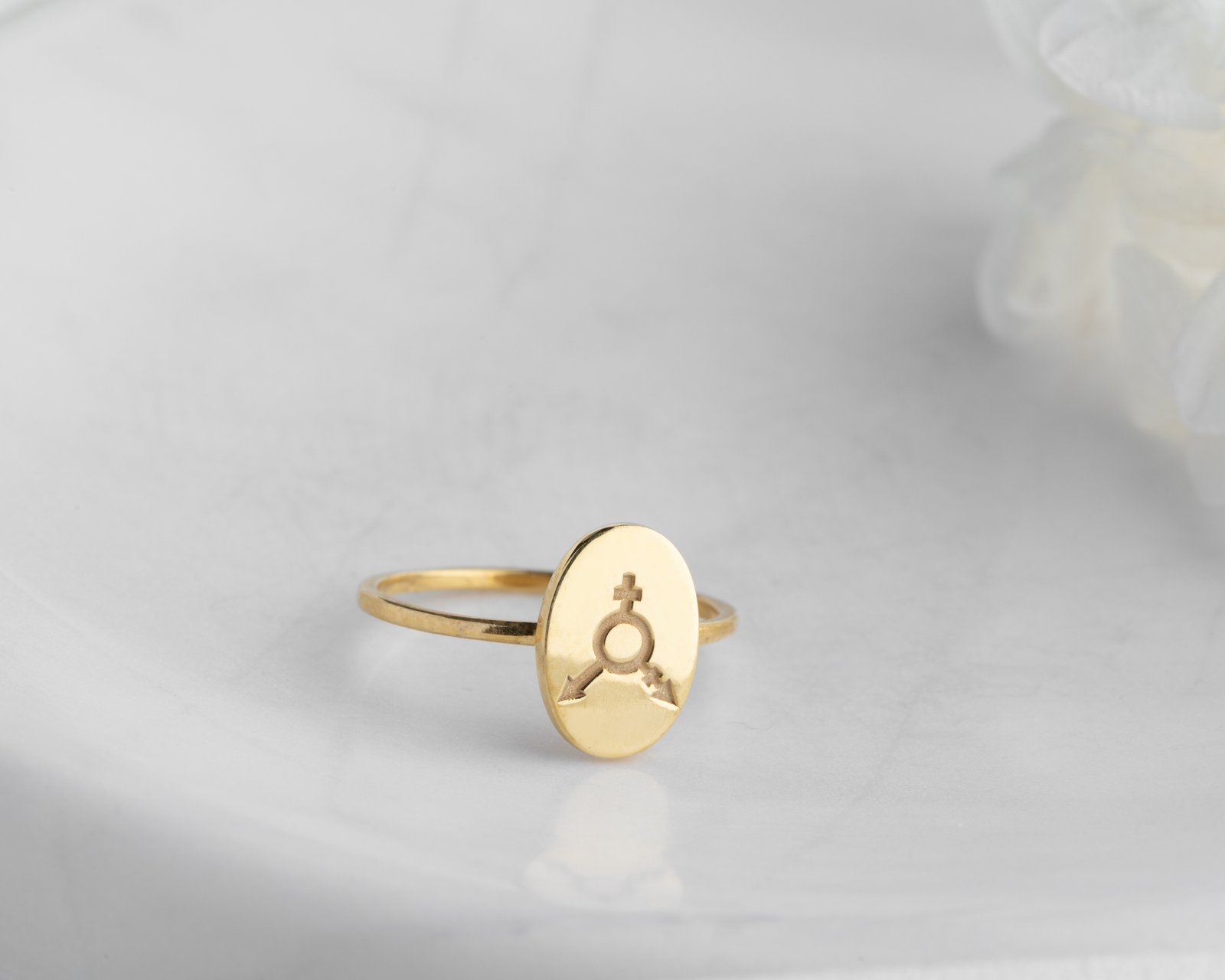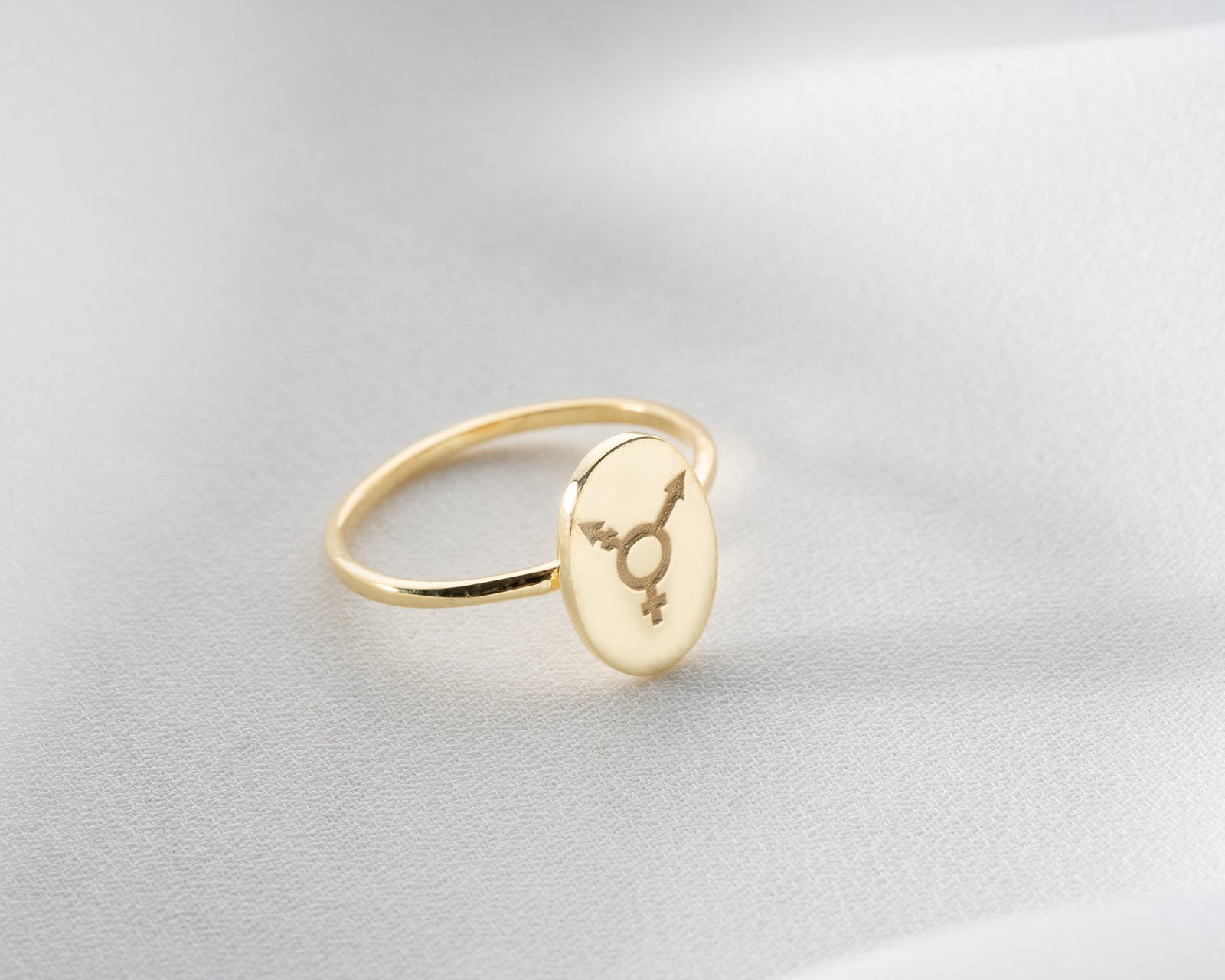 Gold-plated oval signet ring with engraved inclusive gender symbols.