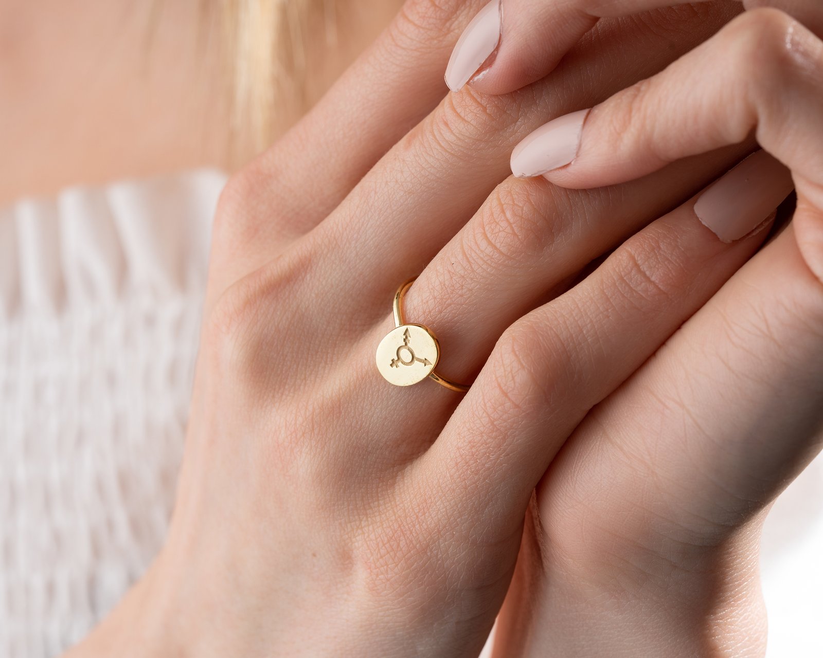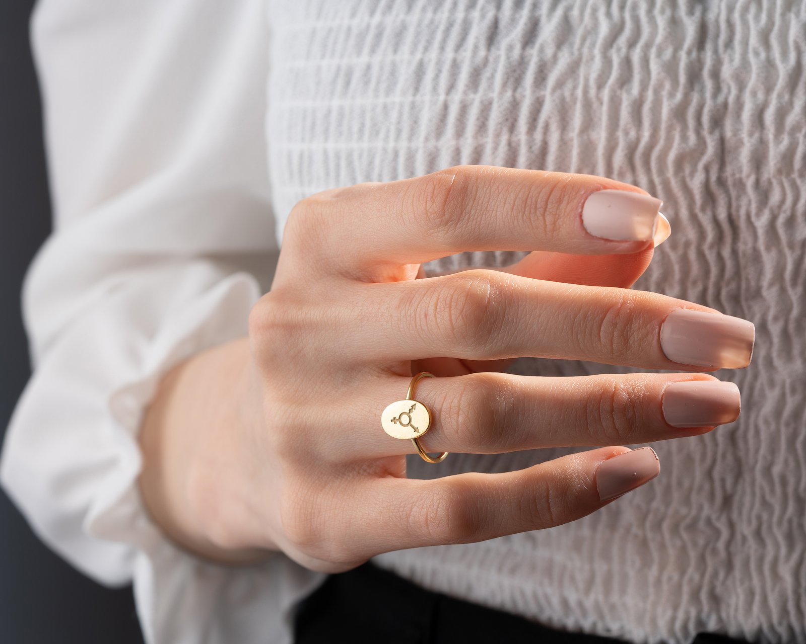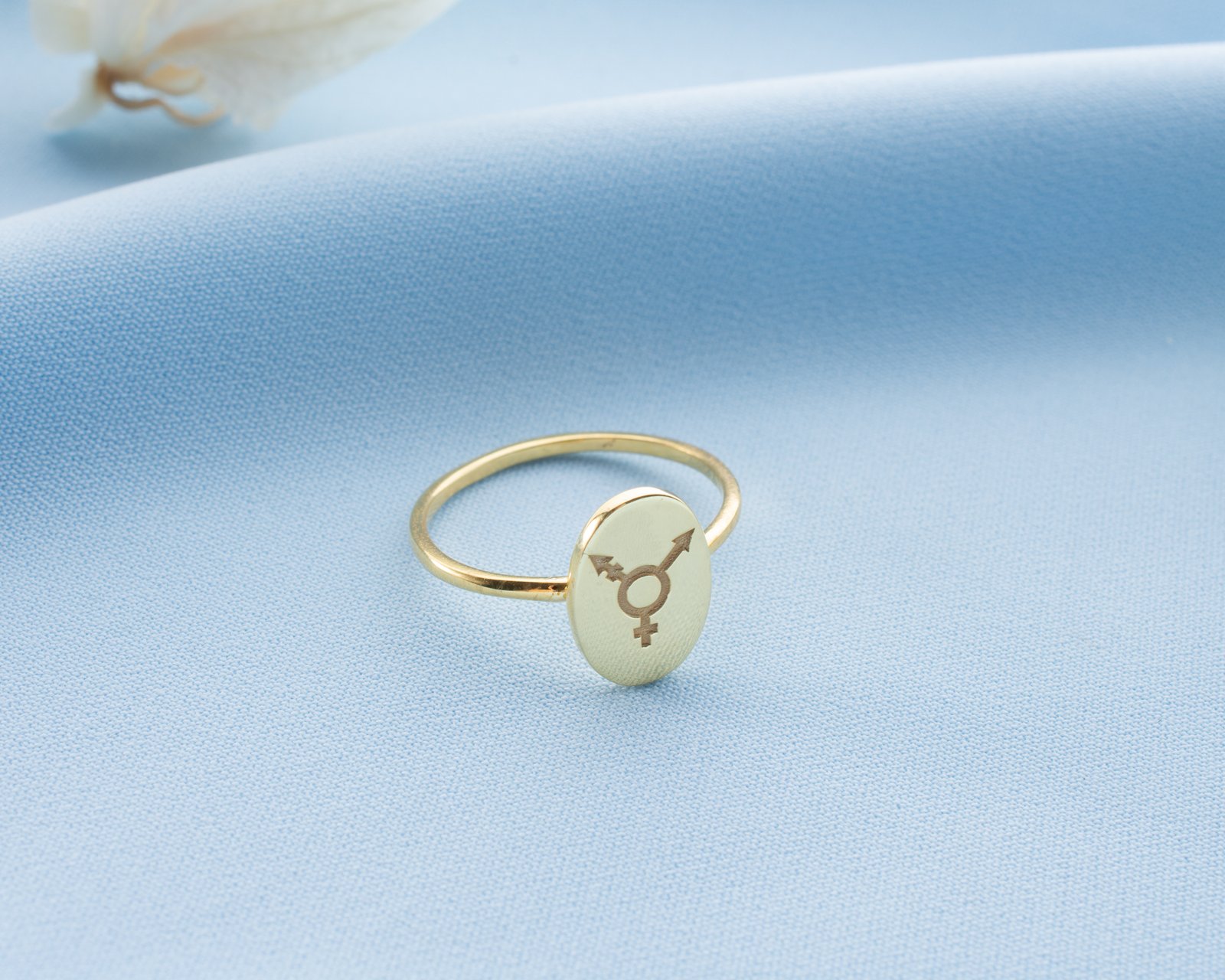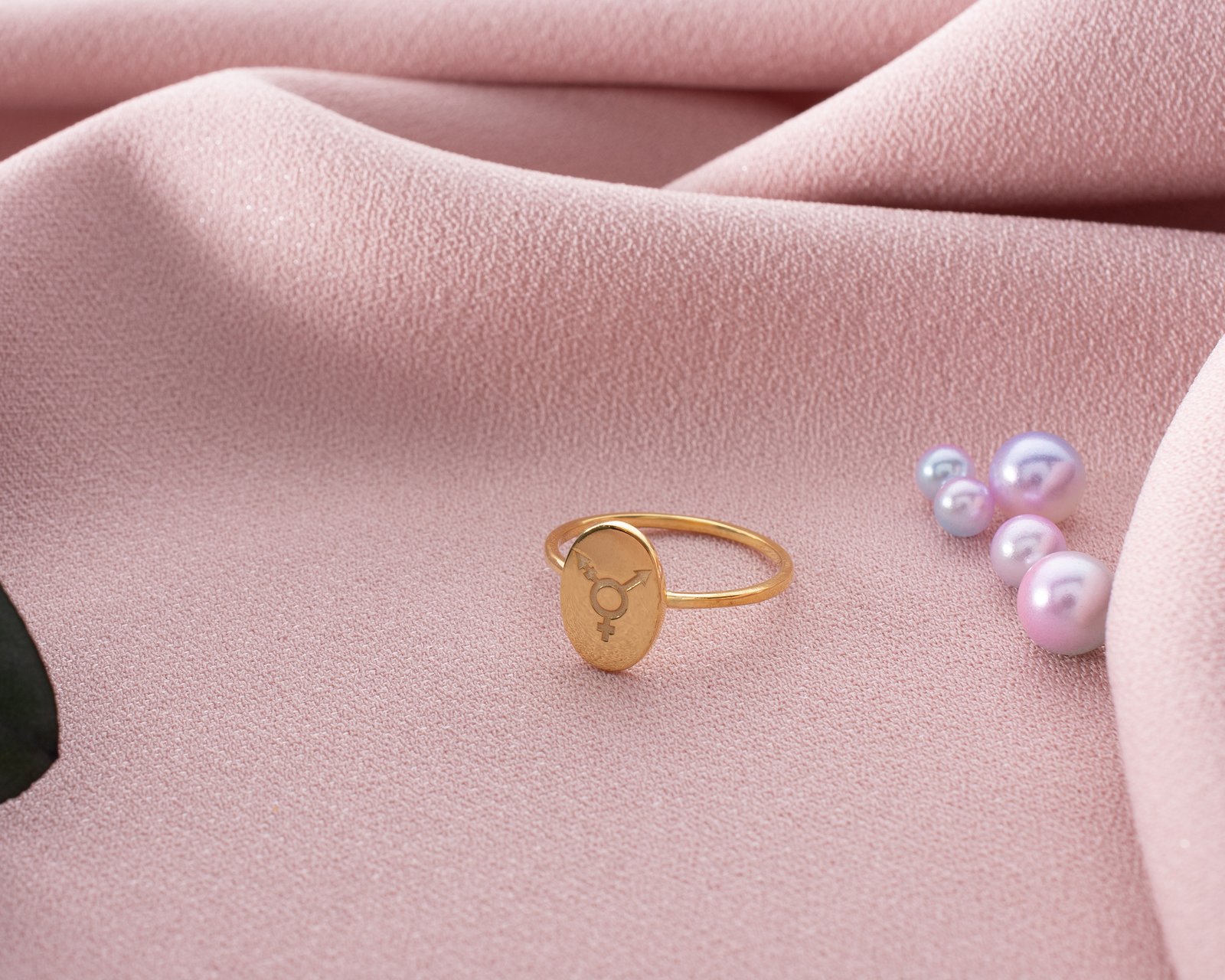 Gold-plated oval signet ring with engraved inclusive gender symbols.