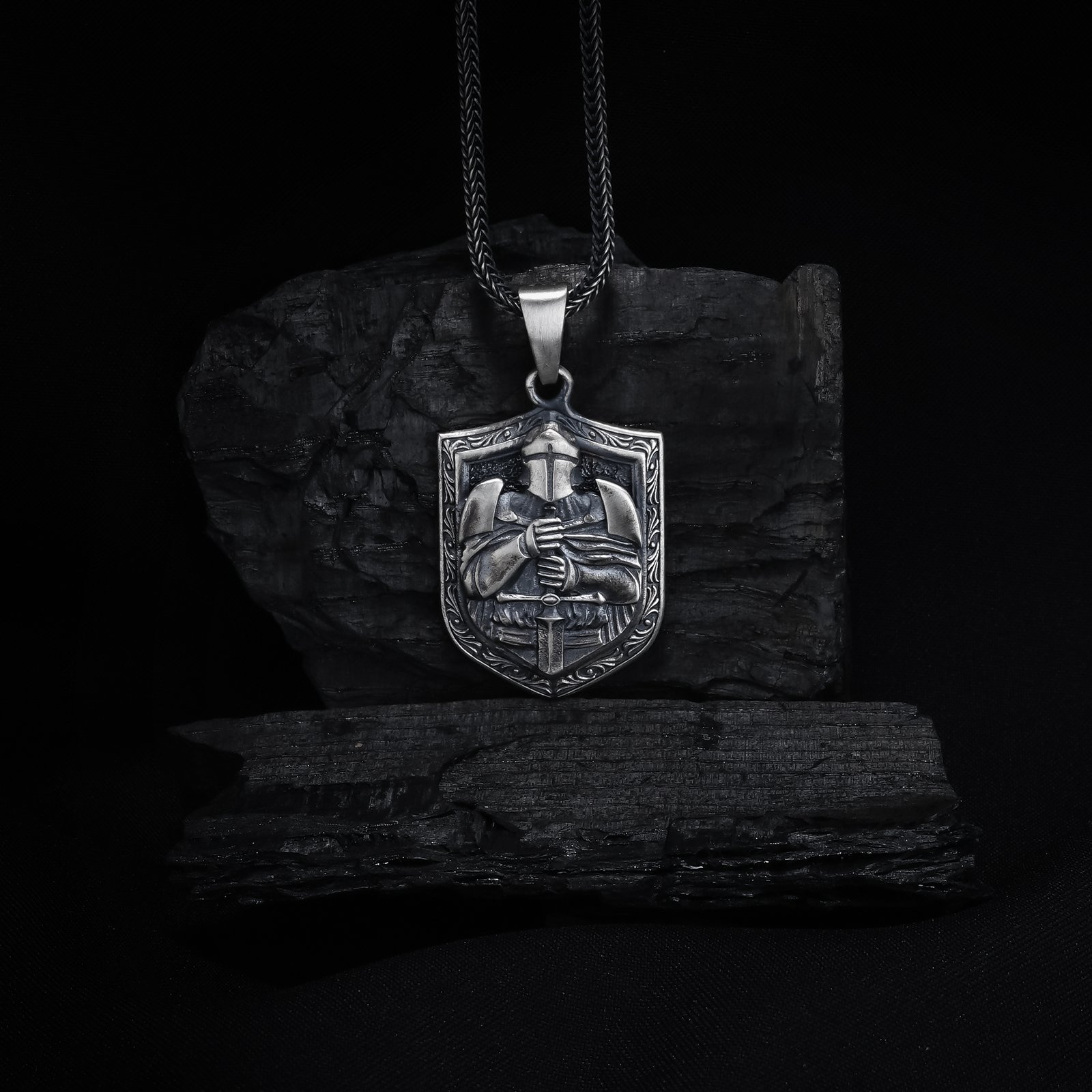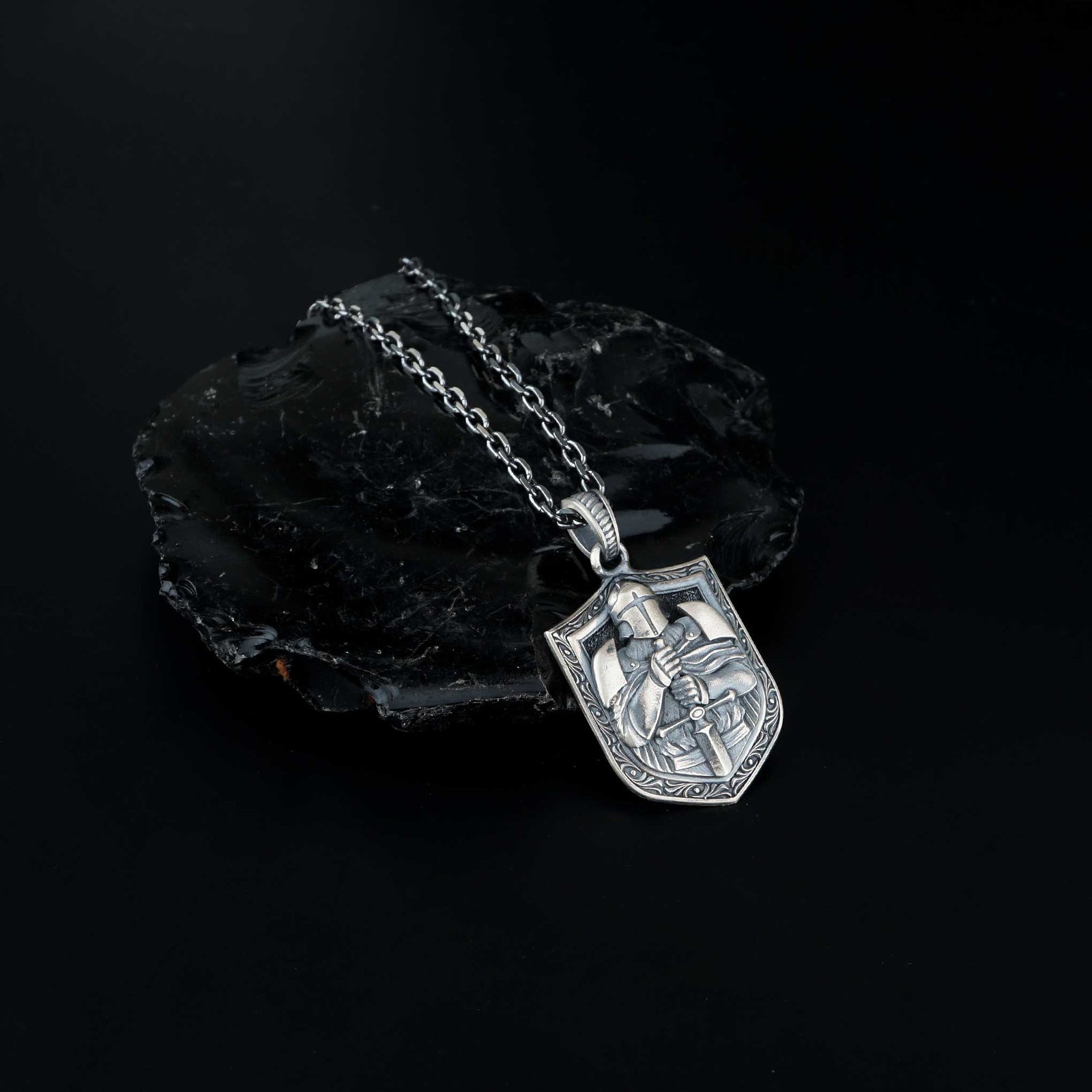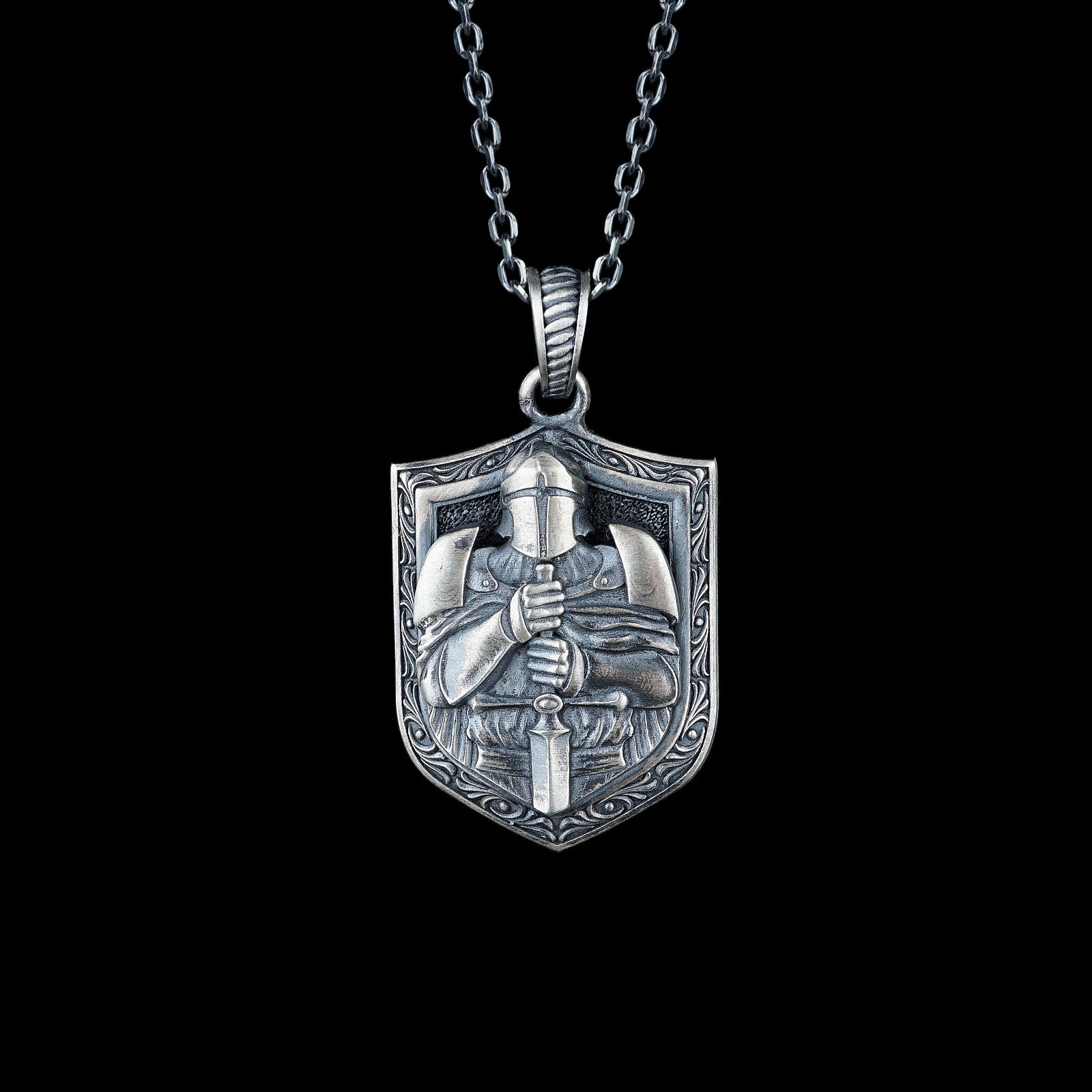 Sterling silver knight shield necklace with detailed medieval warrior design.
