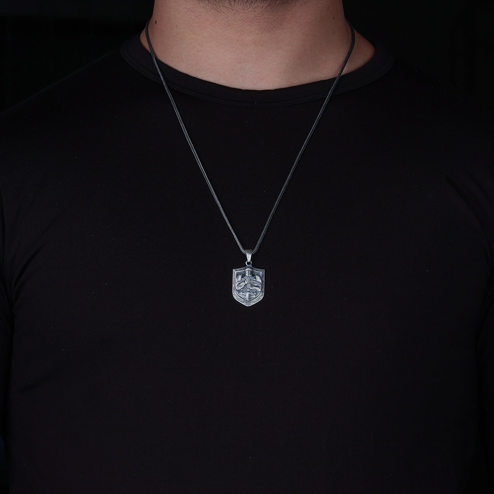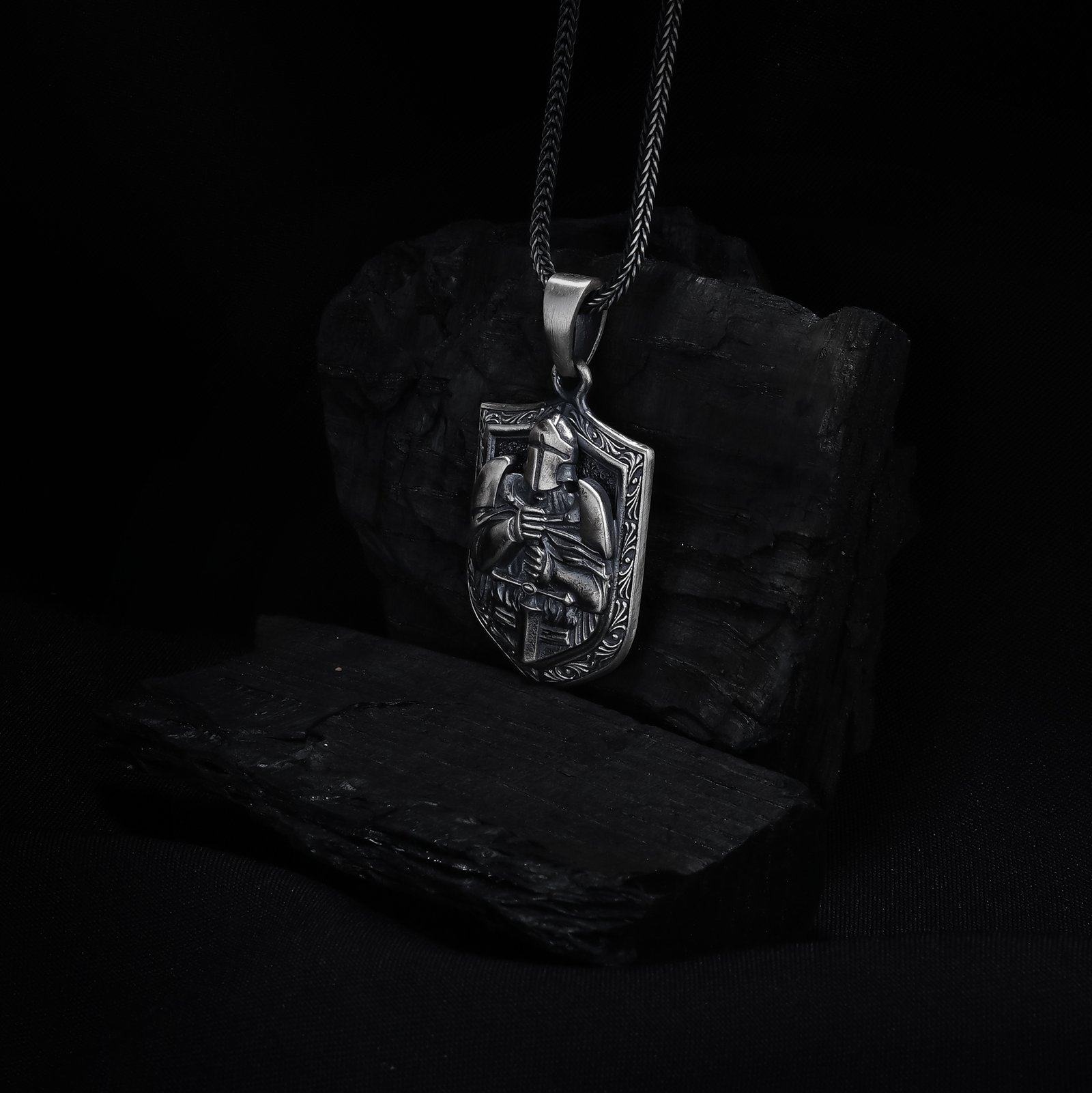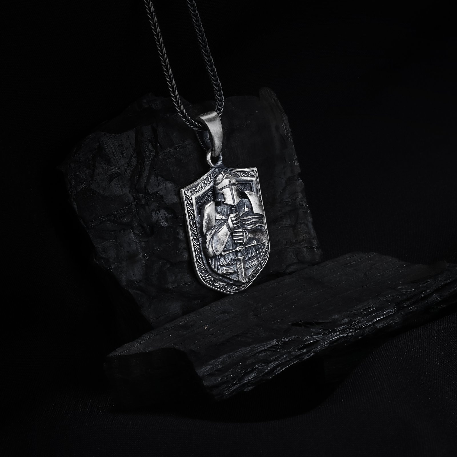 Sterling silver knight shield necklace with detailed medieval warrior design.