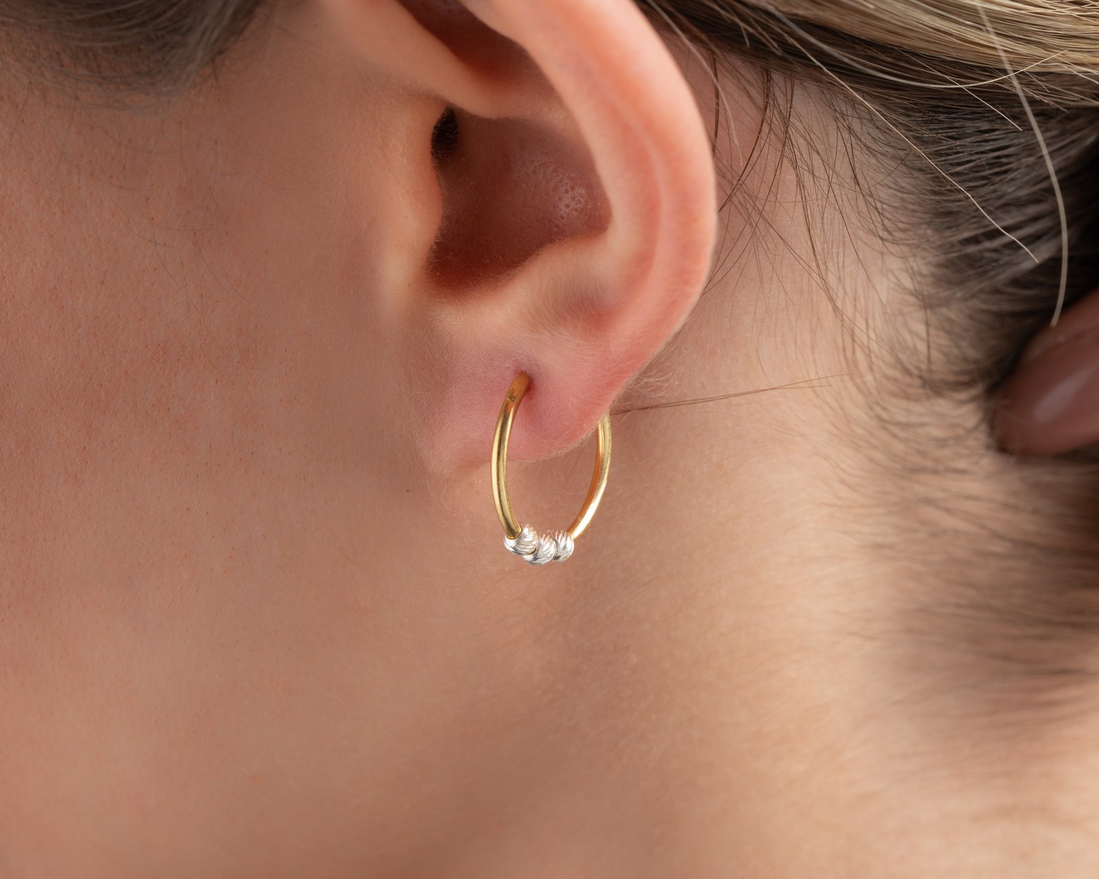 A chic pair of gold-plated hoops decorated with textured silver beads.