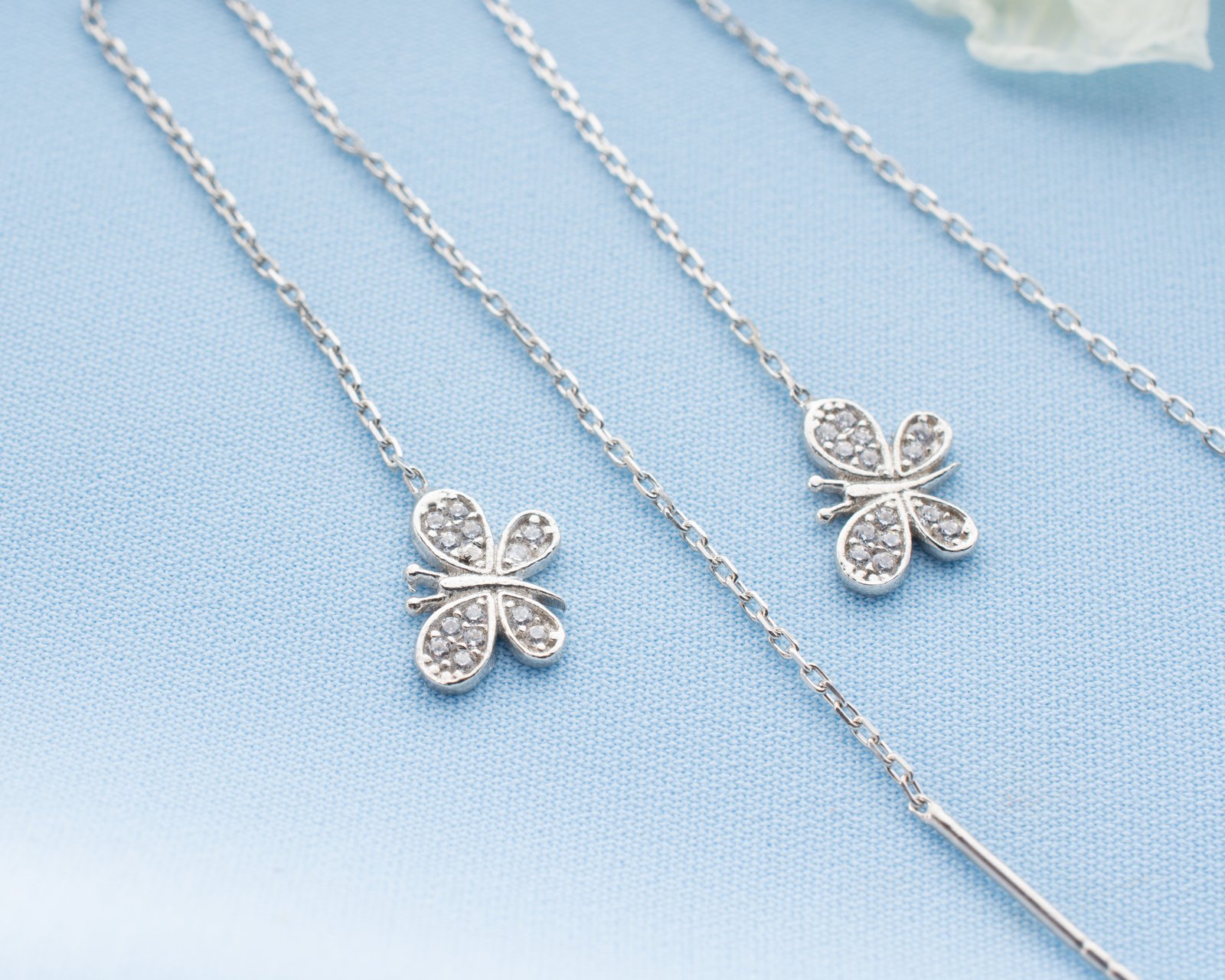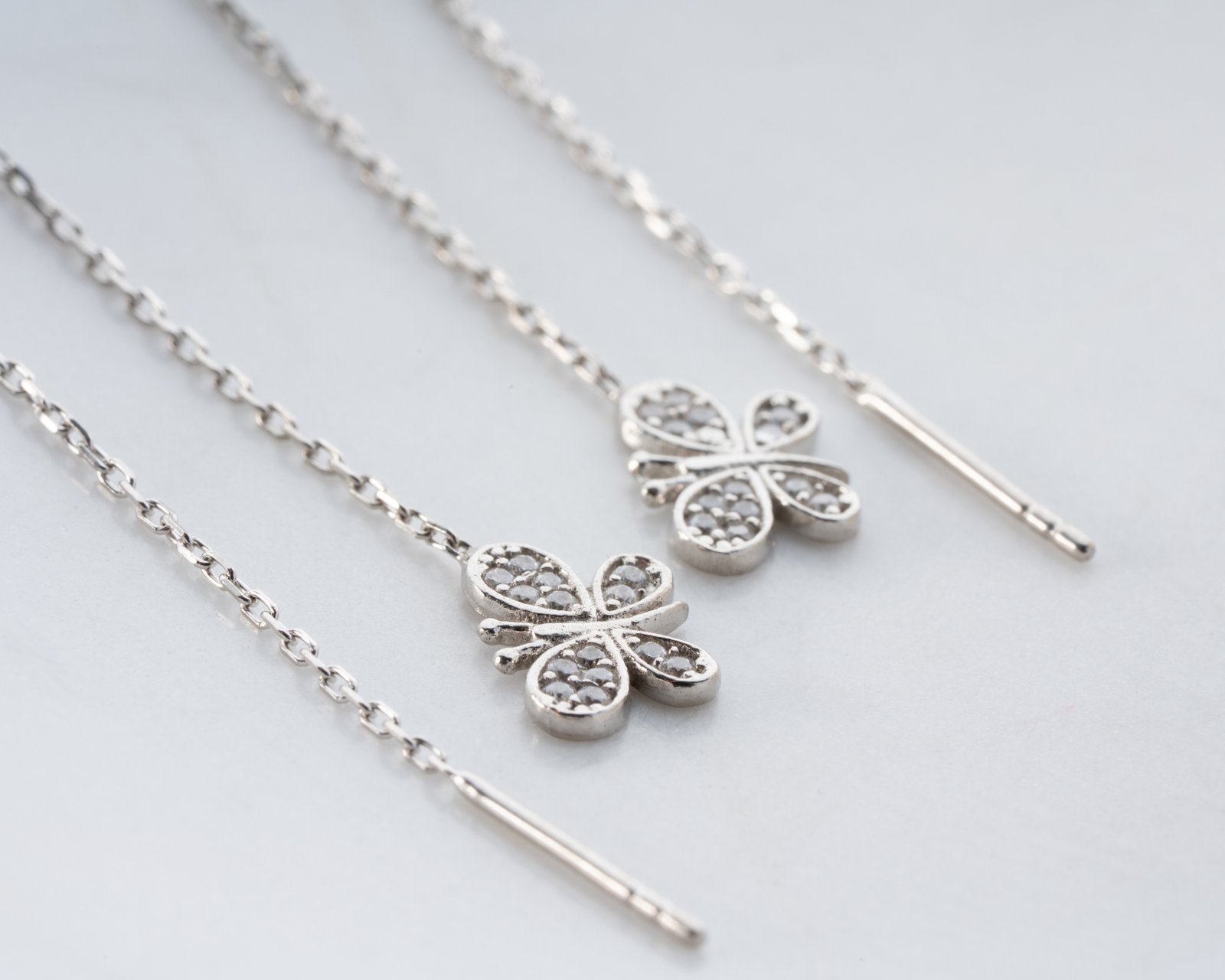 Delicate sterling silver threader earrings with CZ clover charms.