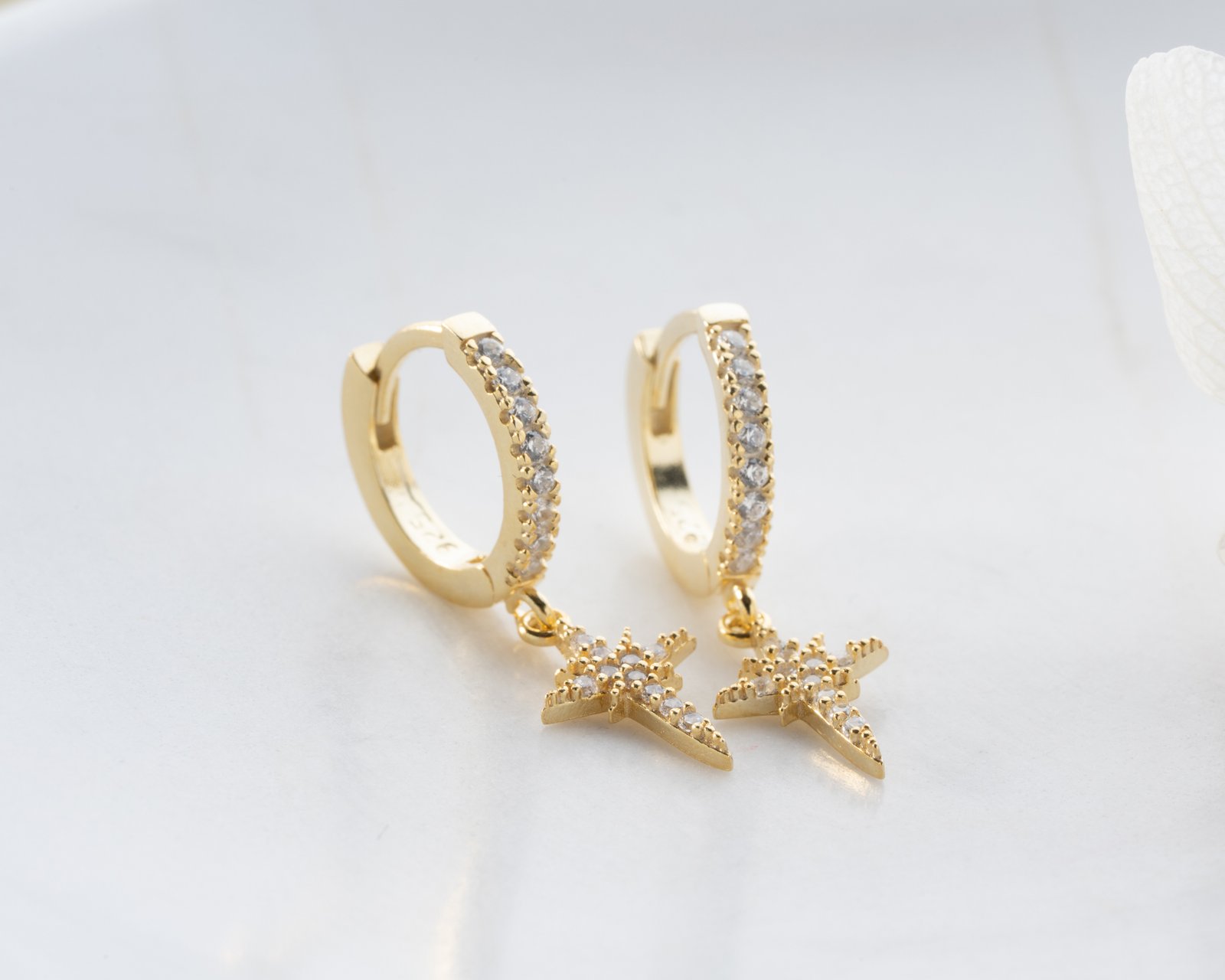 Gold hoop earrings with sparkling star drop design.