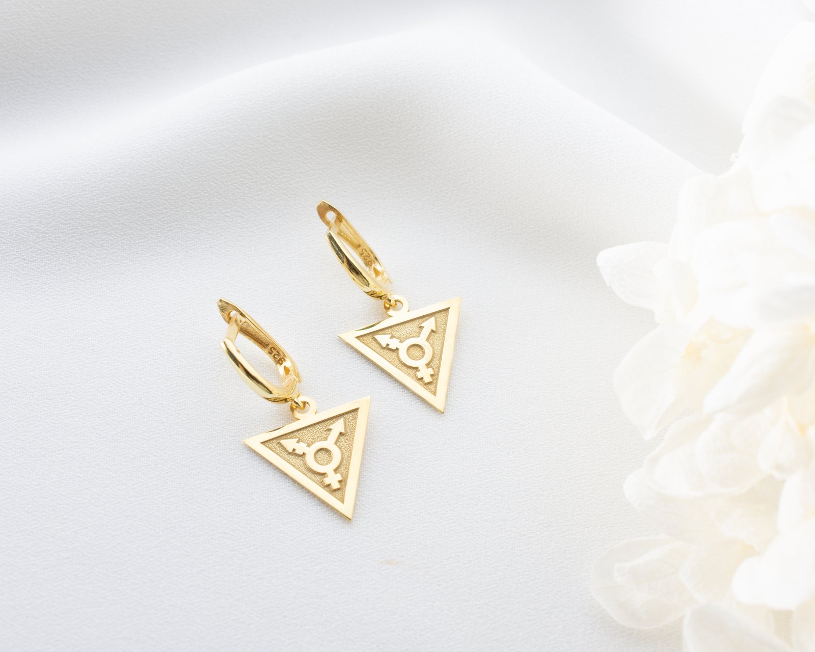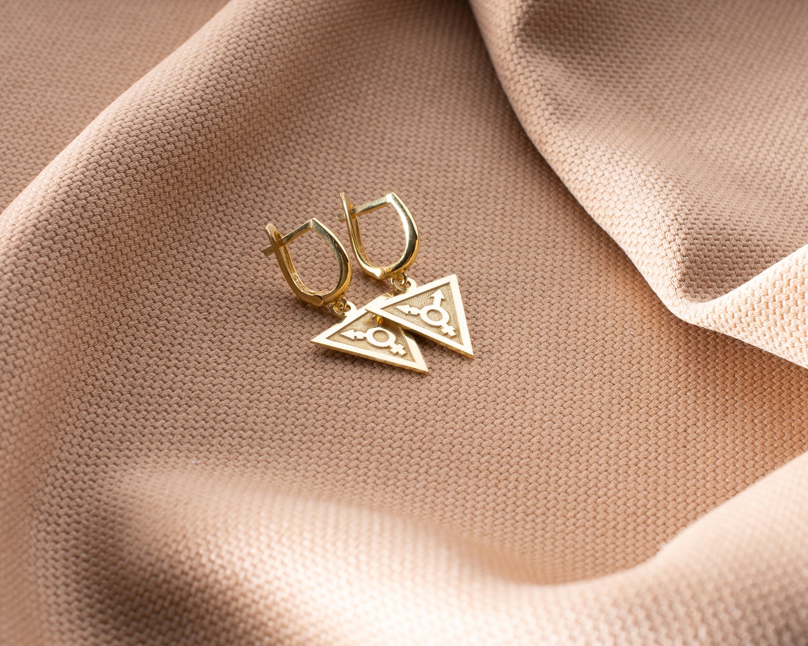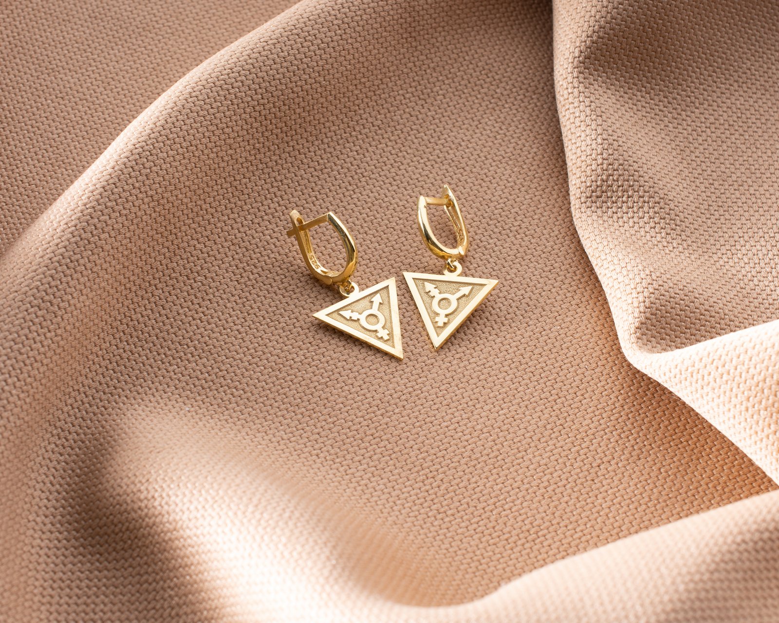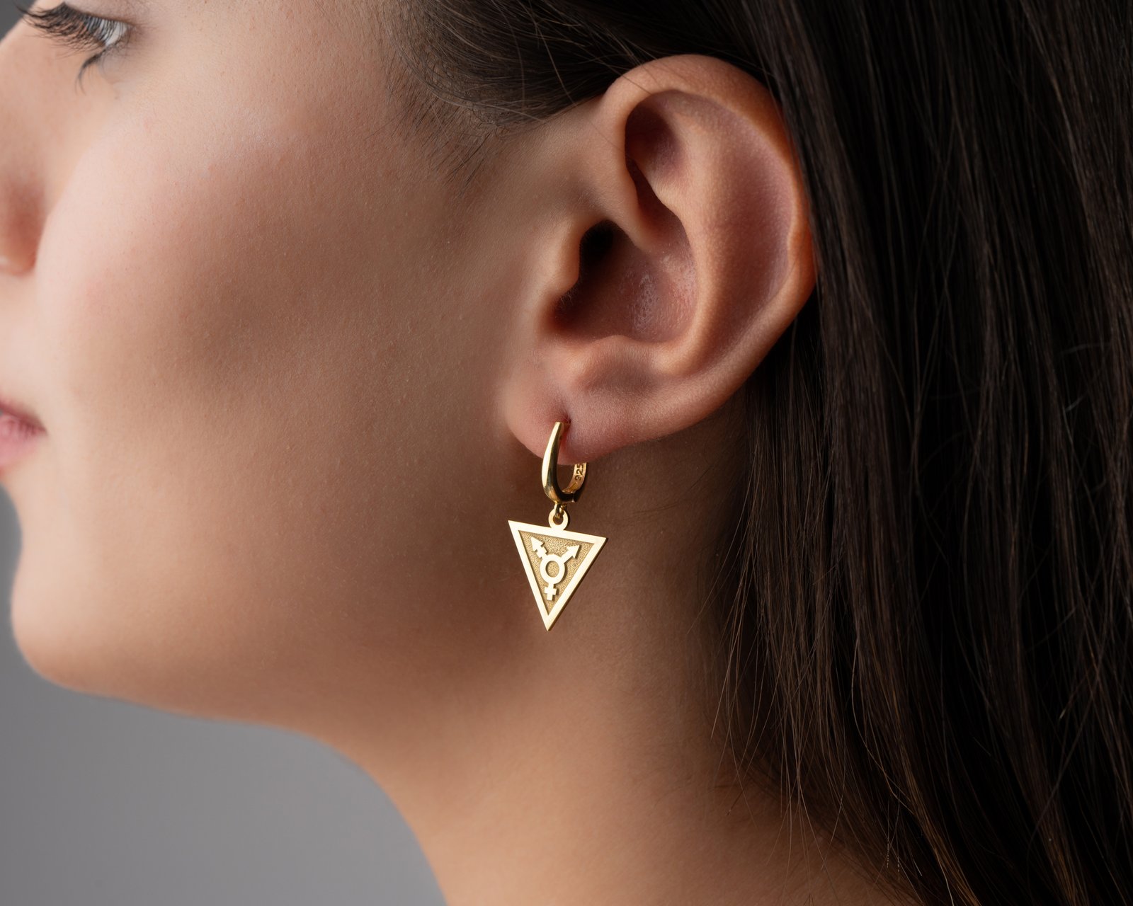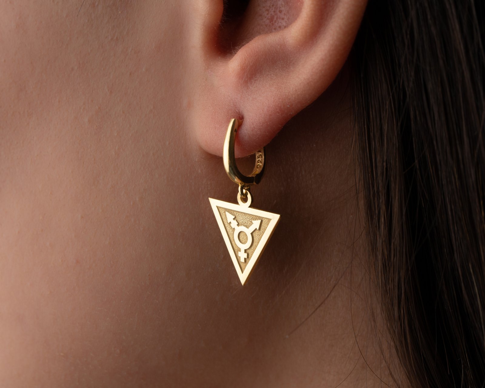 Women’s gold triangle earrings with transgender symbol.