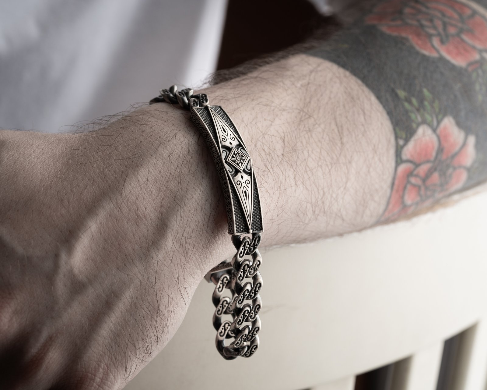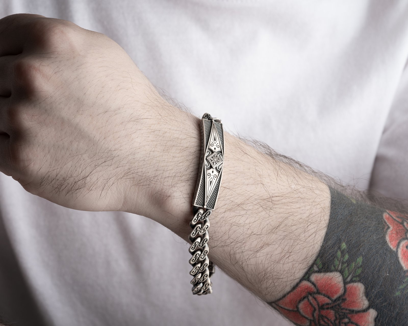 Elegant engraved Nordic-pattern 925 silver bracelet with masculine styling.