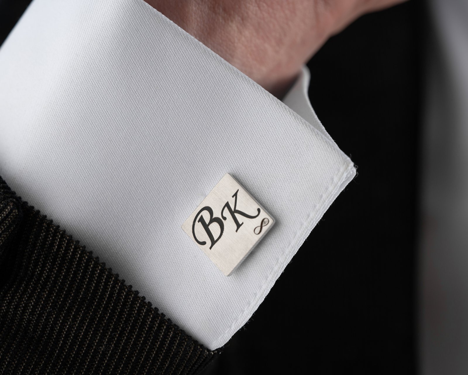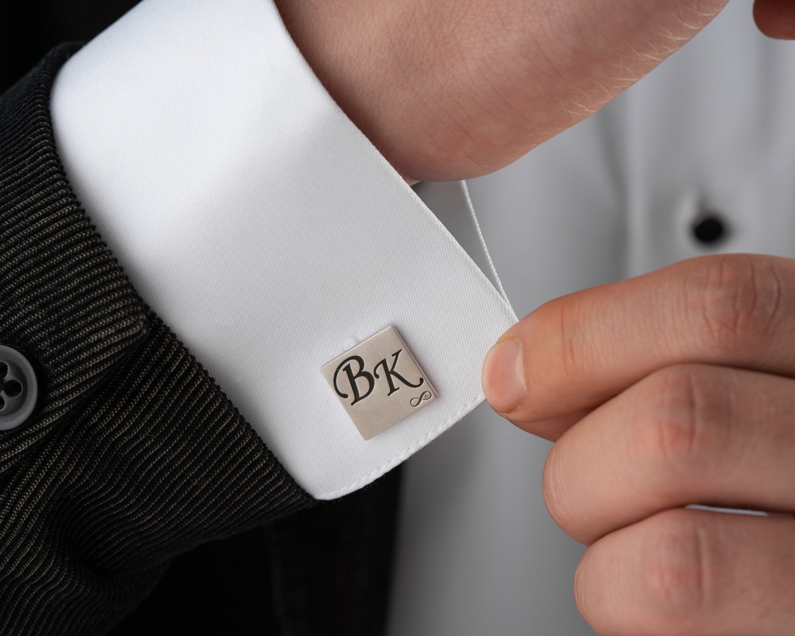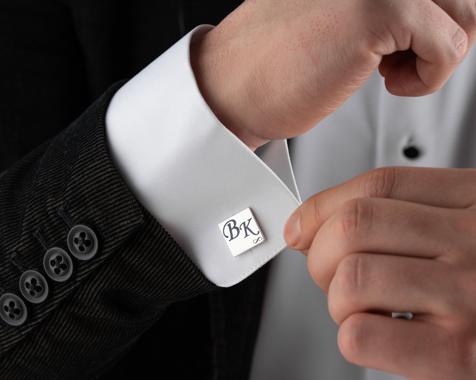 Square silver cufflinks with classic initial design.