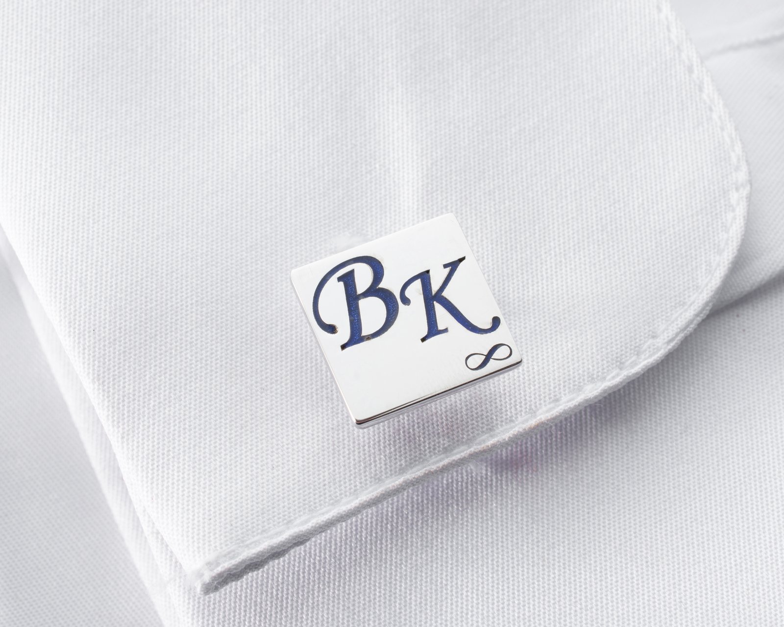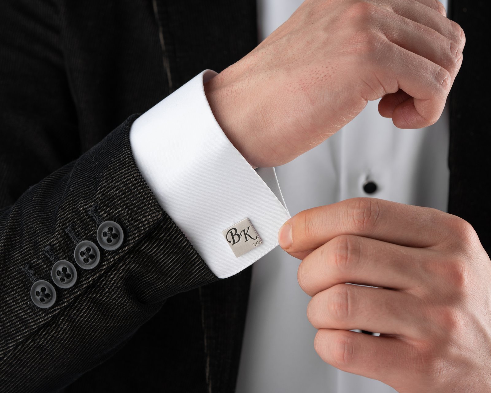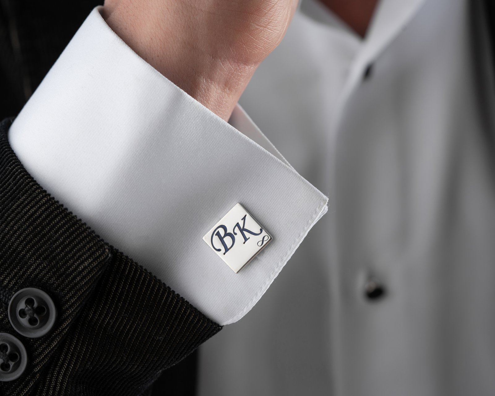 Square silver cufflinks with classic initial design.