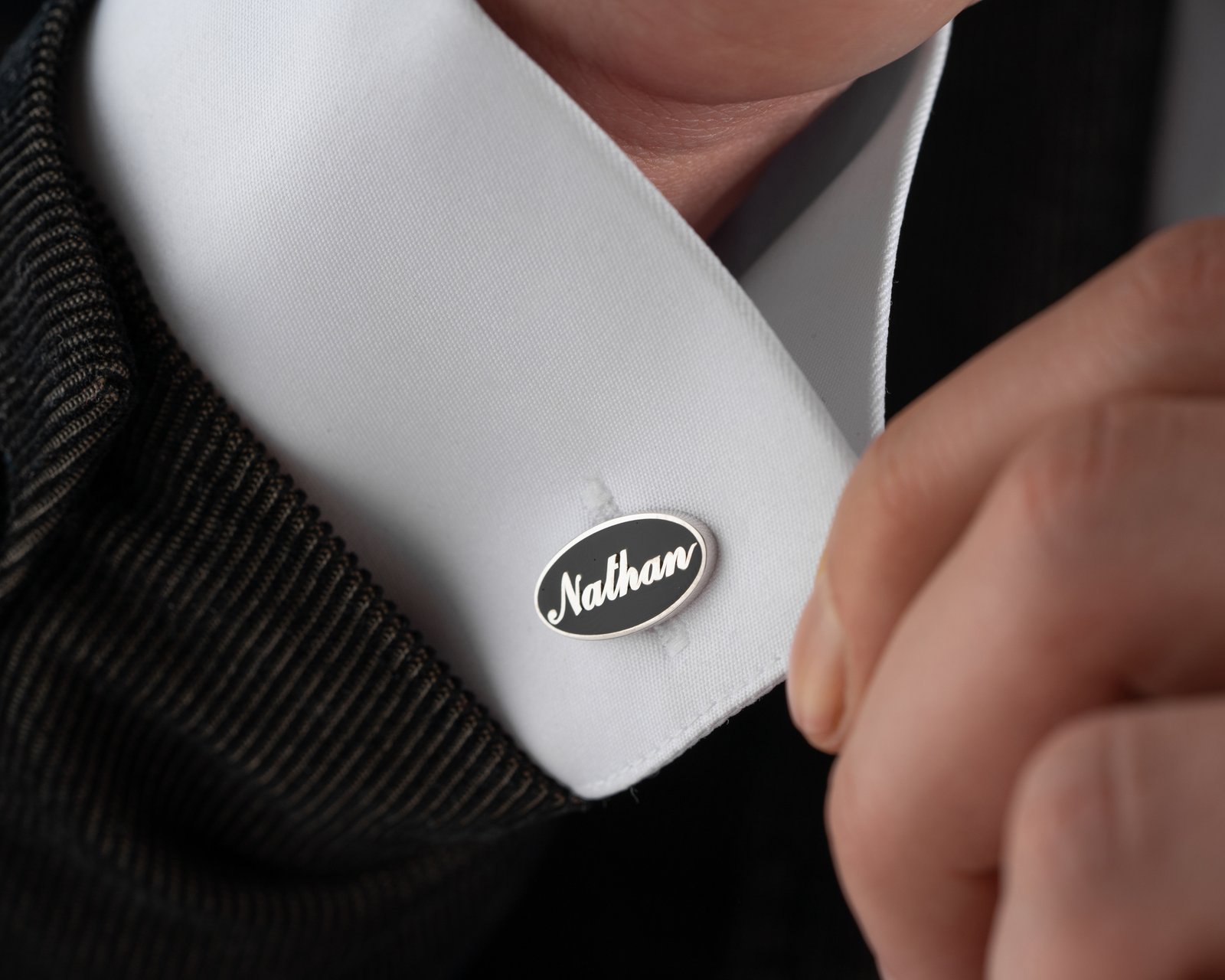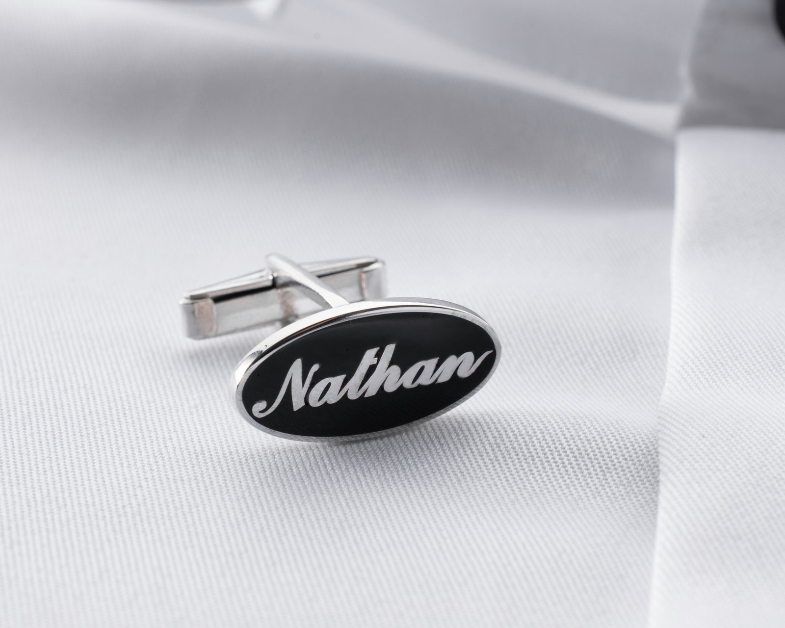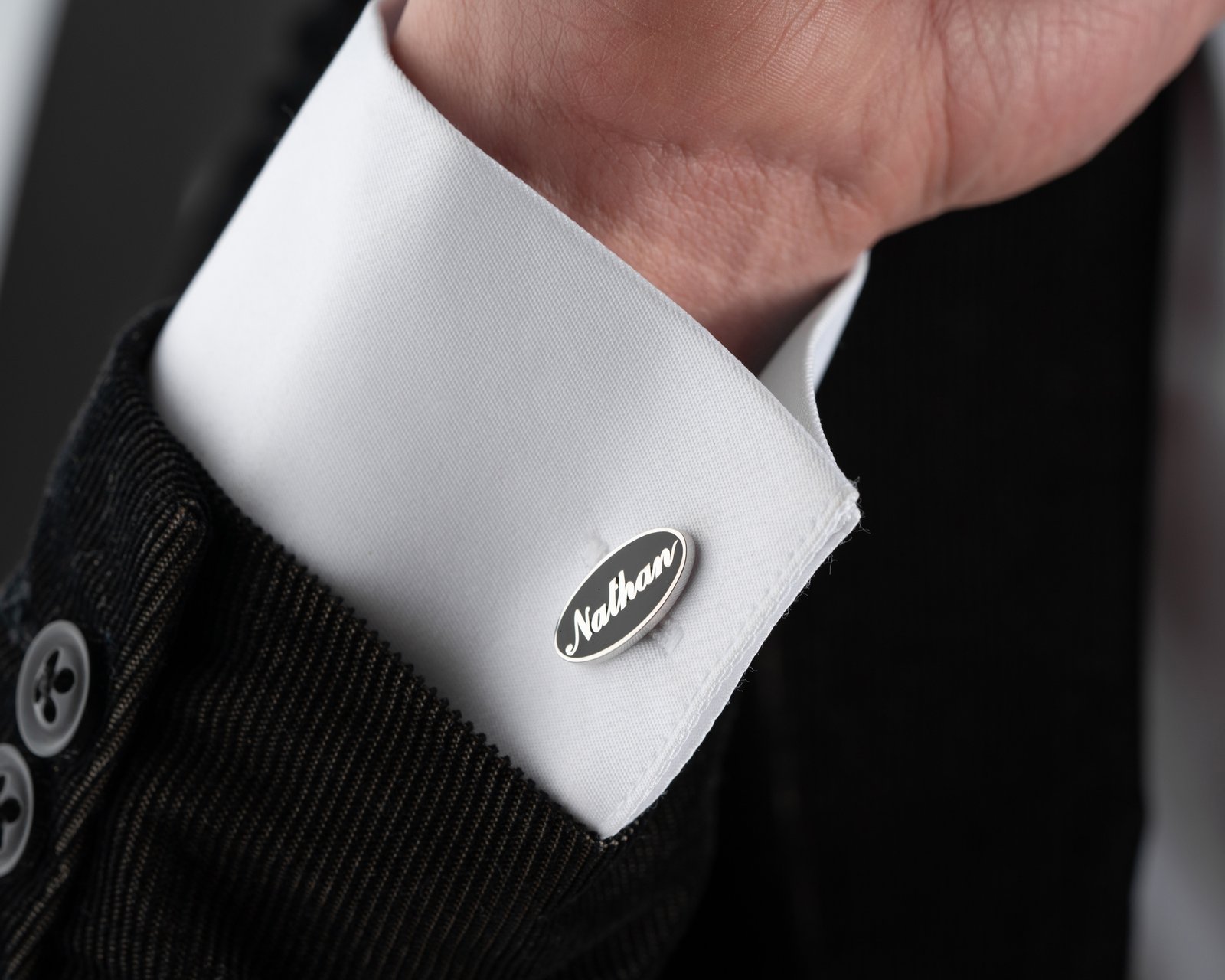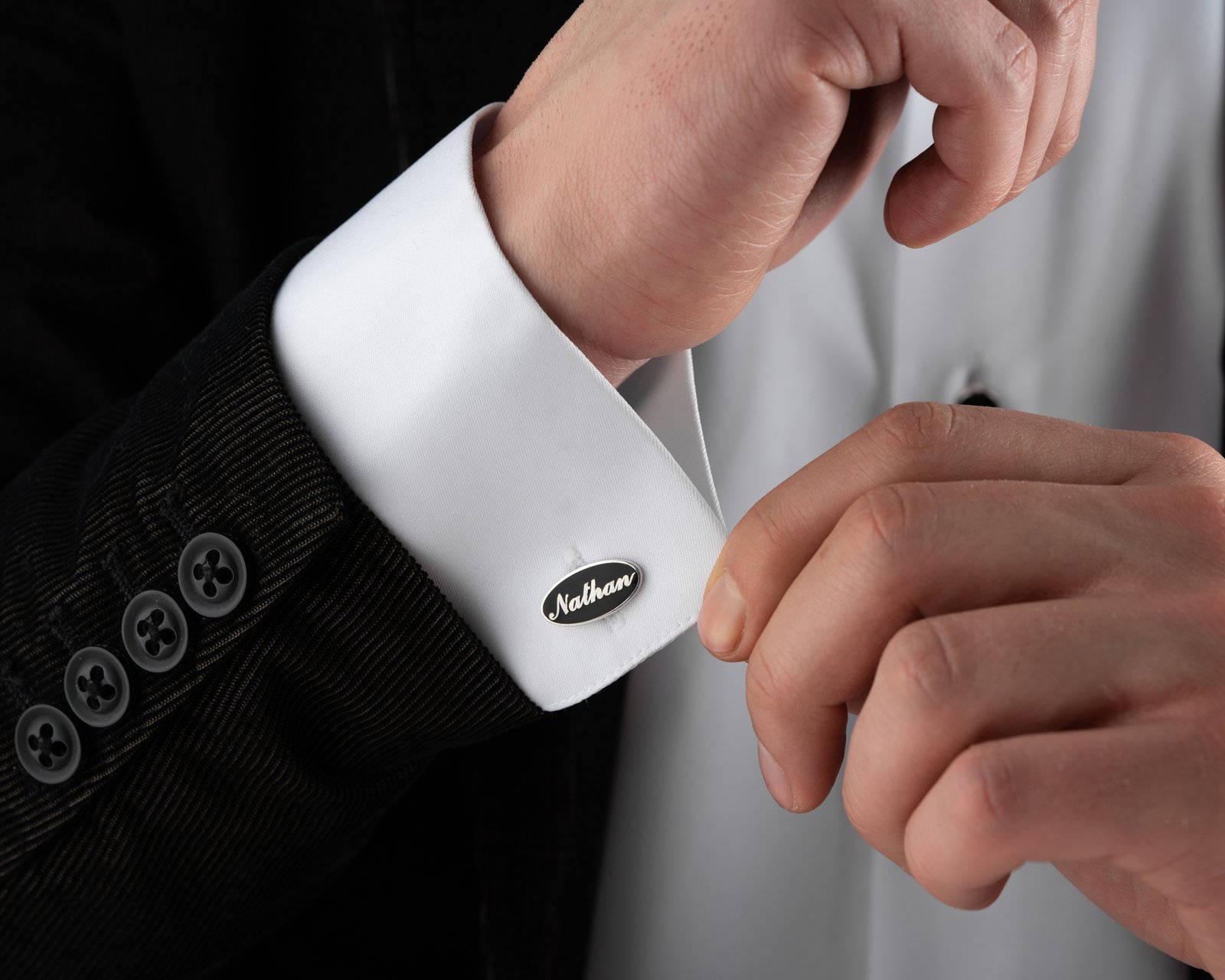 This men’s cufflinks feature a refined oval shape with a deep black enamel surface designed for custom engraving after purchase. The polished silver frame creates a strong contrast, delivering timeless elegance suitable for formal events and business attire. Custom text or names can be added to make each pair unique. These cufflinks reflect confidence, sophistication, and personal style.