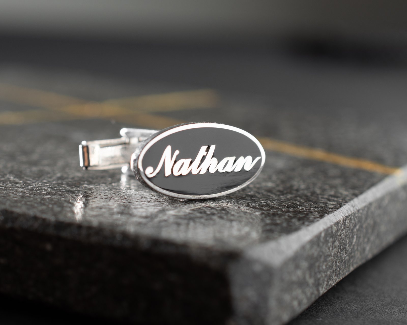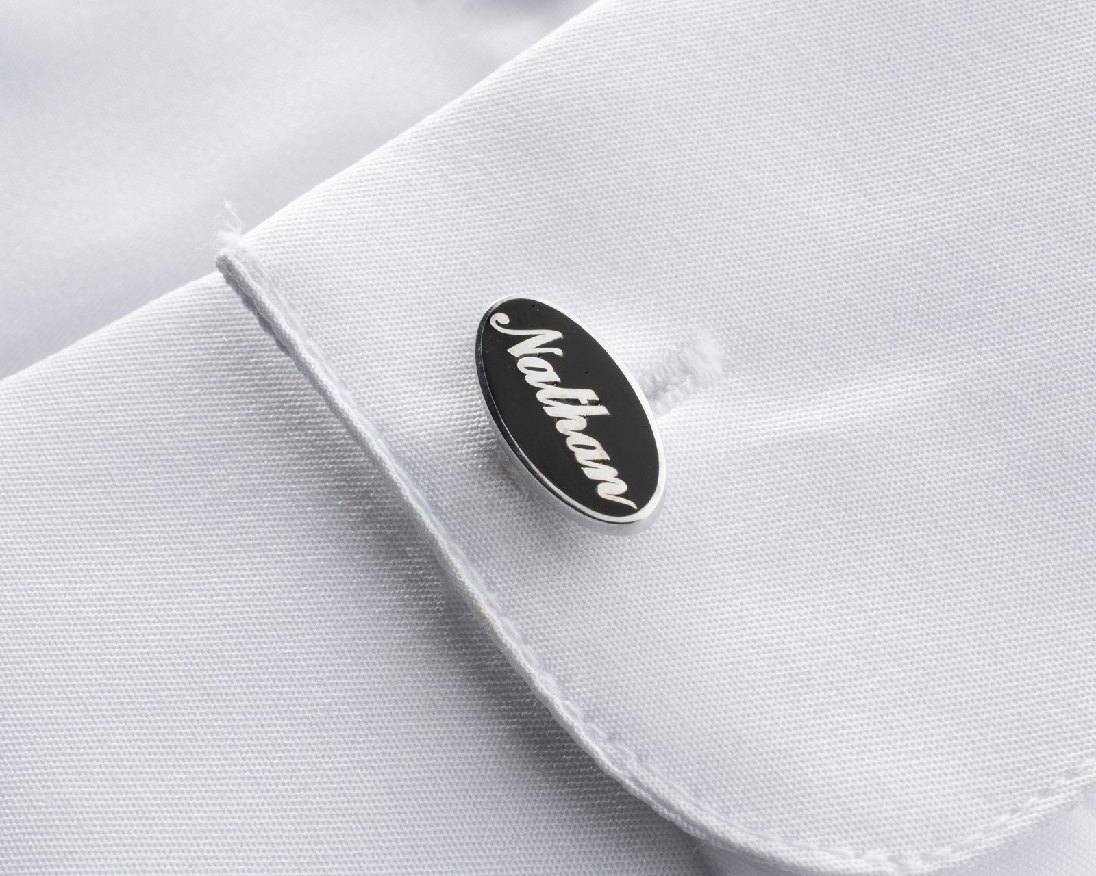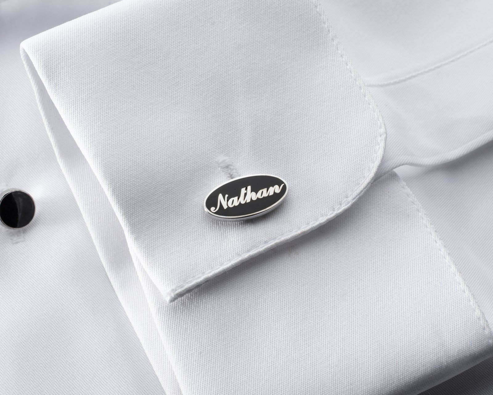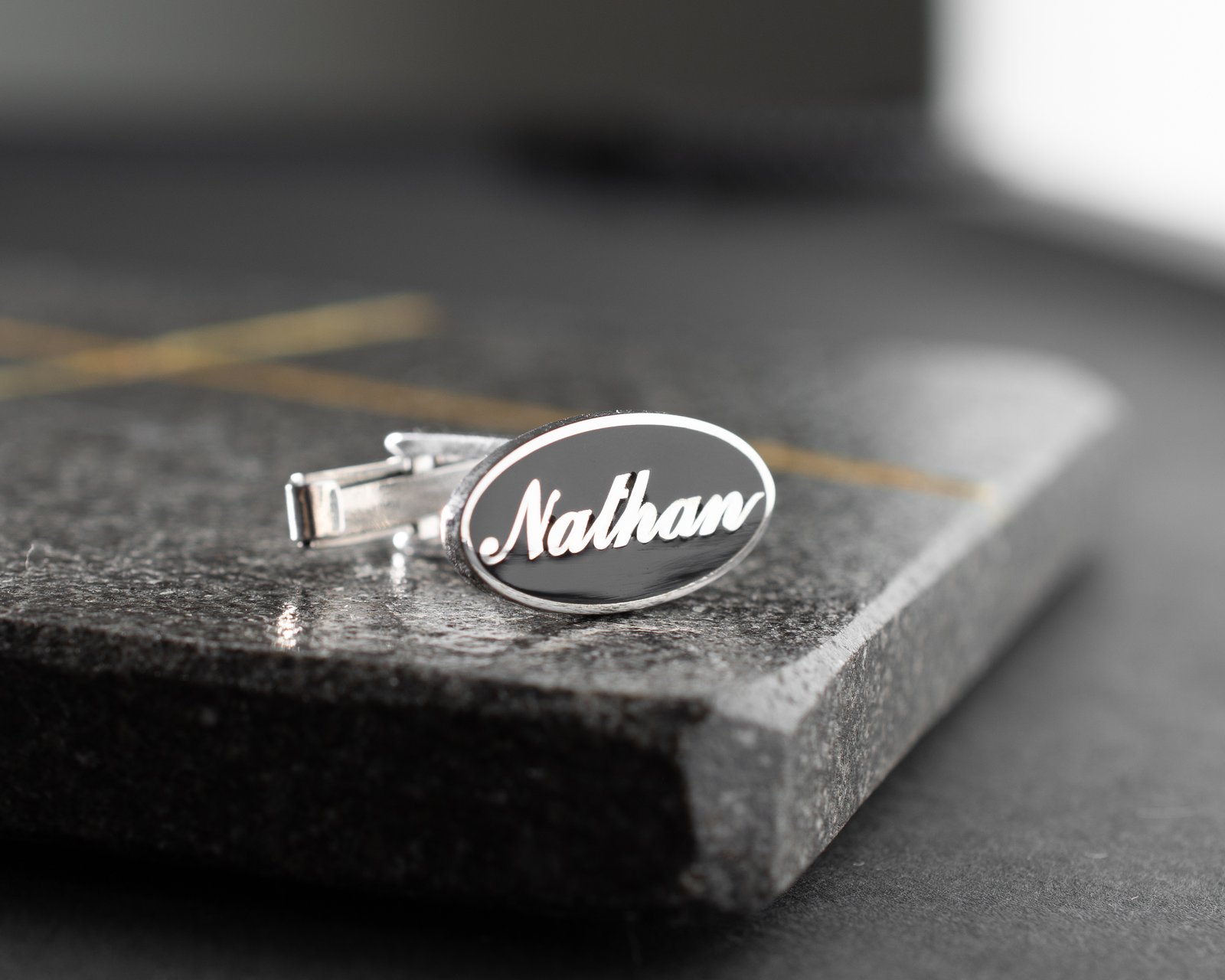 This men’s cufflinks feature a refined oval shape with a deep black enamel surface designed for custom engraving after purchase. The polished silver frame creates a strong contrast, delivering timeless elegance suitable for formal events and business attire. Custom text or names can be added to make each pair unique. These cufflinks reflect confidence, sophistication, and personal style.