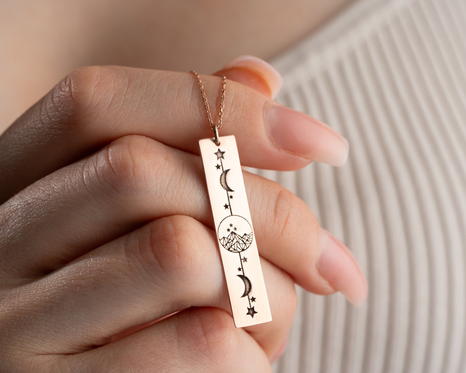 Gold rectangular pendant featuring moon phases, stars, and a geometric mountain landscape. Designed for everyday wear, this necklace represents balance, exploration, and cosmic harmony. Its minimalist engraving and polished finish make it an elegant accessory for any outfit. Ideal for those who appreciate nature-inspired jewelry with a modern aesthetic.