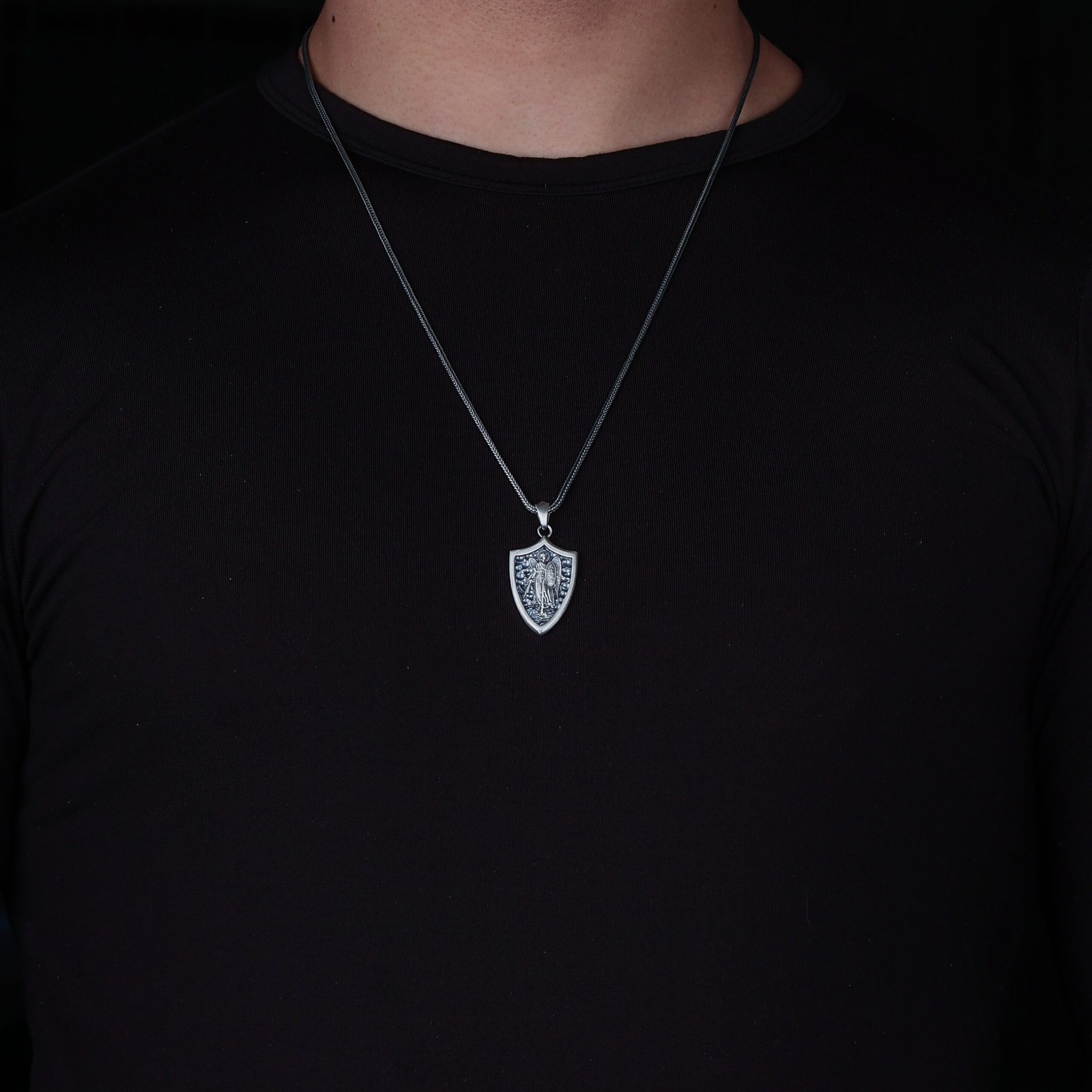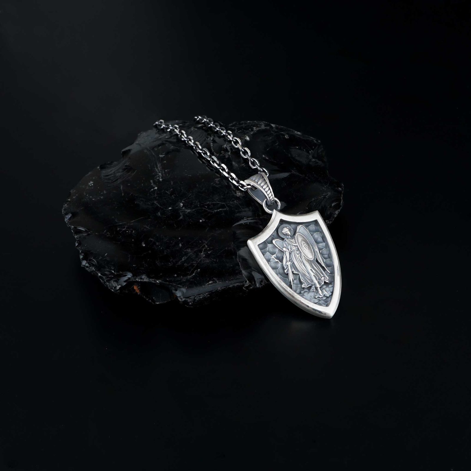 Bold 925 silver Saint Michael shield pendant necklace with a heroic design.