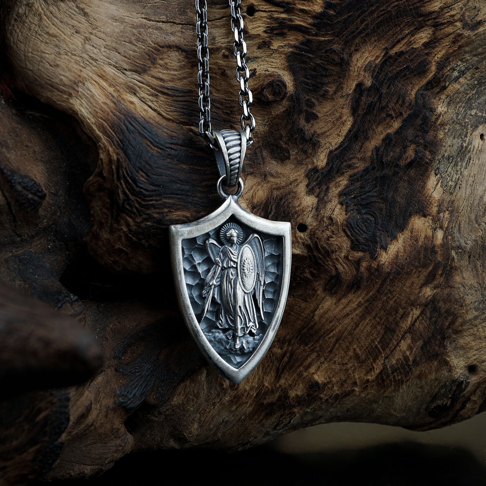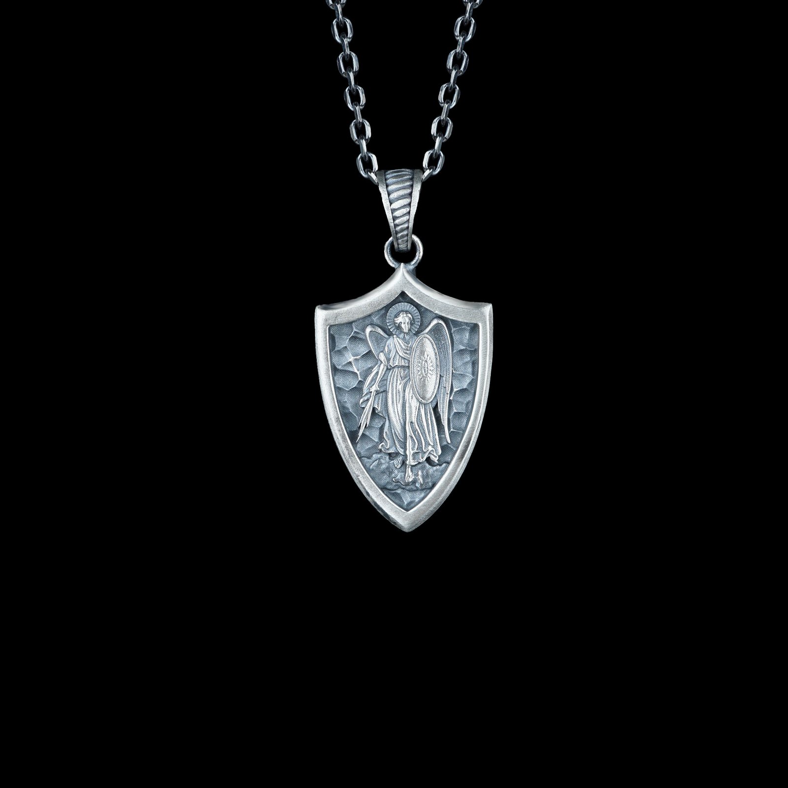 This premium 925 sterling silver necklace features a shield-shaped pendant with a detailed engraving of Saint Michael the Archangel. Its hammered background texture creates depth and contrast, enhancing the powerful warrior aesthetic. The protective symbolism adds meaning to its bold design. The sturdy chain complements the weight and shape of the shield pendant. A strong statement piece for those who appreciate symbolic and heroic themes.
