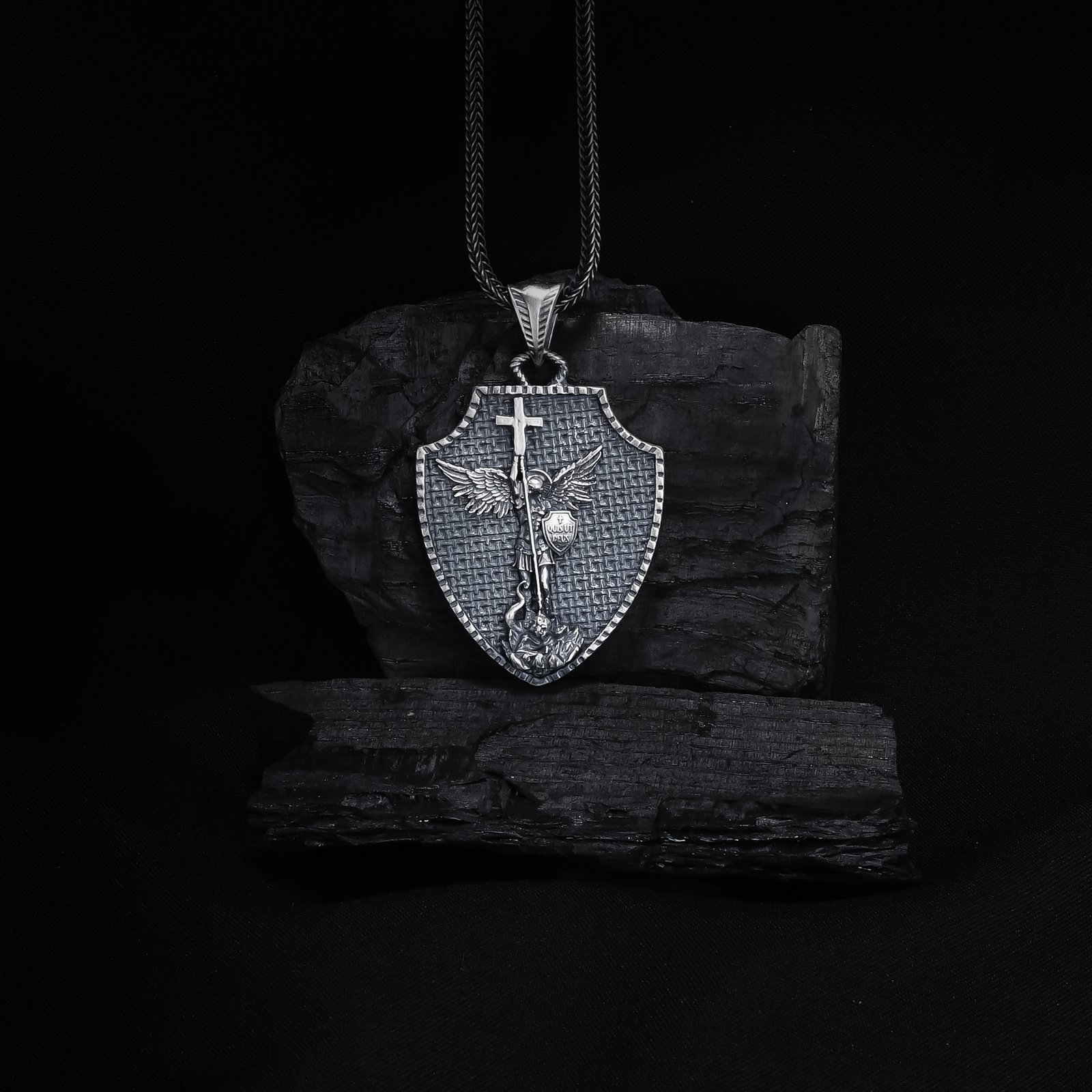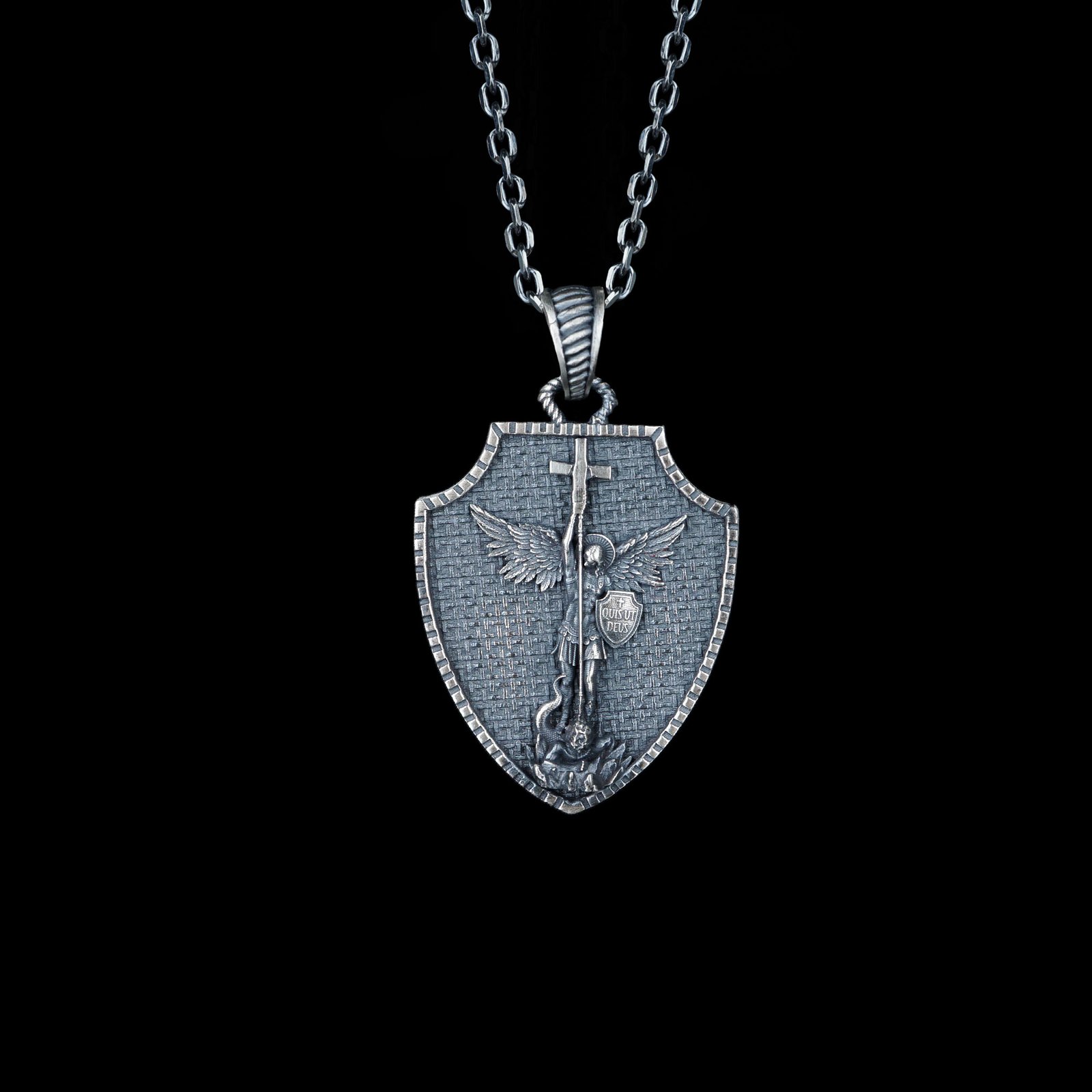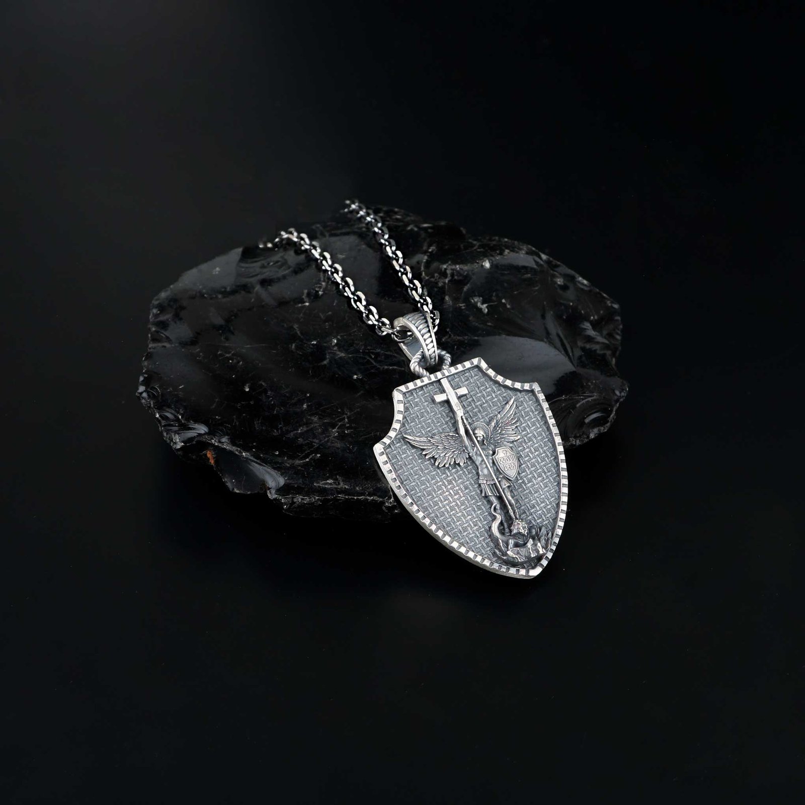 Shield-shaped 925 silver Saint Michael necklace with woven texture.