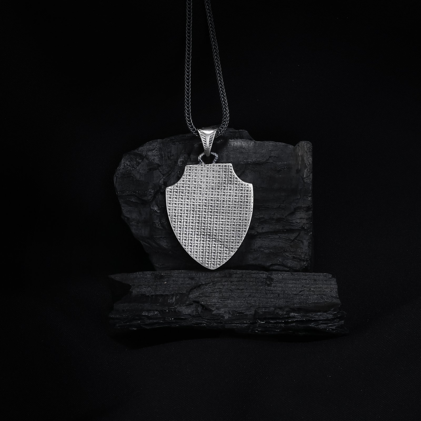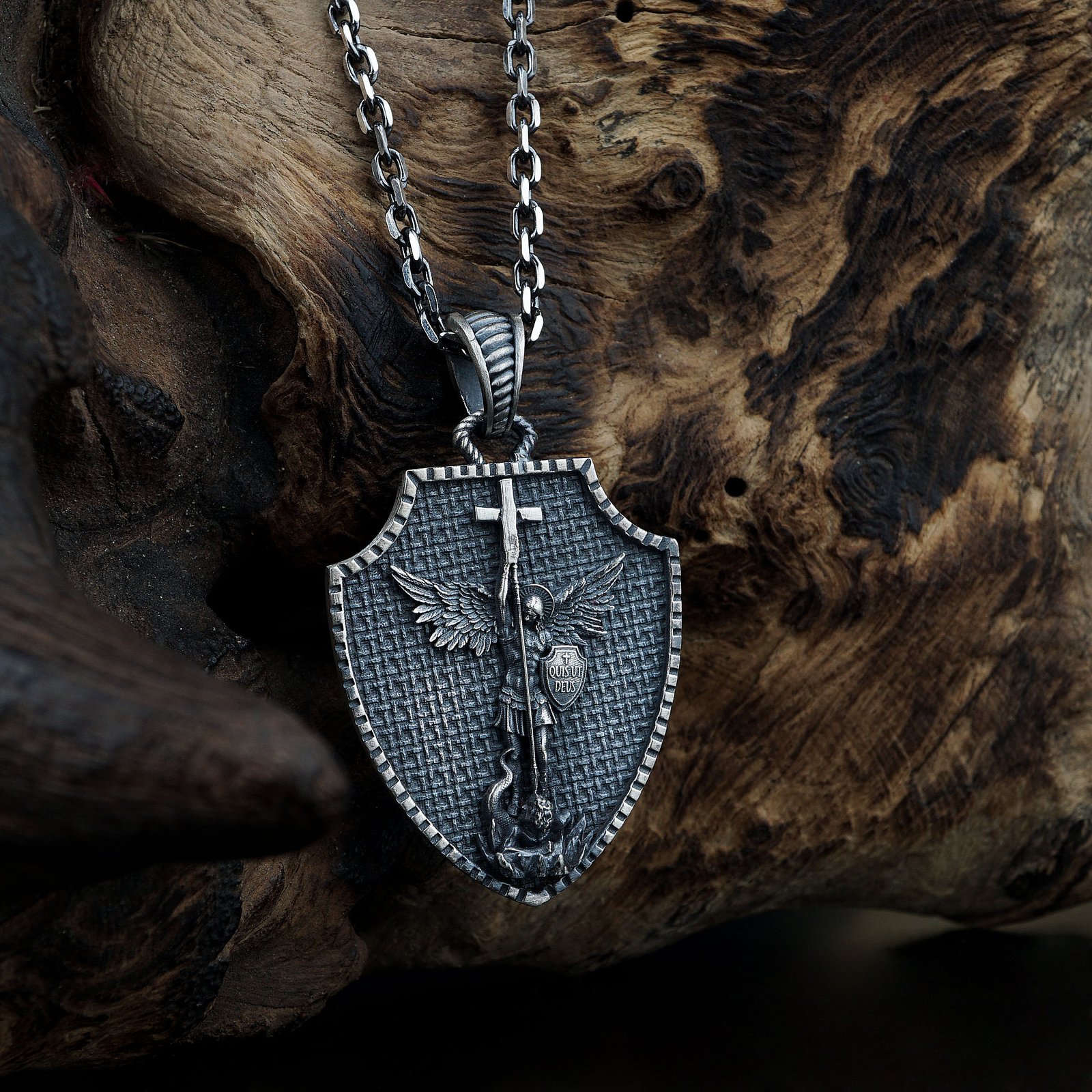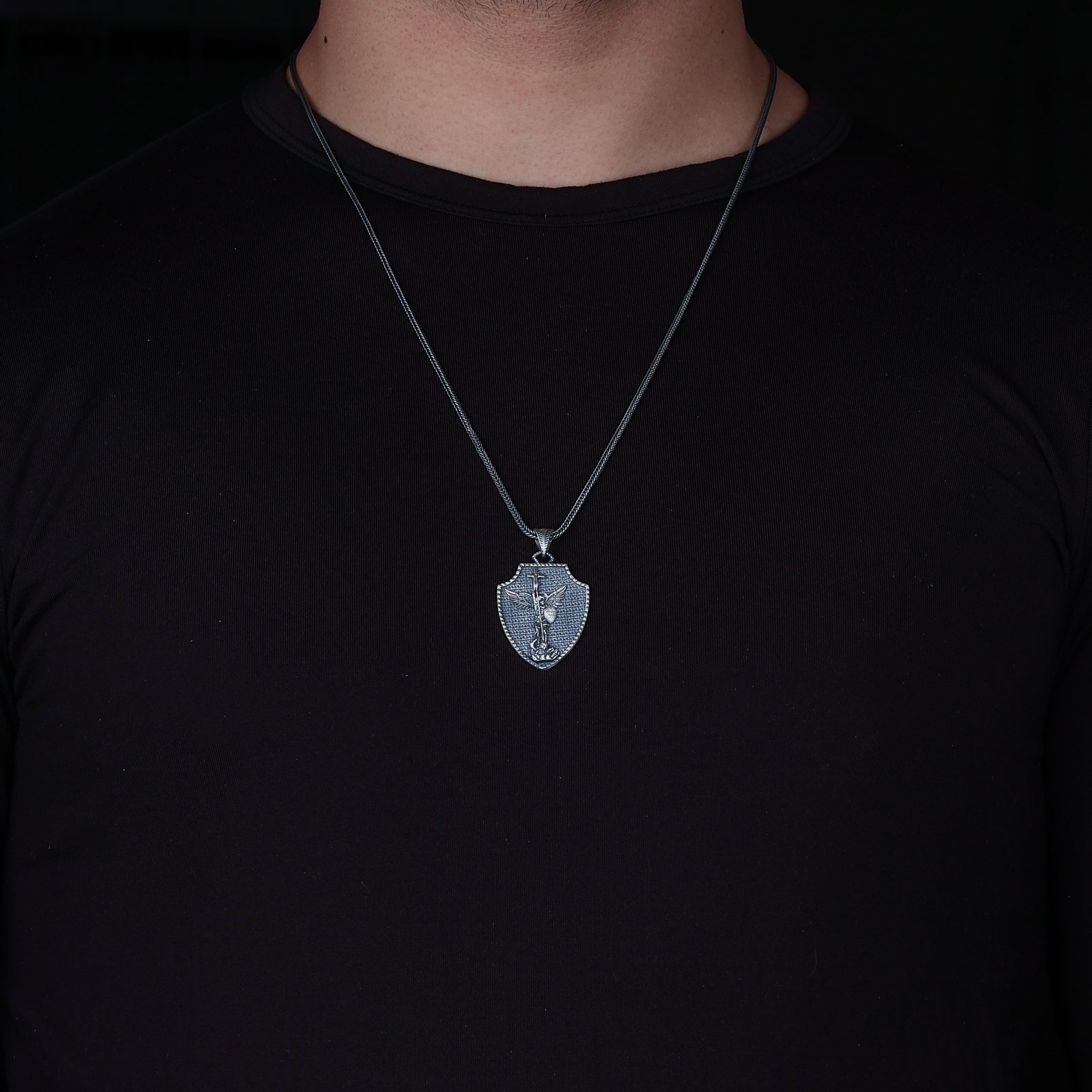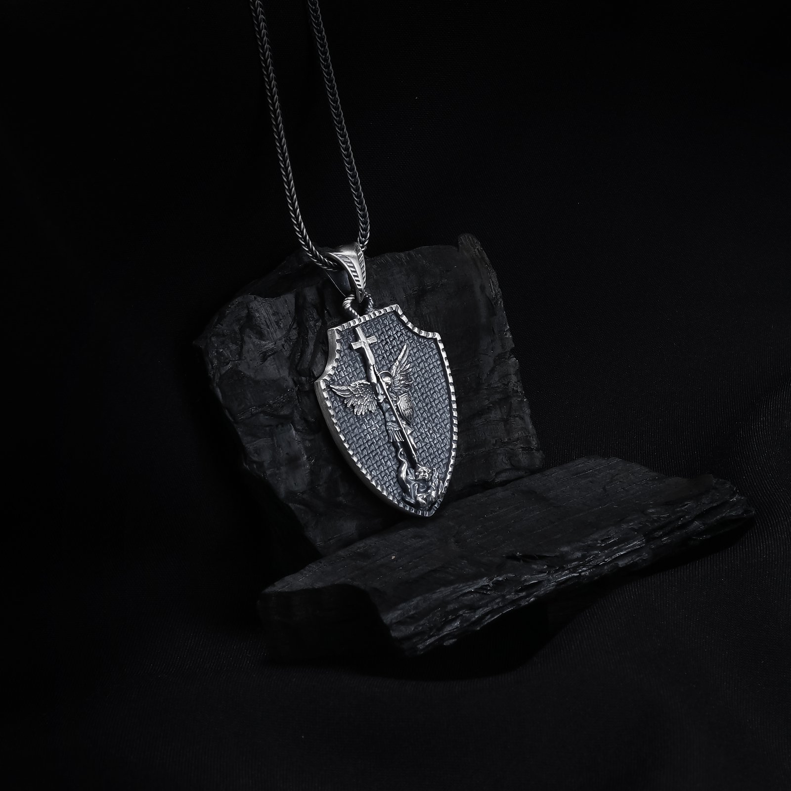 Shield-shaped 925 silver Saint Michael necklace with woven texture.