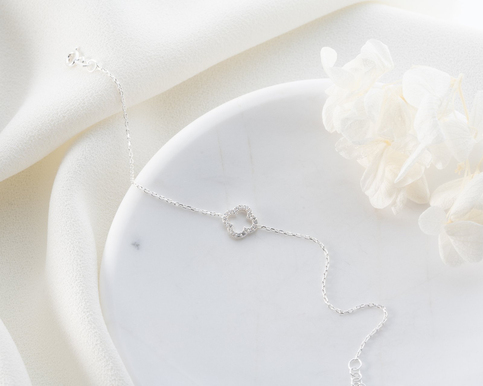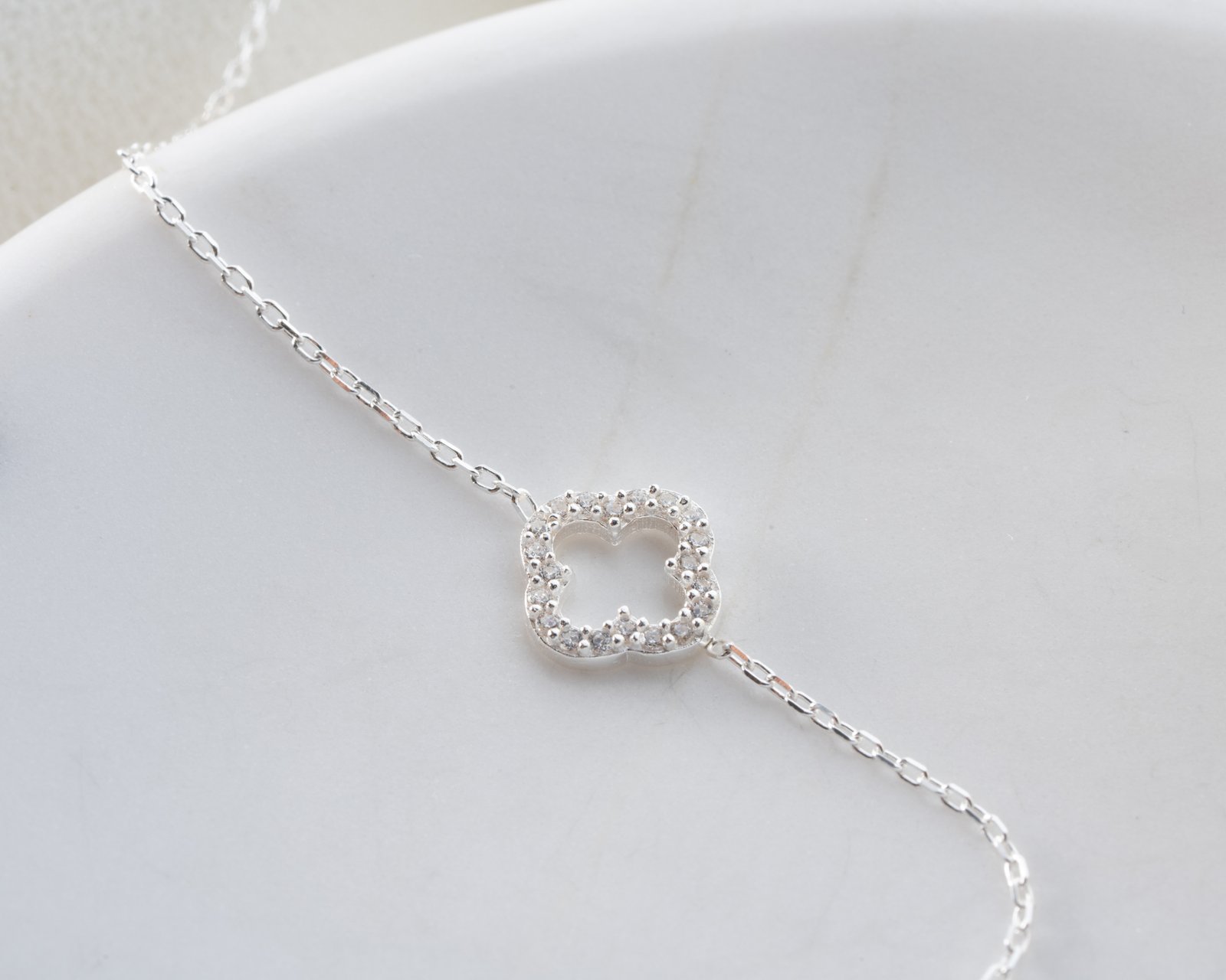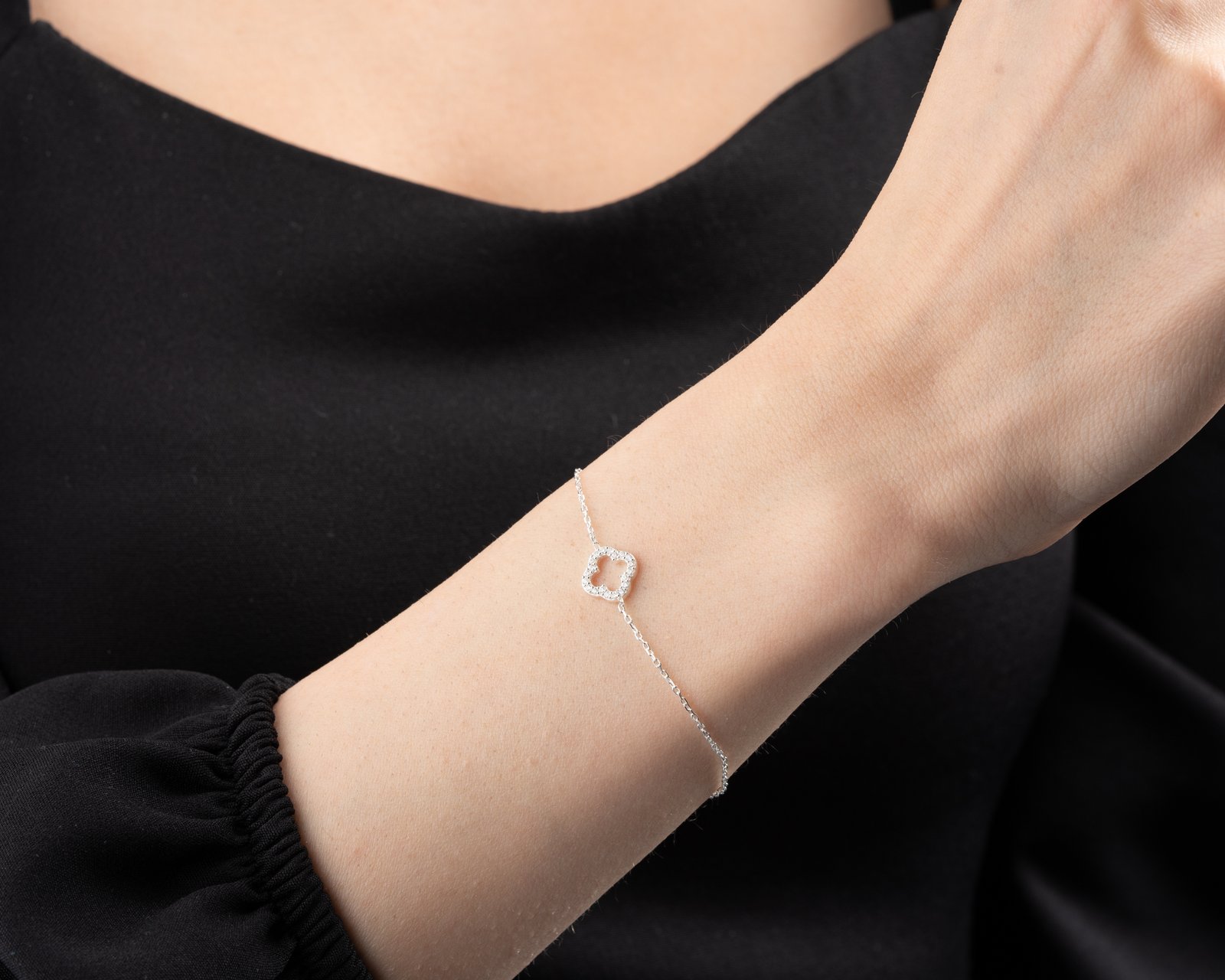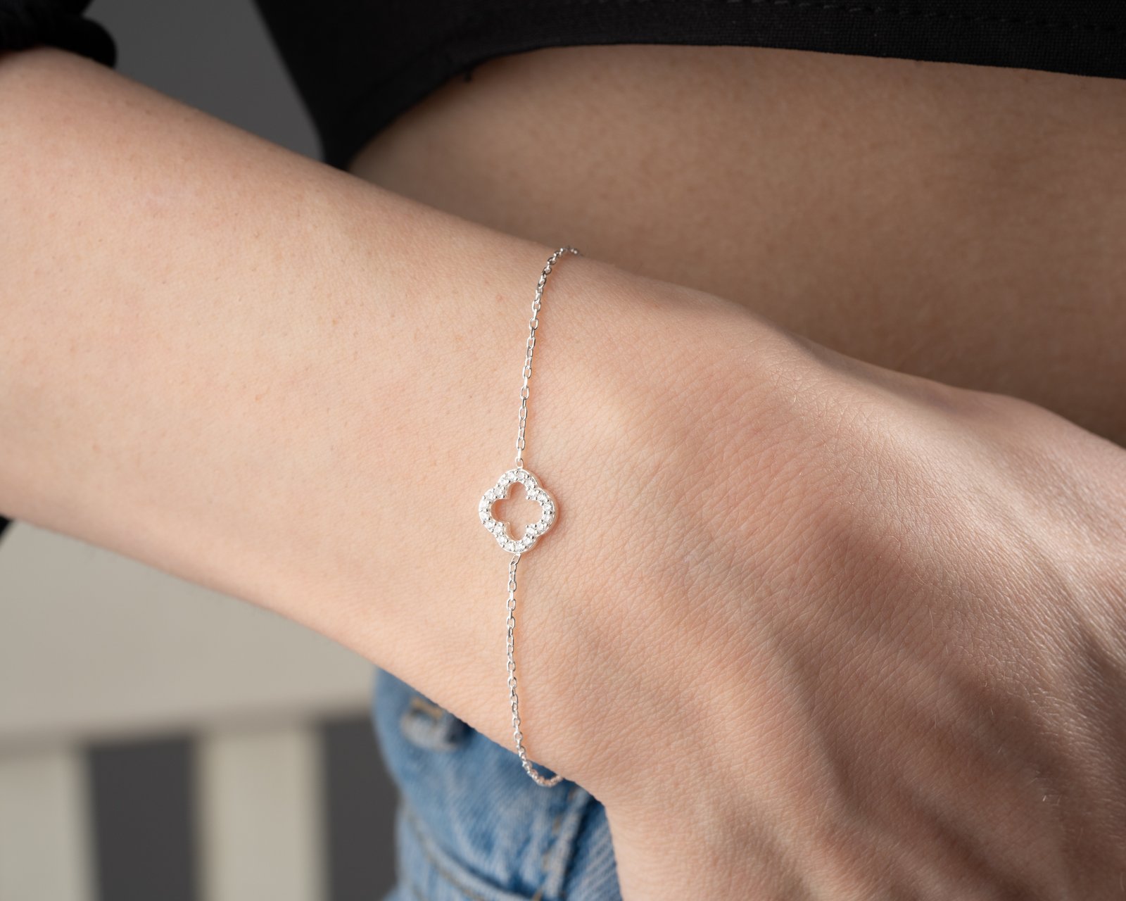 This elegant silver bracelet features a crystal-studded clover motif symbolizing luck and positivity. Designed with a delicate minimalist chain, it adds sparkle without overwhelming the wrist. Perfect for daily wear or layering with other bracelets, offering a timeless and refined look for modern women.