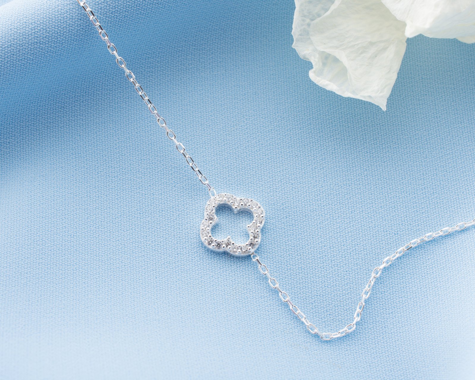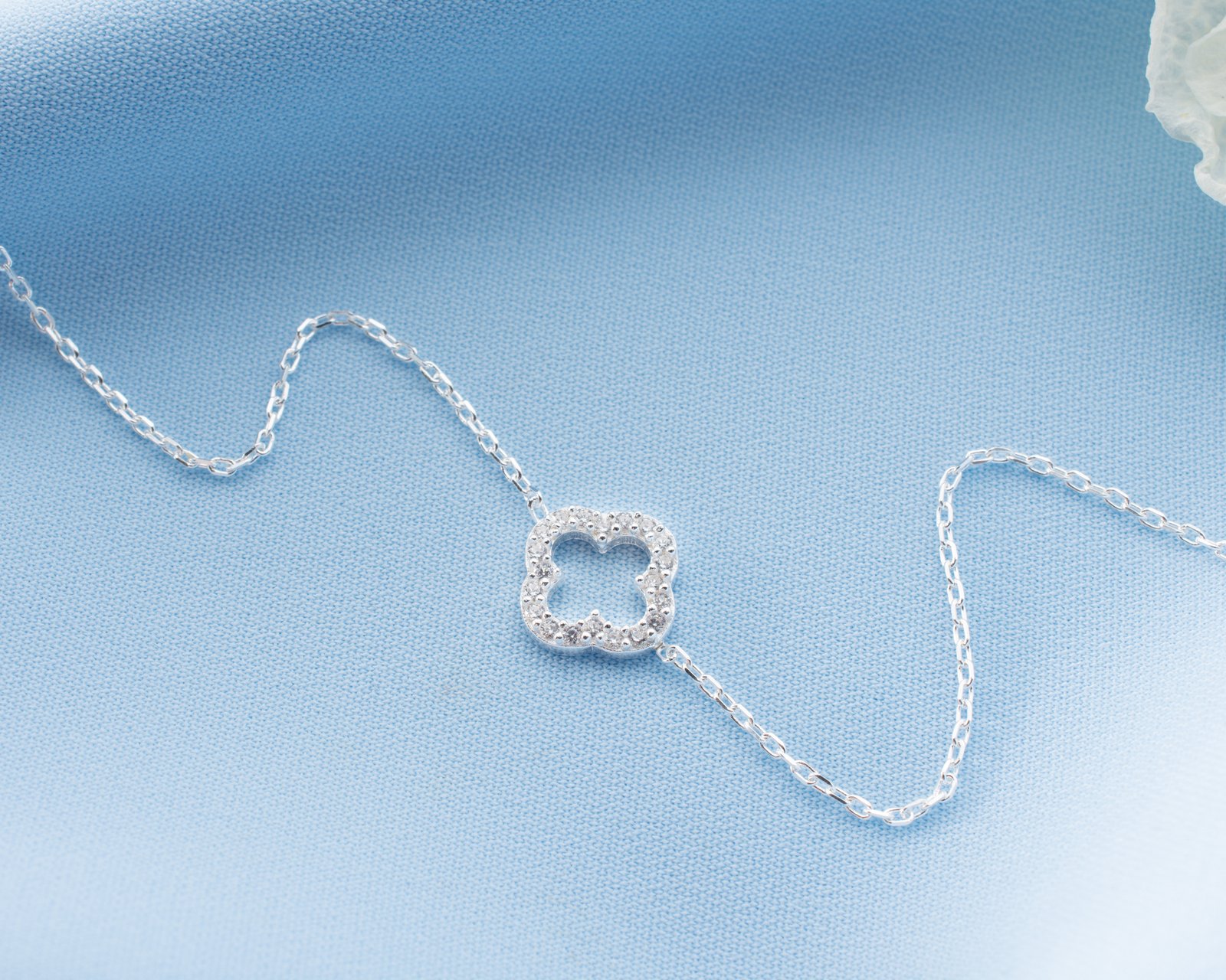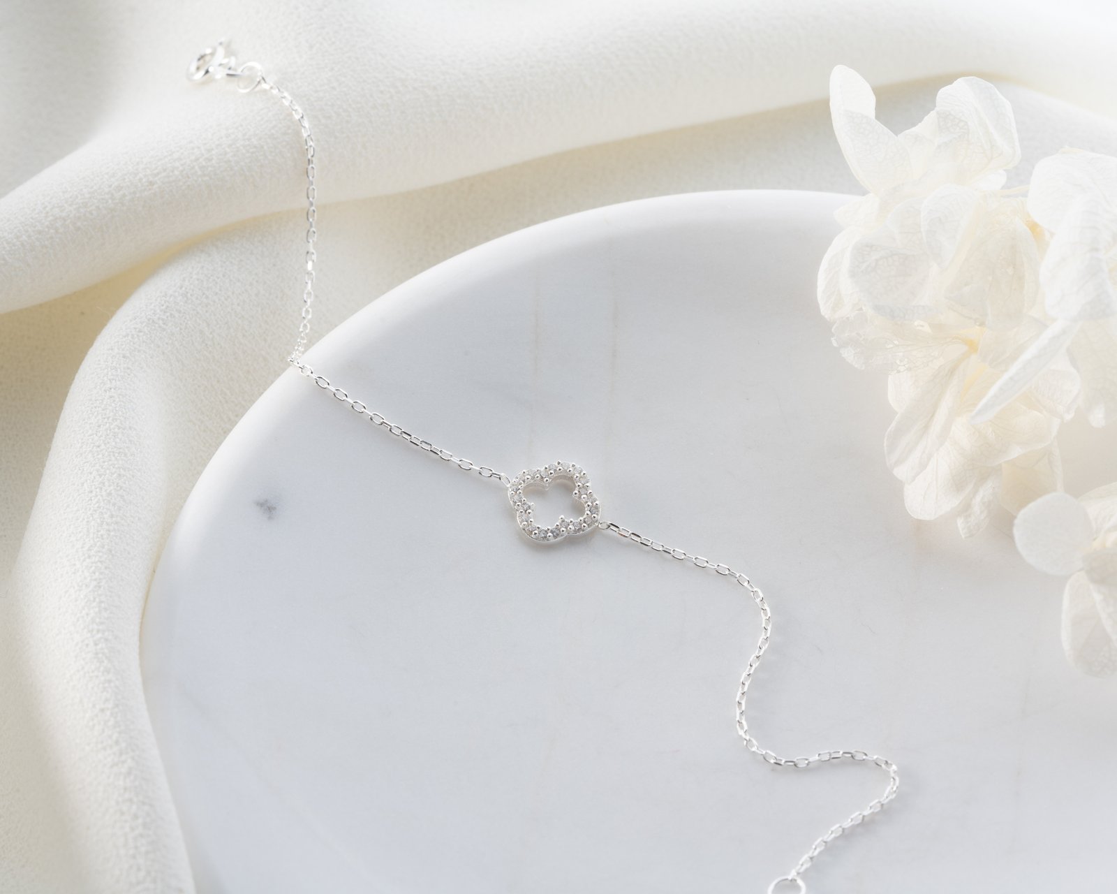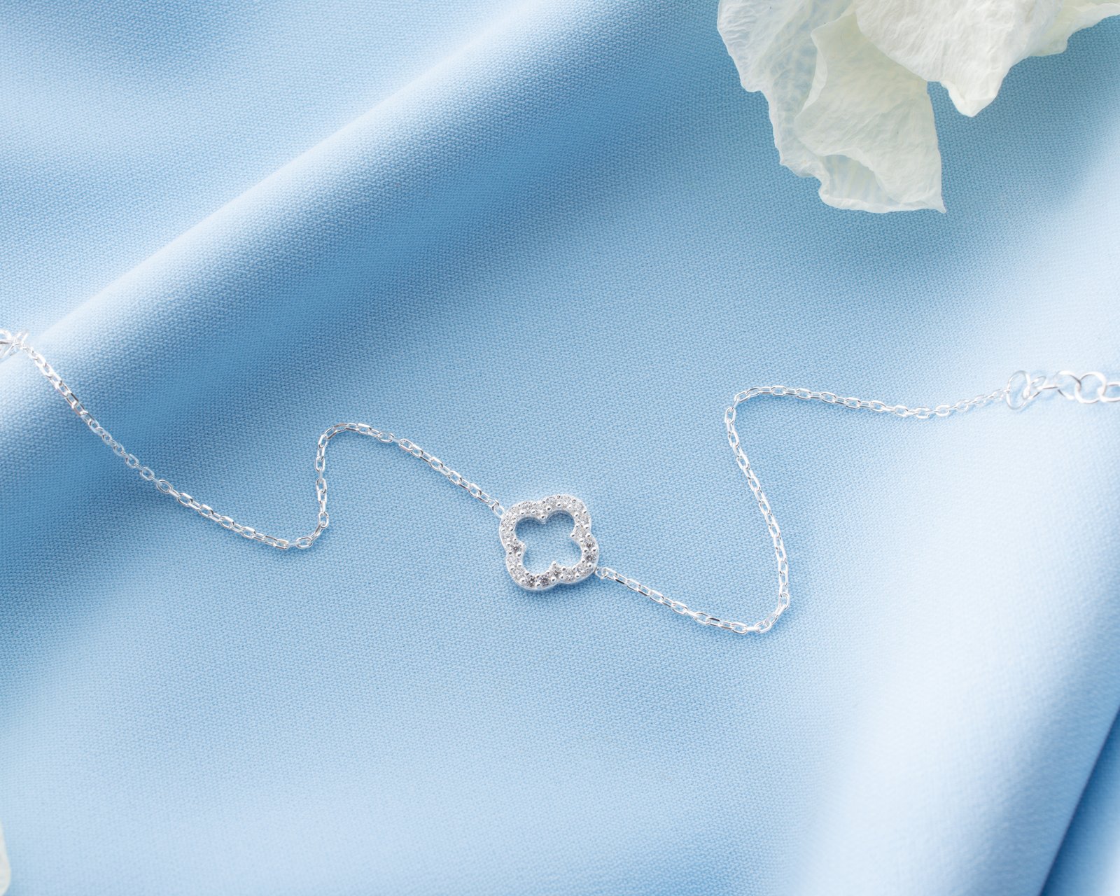 This elegant silver bracelet features a crystal-studded clover motif symbolizing luck and positivity. Designed with a delicate minimalist chain, it adds sparkle without overwhelming the wrist. Perfect for daily wear or layering with other bracelets, offering a timeless and refined look for modern women.
