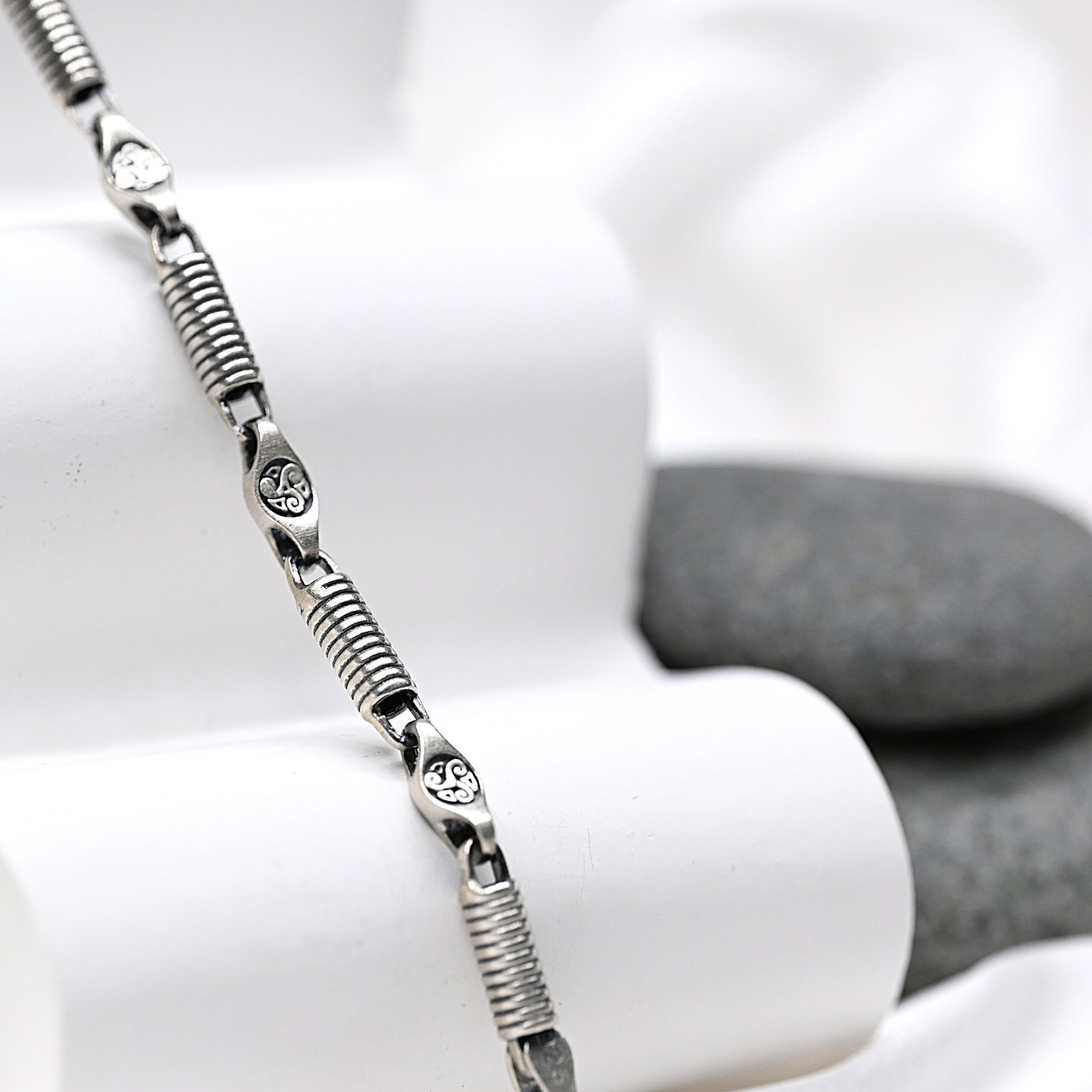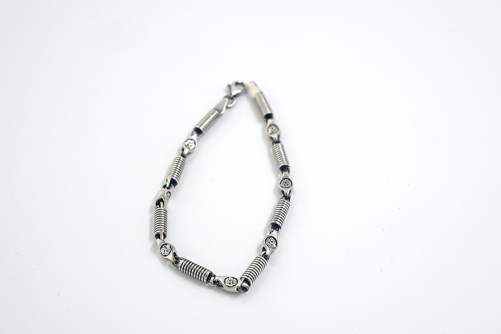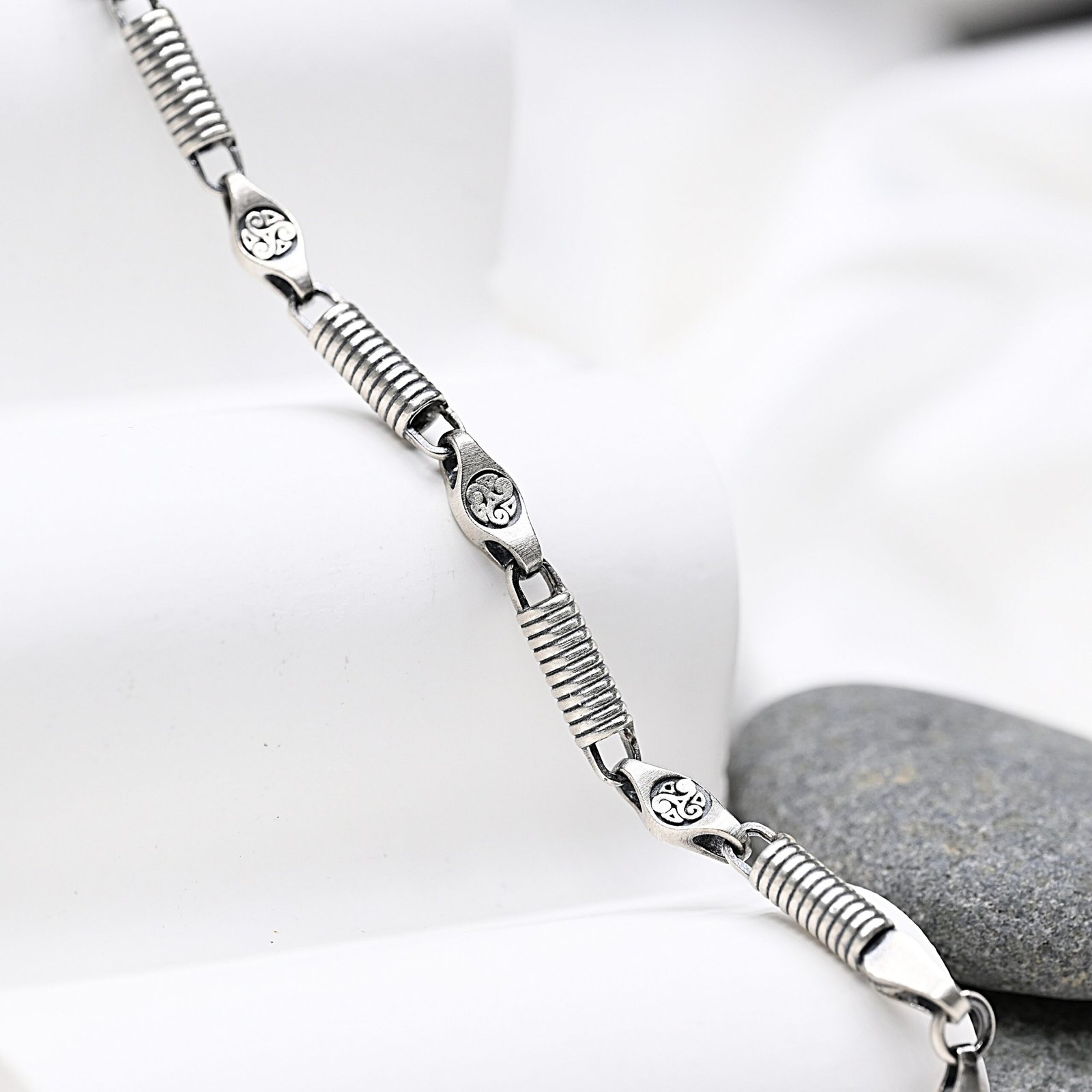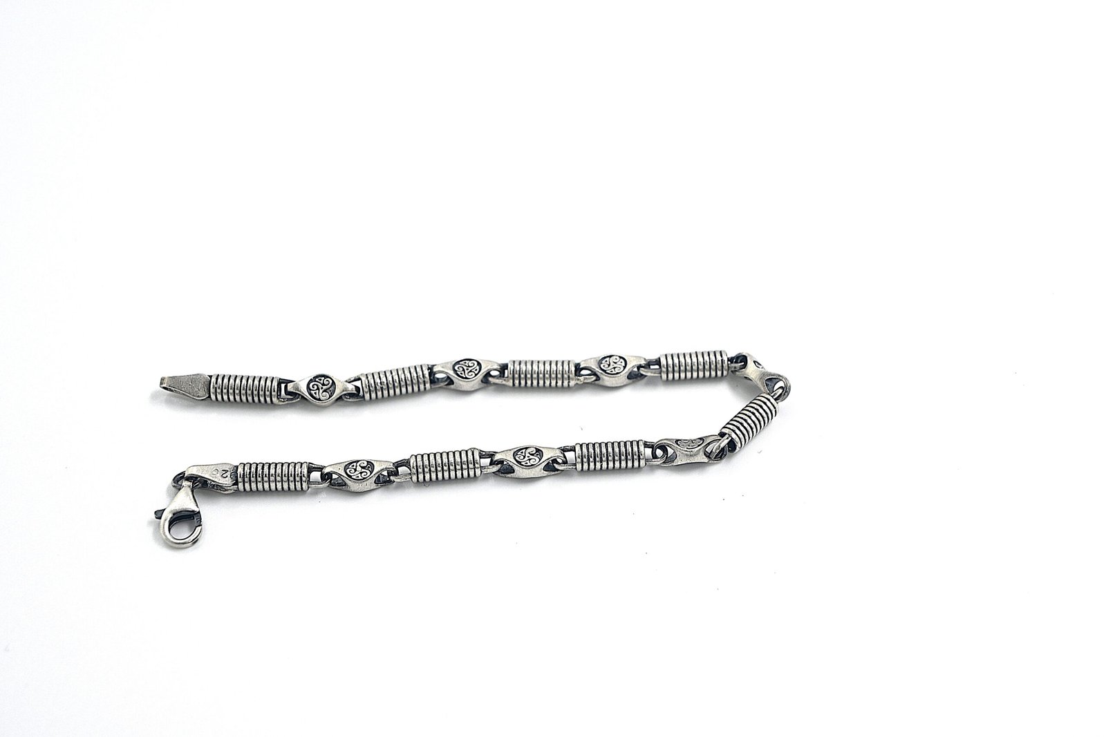 This bracelet combines spiral coil engraved links with polished 925 silver craftsmanship. Each segment has fine patterns that create a dynamic, rugged look. Built for durability and comfort in daily use. A bold accessory with a strong masculine presence.