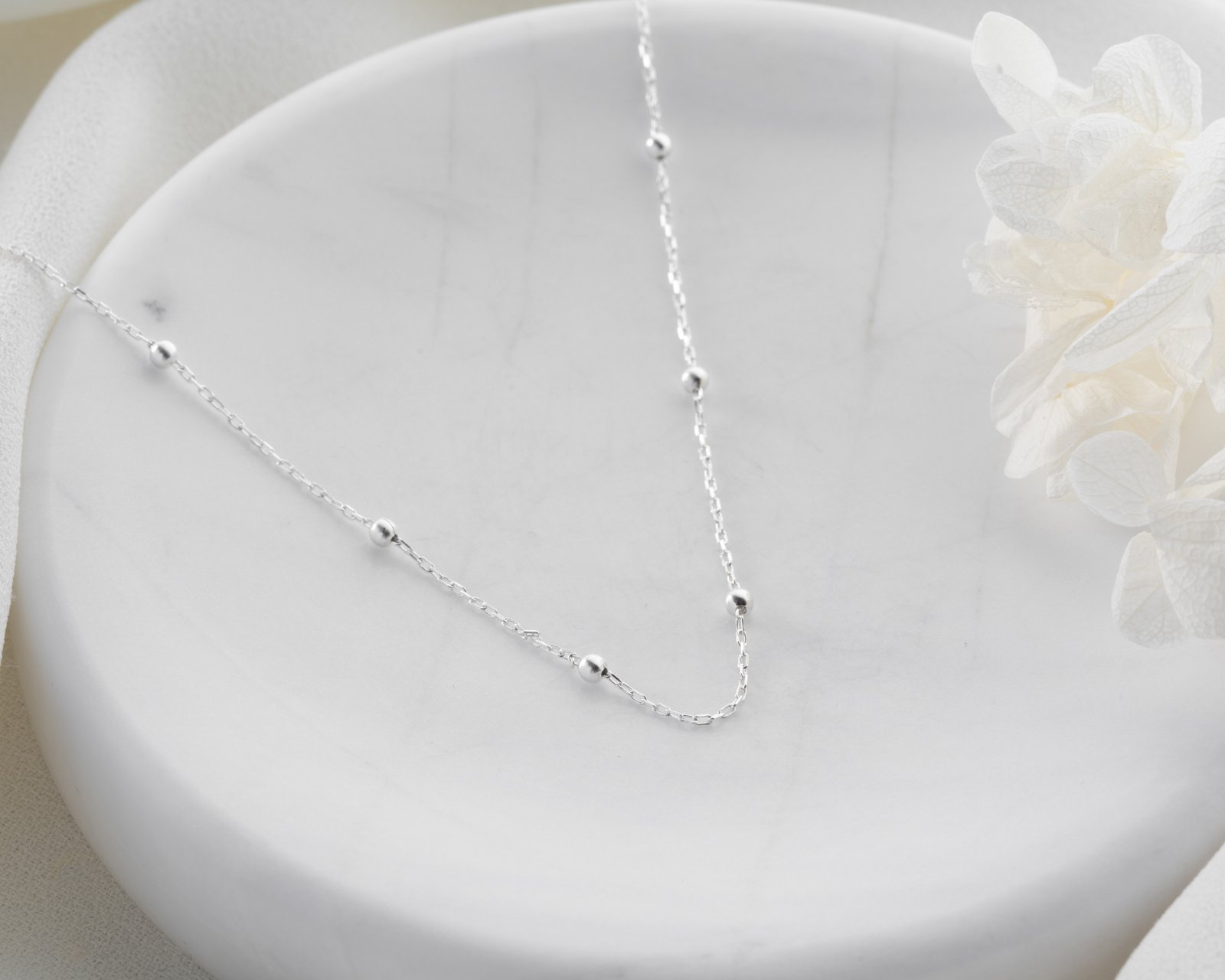 Sterling silver minimalist anklet with small bead accents.