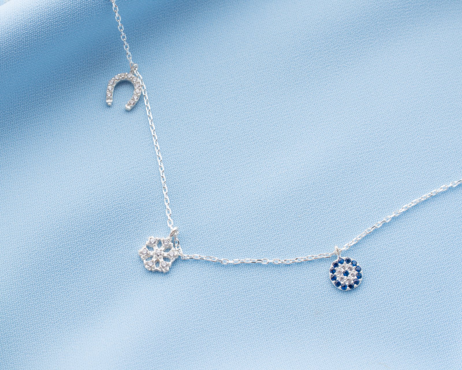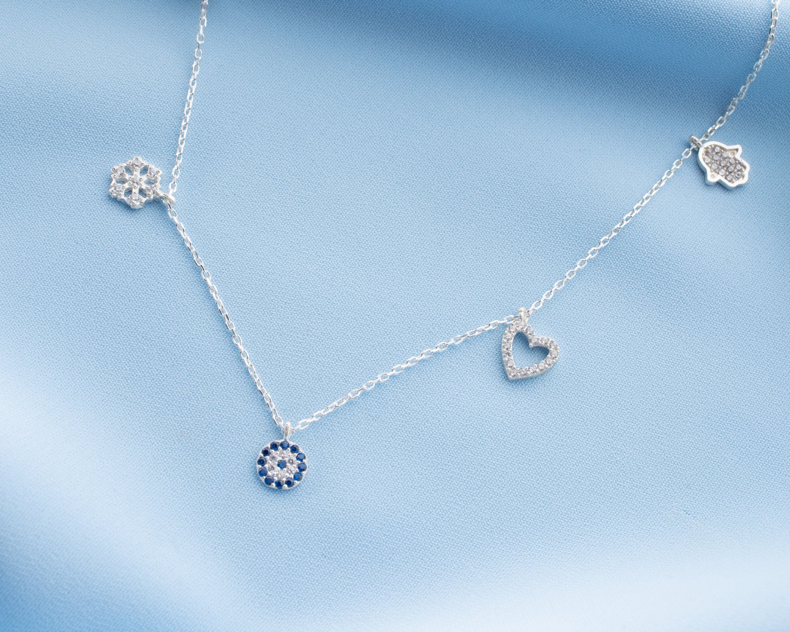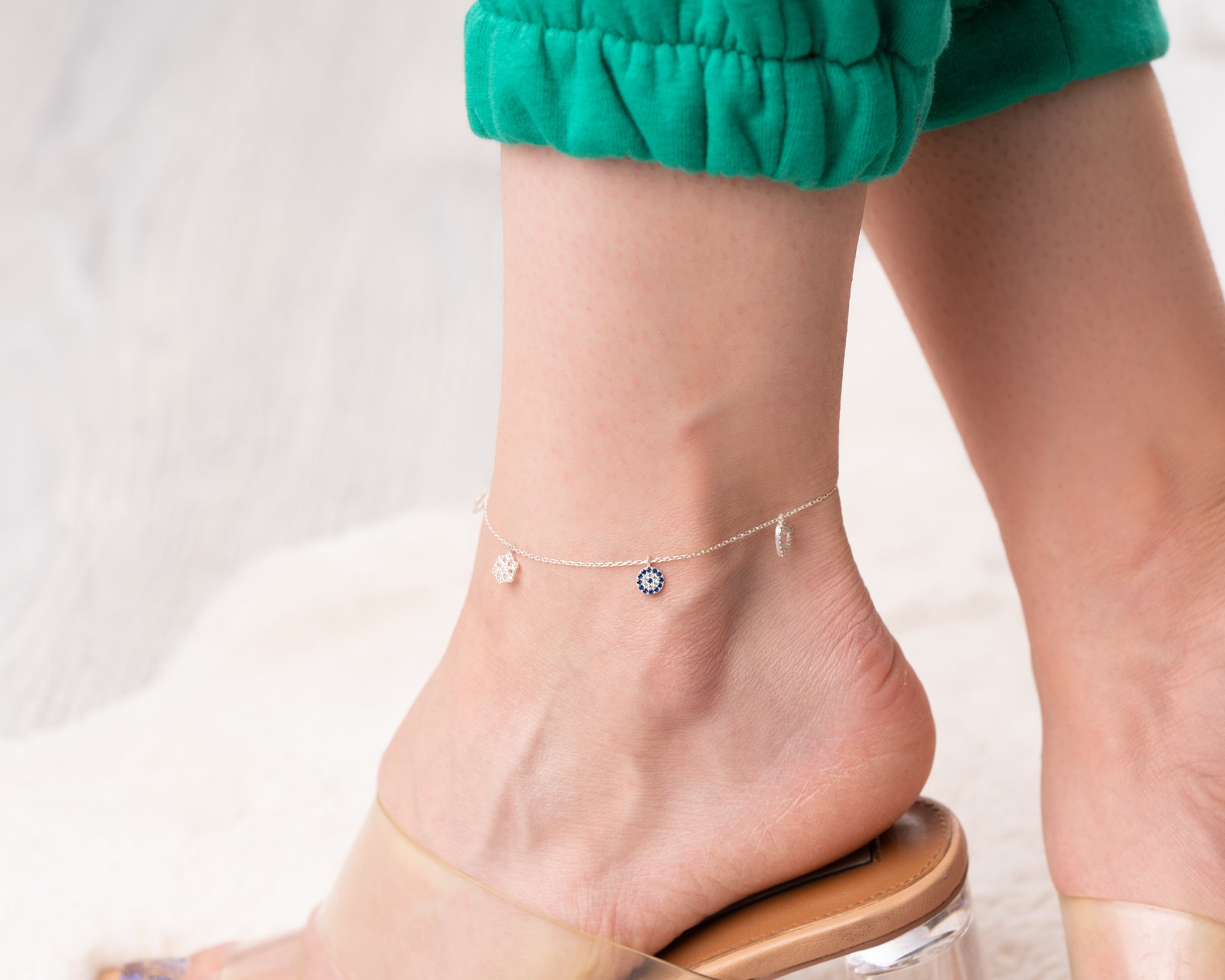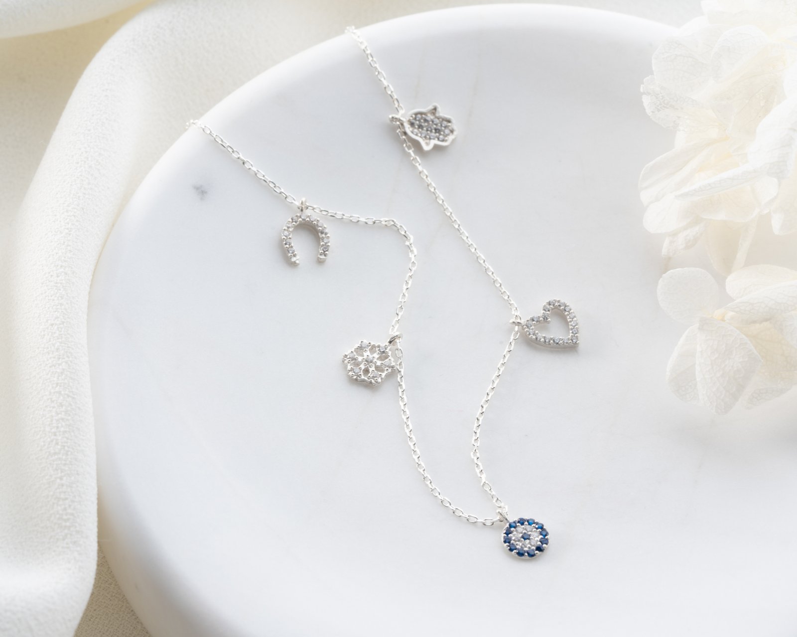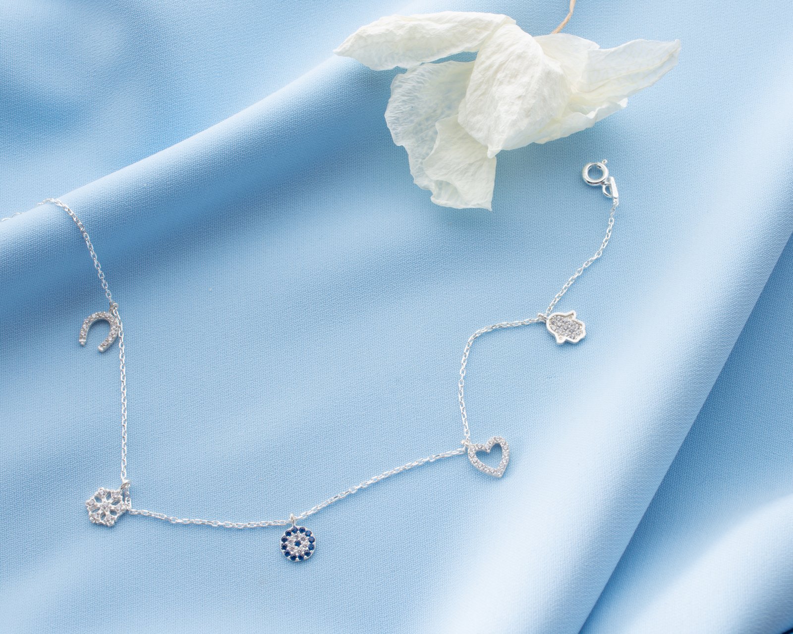 Add a touch of charm and symbolism to your style with this sterling silver anklet featuring multiple delicate pendants—heart, horseshoe, hamsa, floral motif, and a blue evil eye charm. Each symbol represents protection, love, luck, and positivity, creating a beautifully meaningful accessory perfect for daily wear or layered summer looks. Lightweight, sparkling, and refined, this anklet makes a thoughtful gift and a standout addition to any jewelry collection.